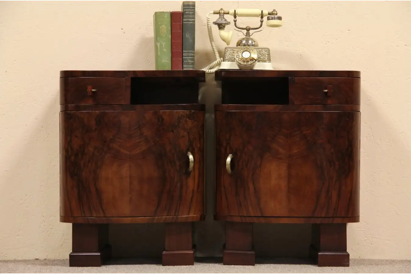 This magnificent authentic Art Deco pair of nightstands or bedside tables was carved in Italy about 1925. The matched walnut "oyster" burl is beautiful.