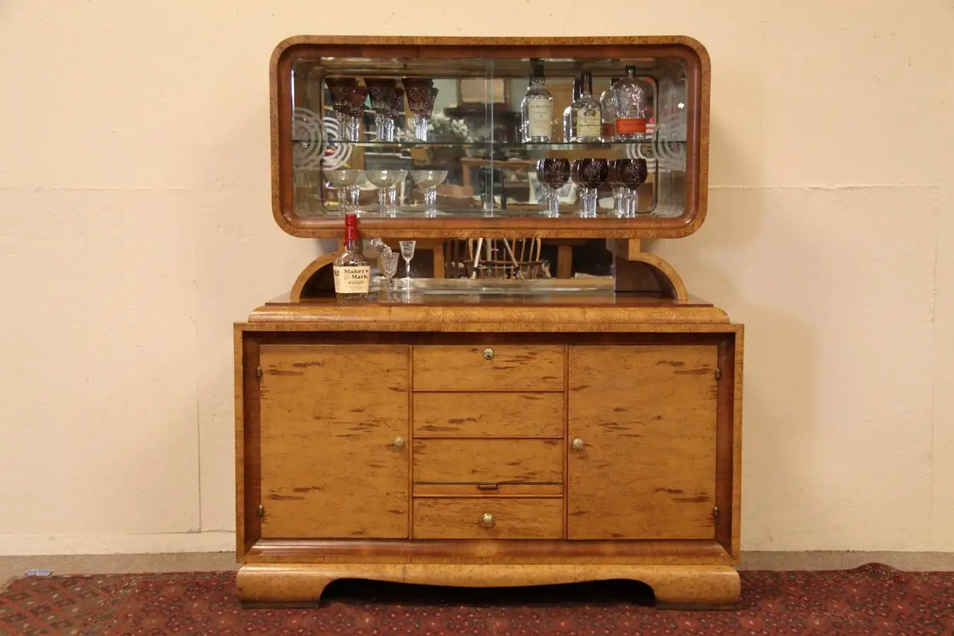 Authentic Art Deco period furniture from the 1930's, this sleek and streamlined china, bar or wine cabinet is book-matched golden curly birch with inlaid mahogany banding.