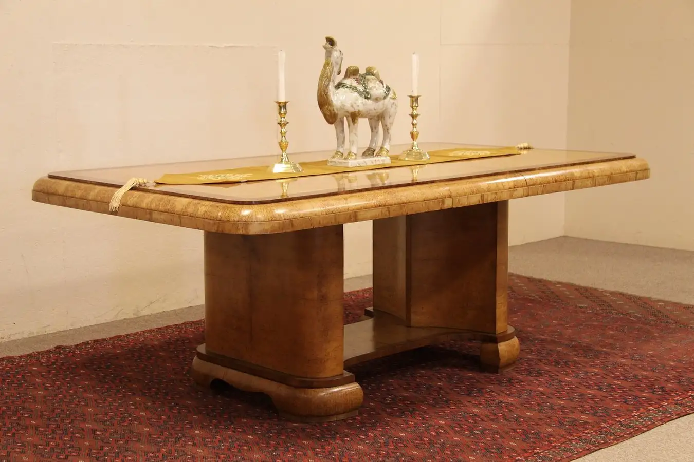 Authentic Art Deco period furniture from the 1930's, this sleek and streamlined library or dining table is book-matched golden curly birch with inlaid mahogany banding.