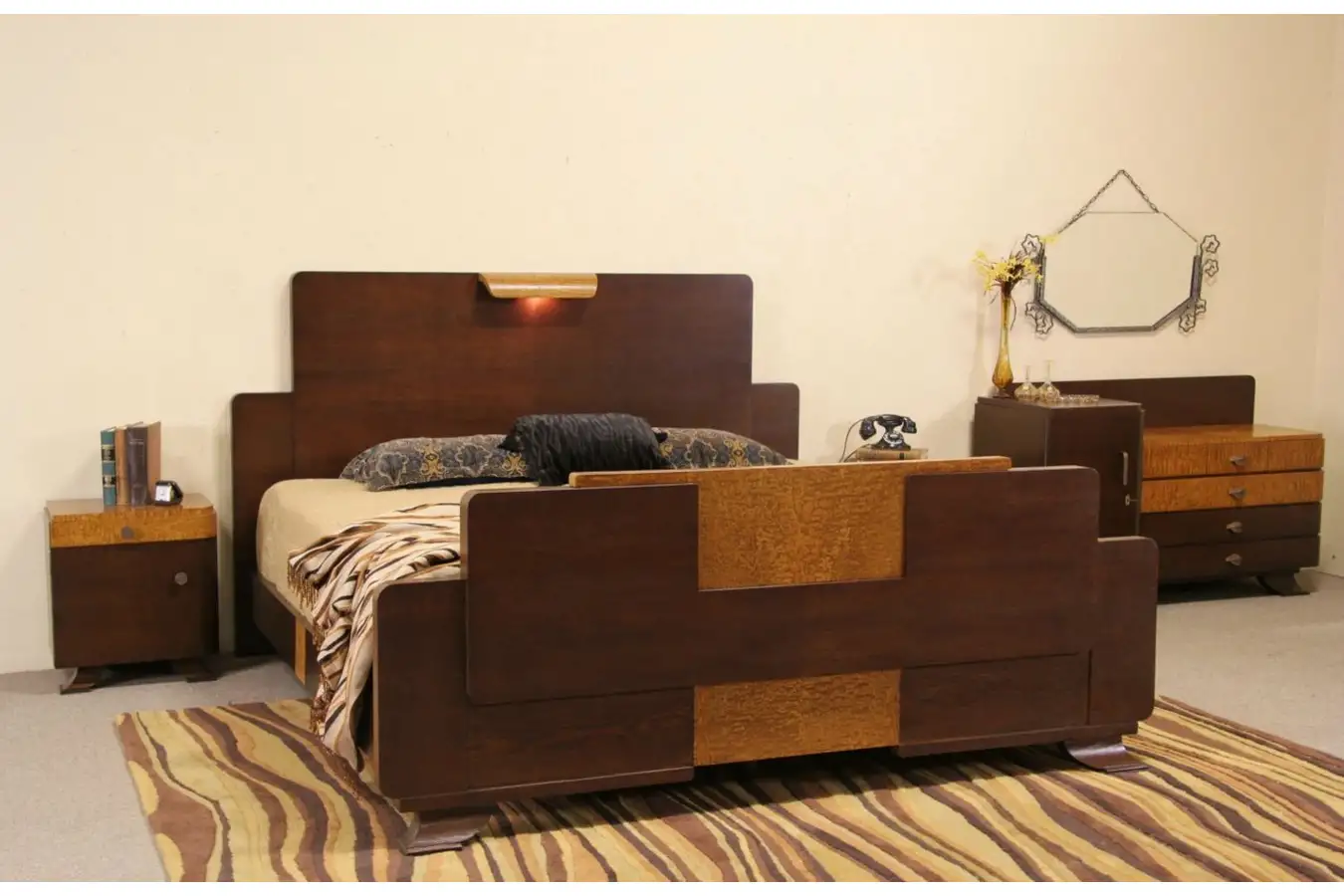 A sleek and spectacular French Art Deco bedroom set from about 1930 includes a king size bed, two nightstands and a chest or dresser. The satiny finish is in excellent condition, enhancing the contrasting grain of quarter sawn oak and golden curly ash burl. Quality is excellent on this European furniture, hardware is original and locks work.