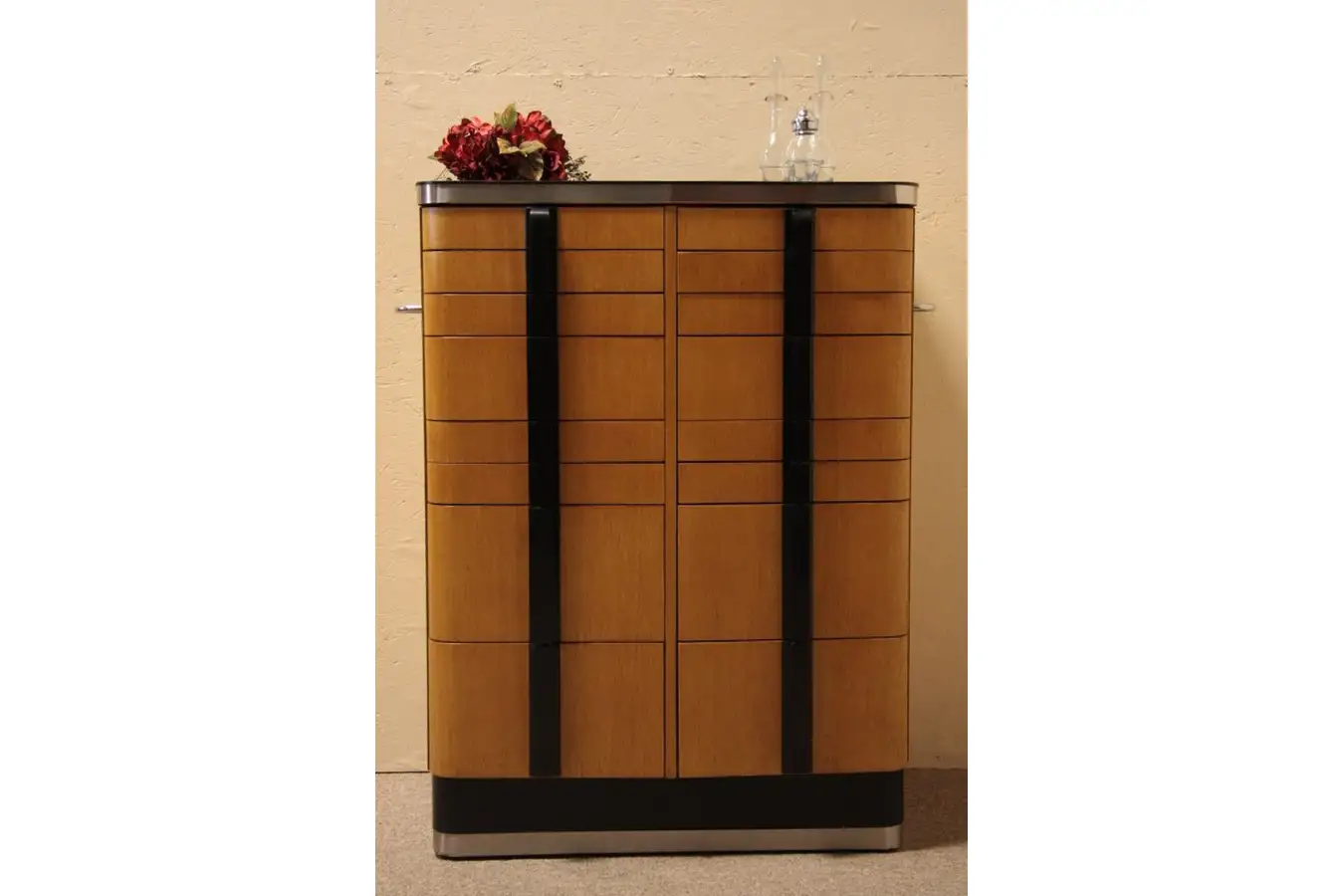 This Art Deco or Midcentury Modern dental cabinet has 16 drawers of various sizes. The curved front and sides are finished in sleek golden mahogany with chrome and black accents, the finish is very good.