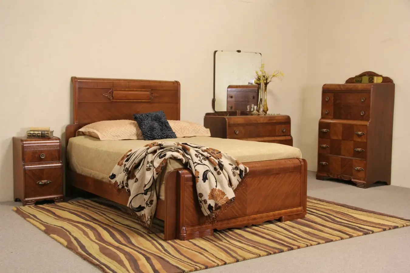 Authentic Art Deco "waterfall" design furniture from about 1915, this Queen size 4 piece bedroom set is shimmering satinwood, accented with inlaid zebra wood, maple and burl.