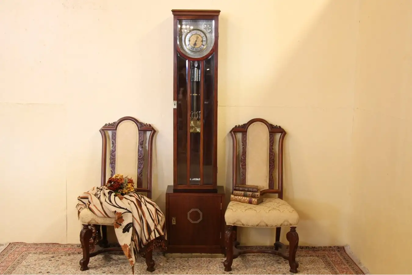 The 8 day brass movement has been cleaned and oiled and runs perfectly, the winding crank is original. An unusual strike is once at the quarter hour, twice at the half, three times at the 3/4 hour and 4 times on the hour, followed by a chime counting the hours. Size of this elegant furniture is 19" wide, 12" deep and 6'6" tall.