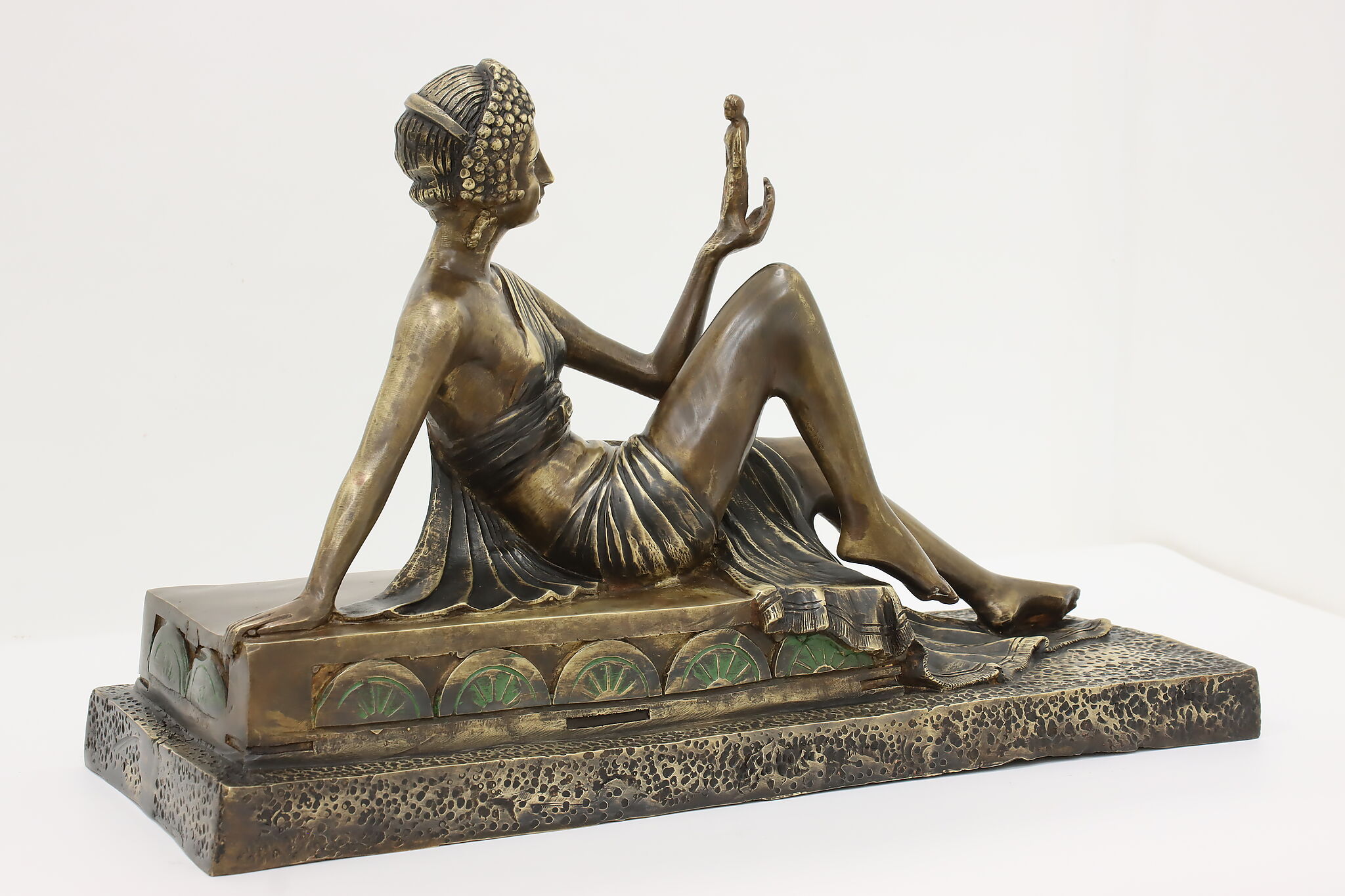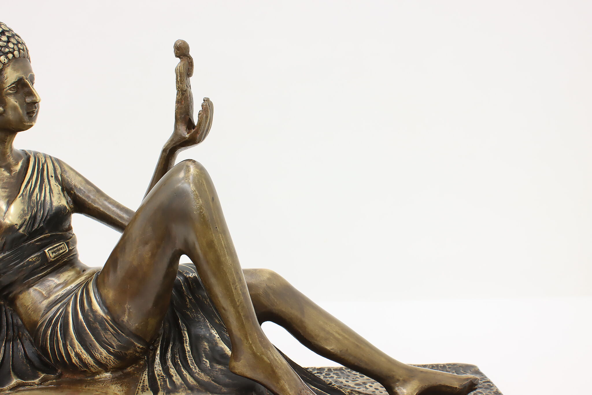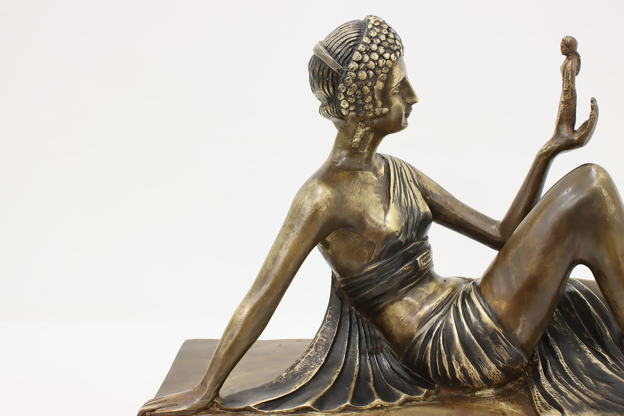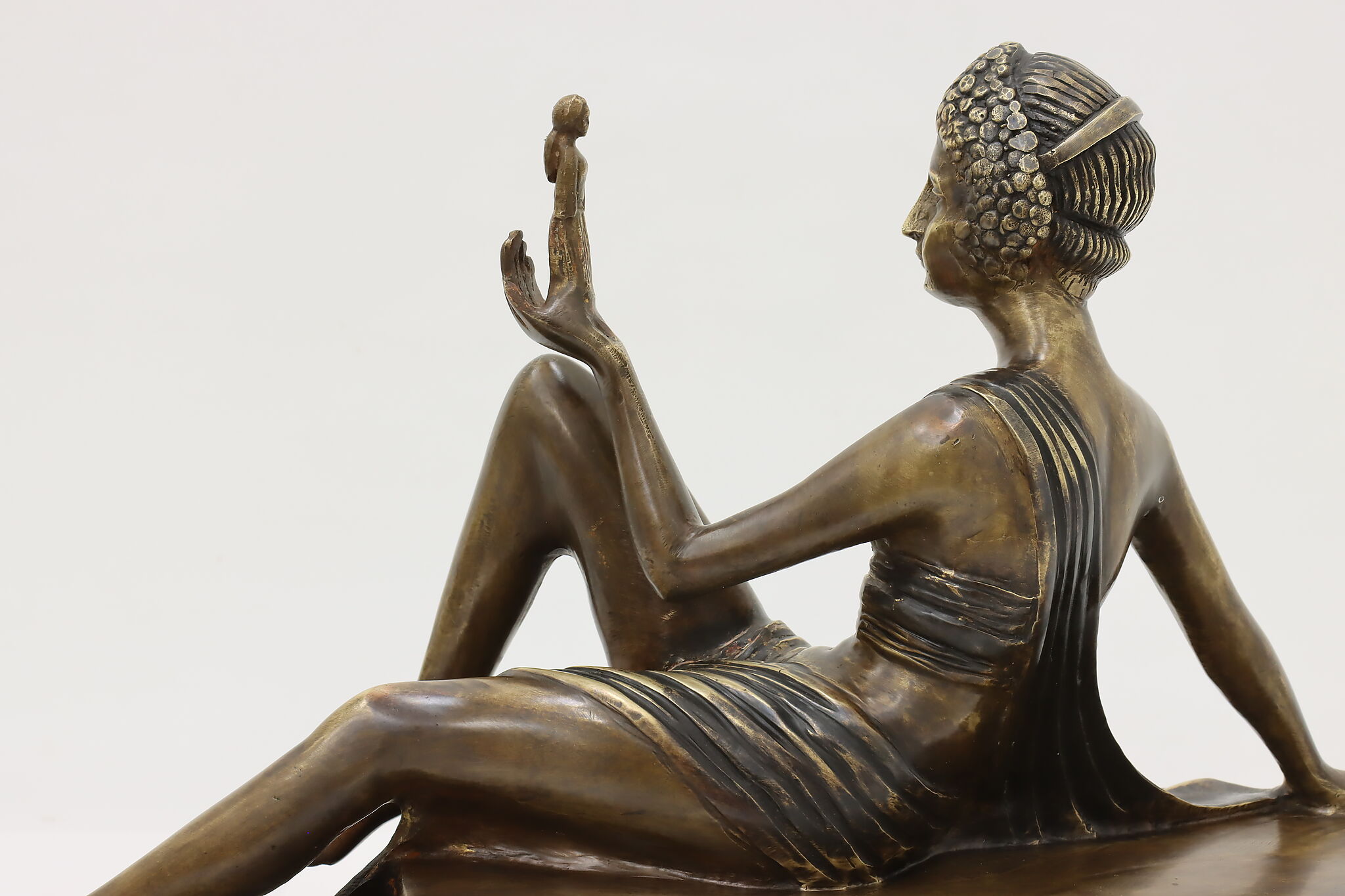 A darling sculpture in the Art Deco style depicts a reclining goddess holding a mortal woman in her hand.