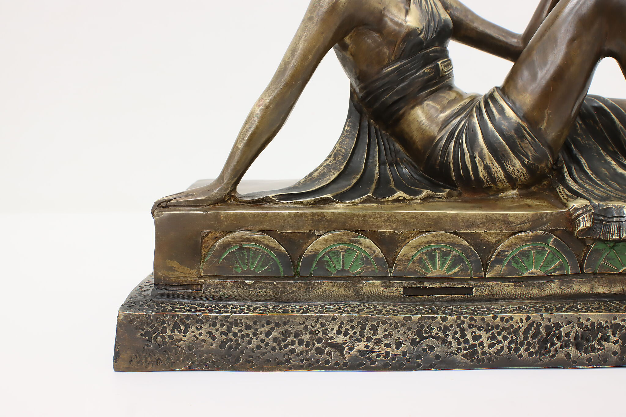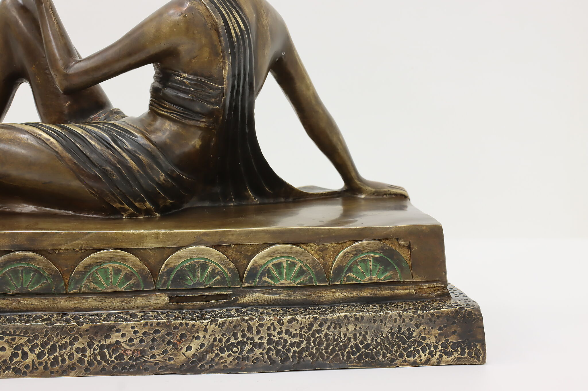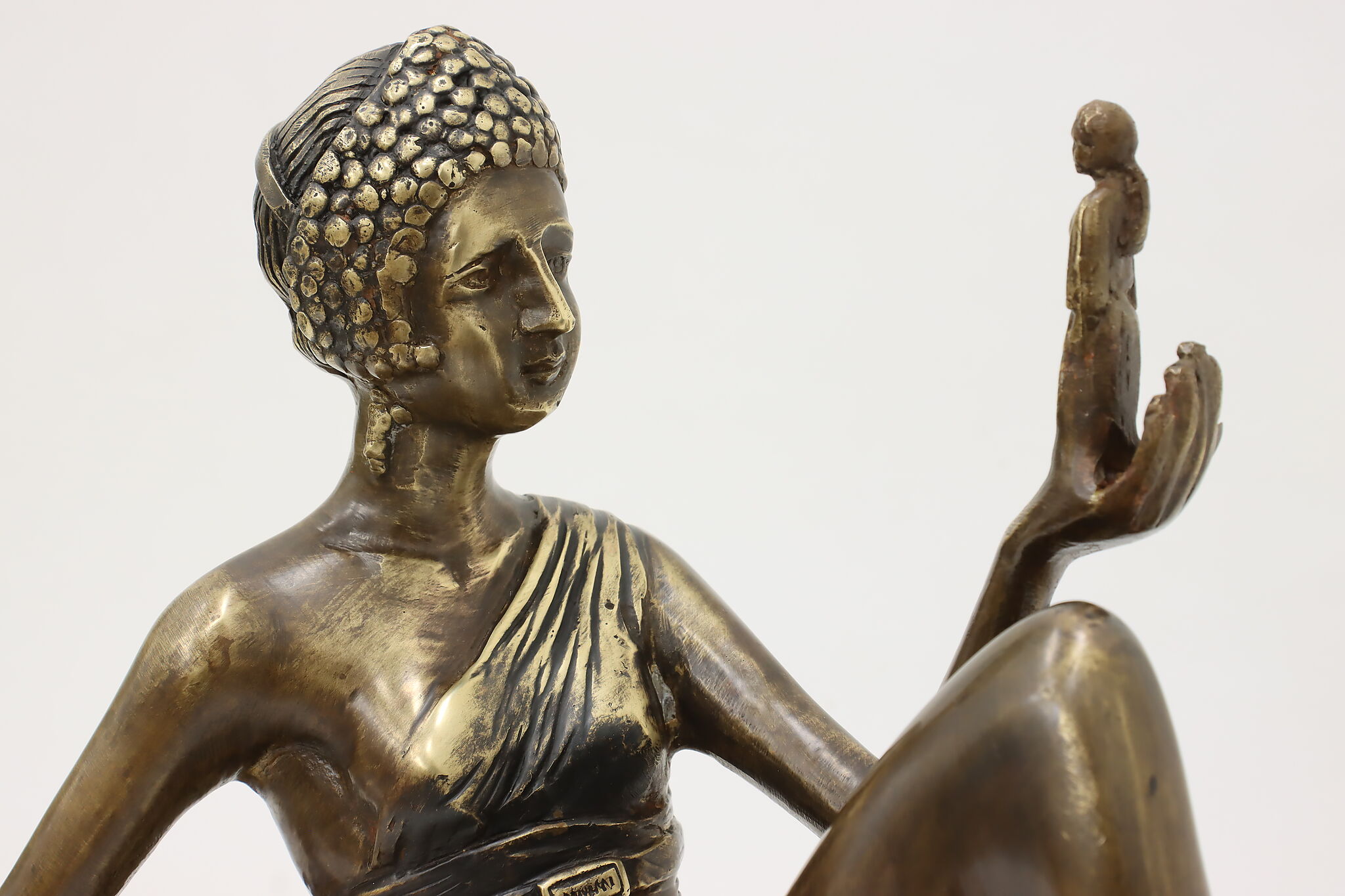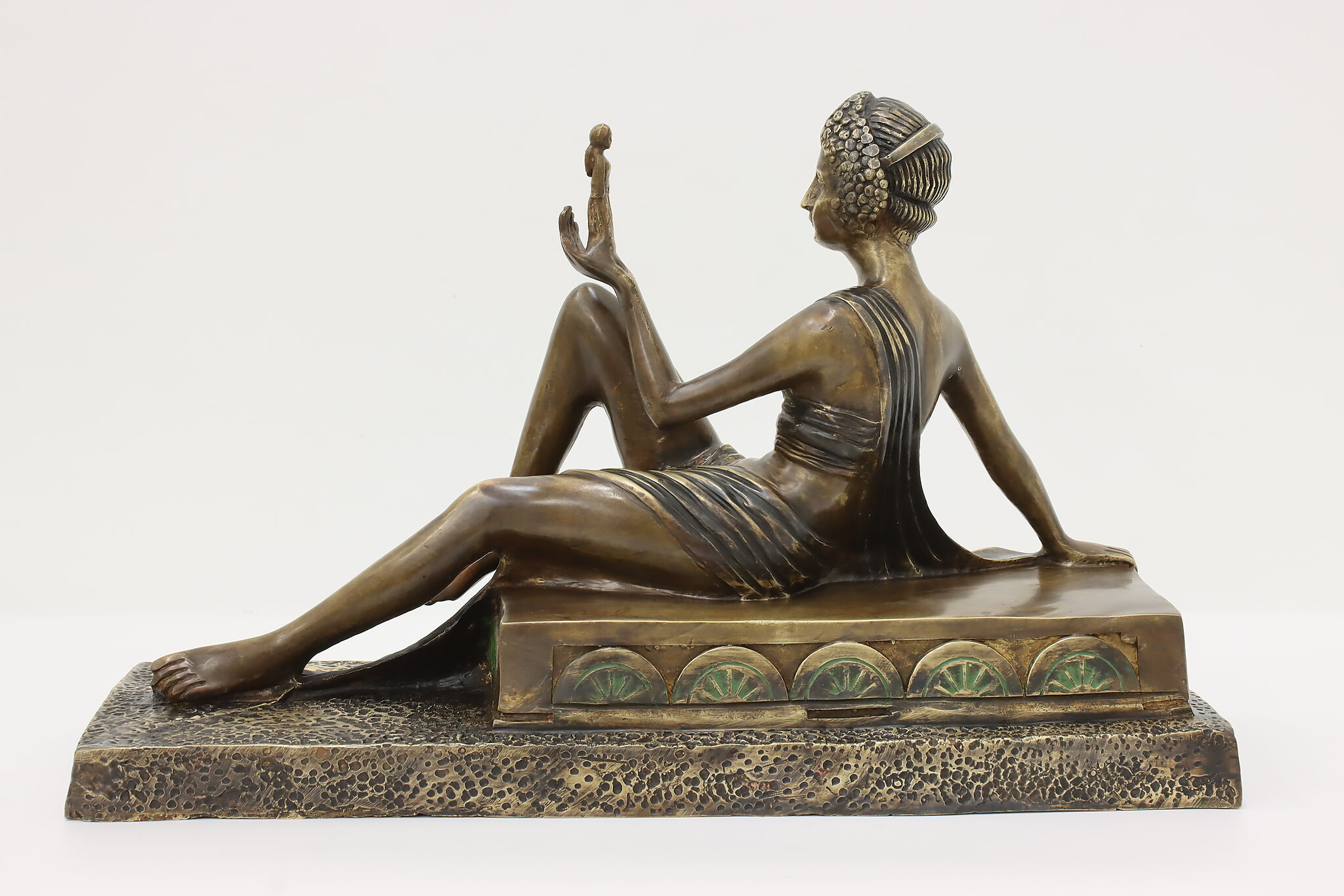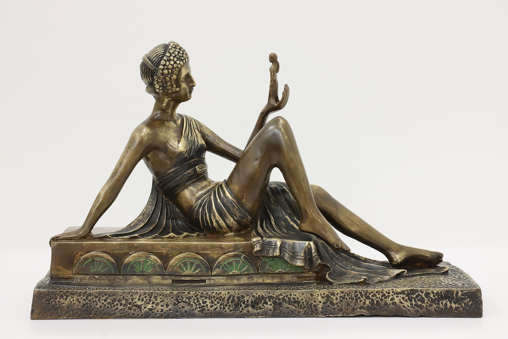 A darling sculpture in the Art Deco style depicts a reclining goddess holding a mortal woman in her hand.