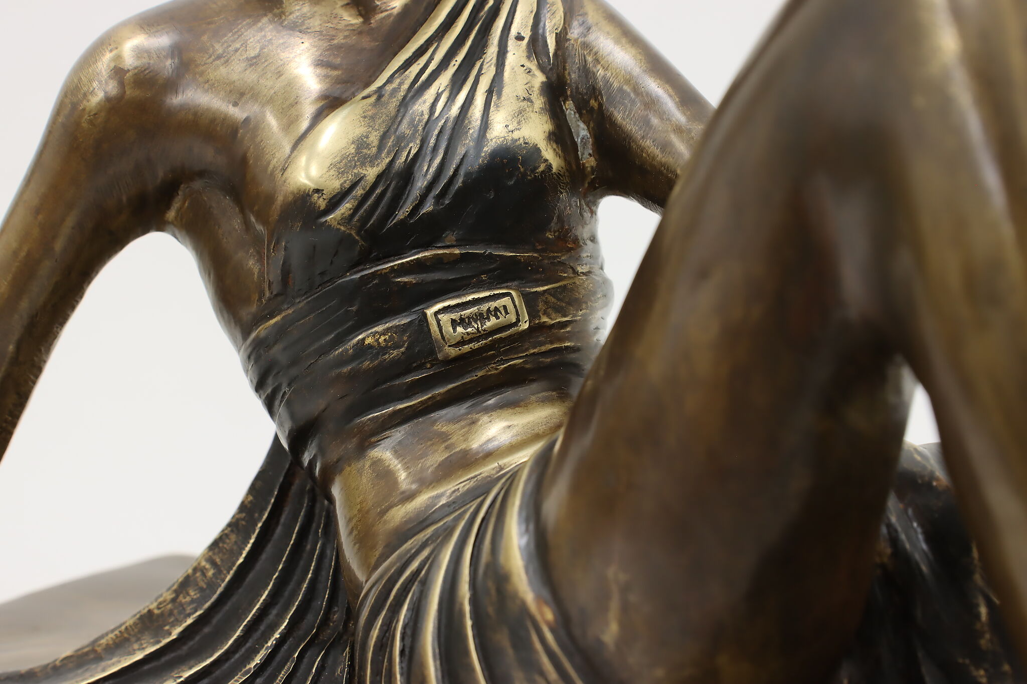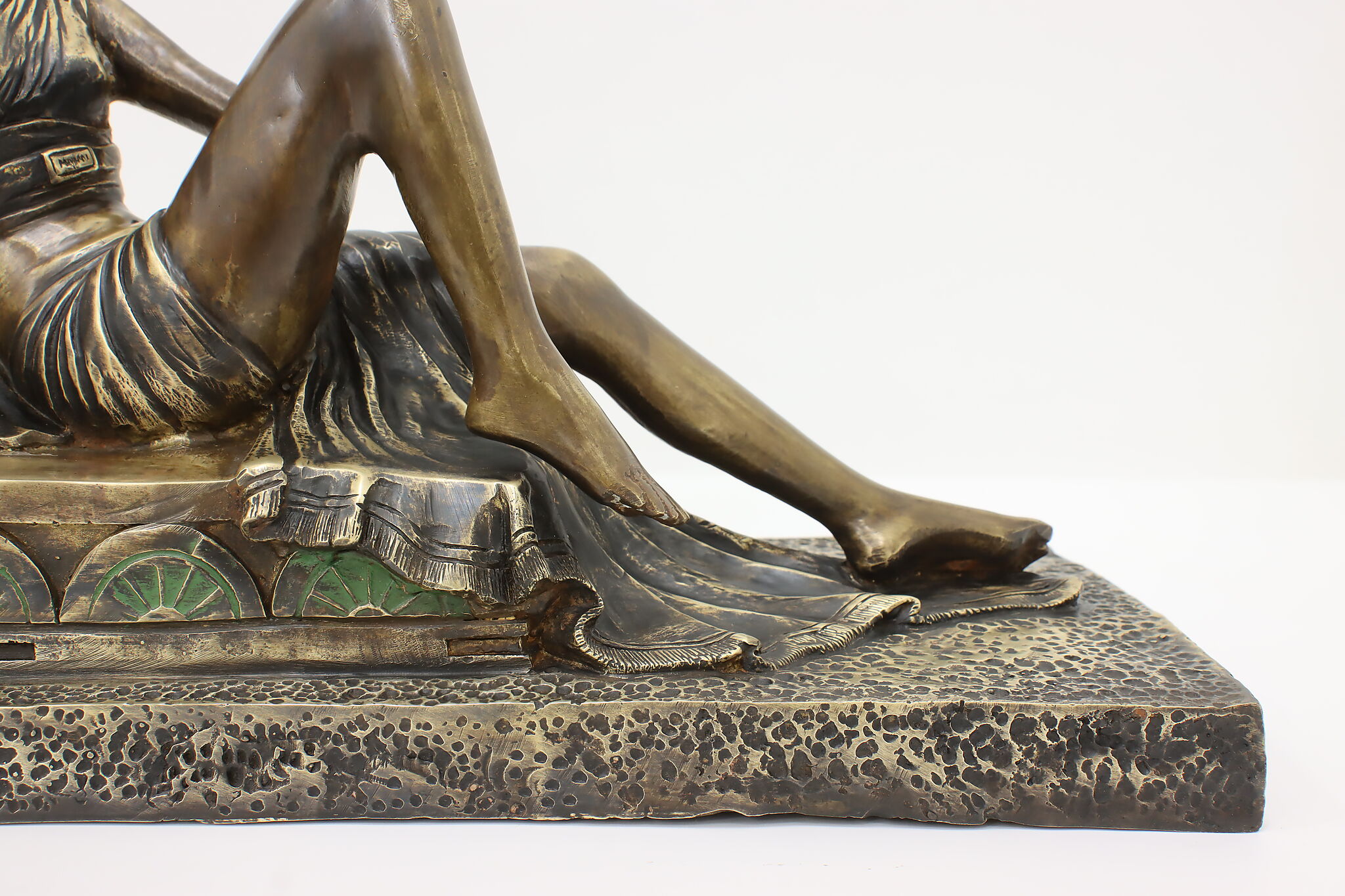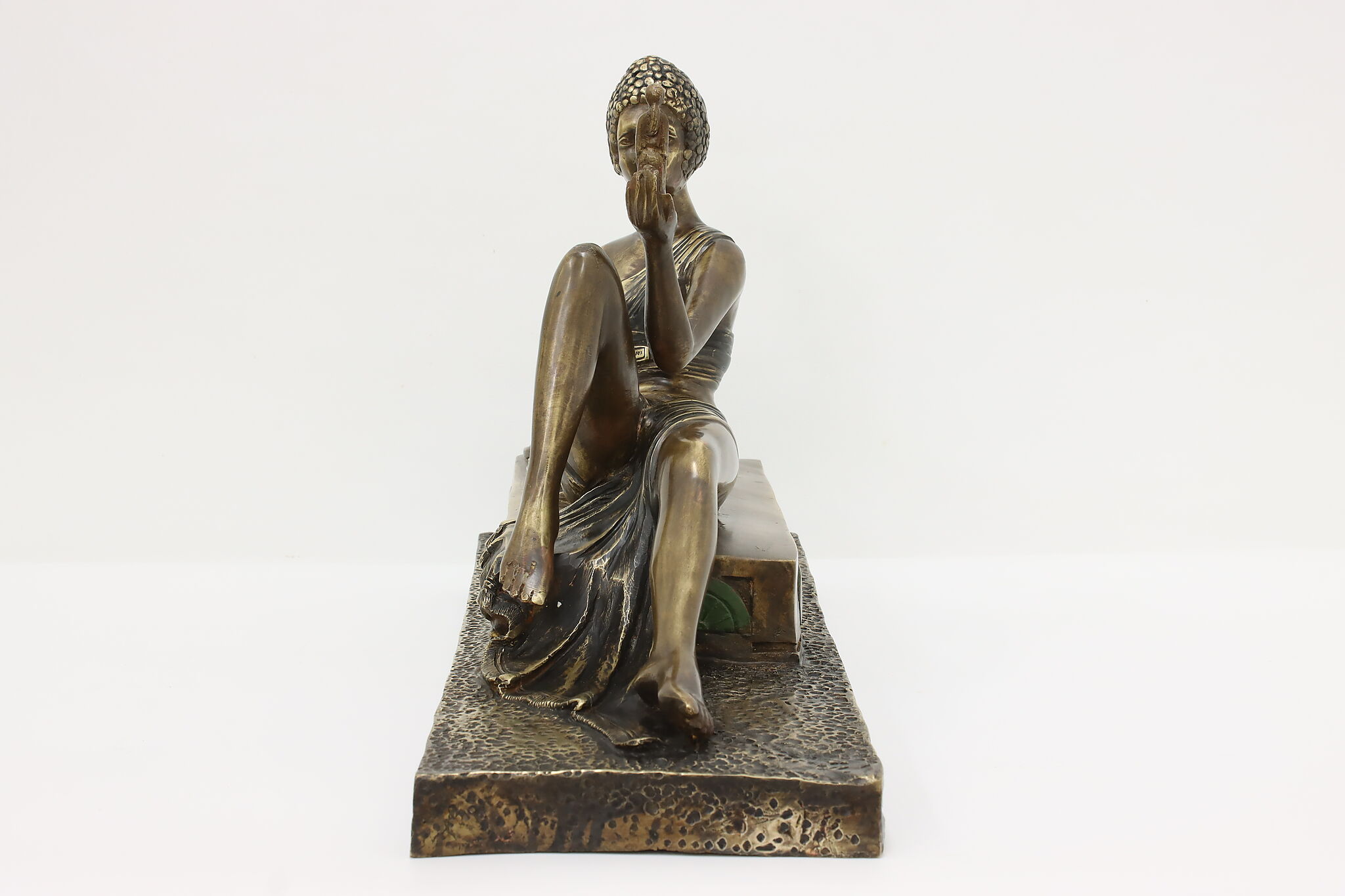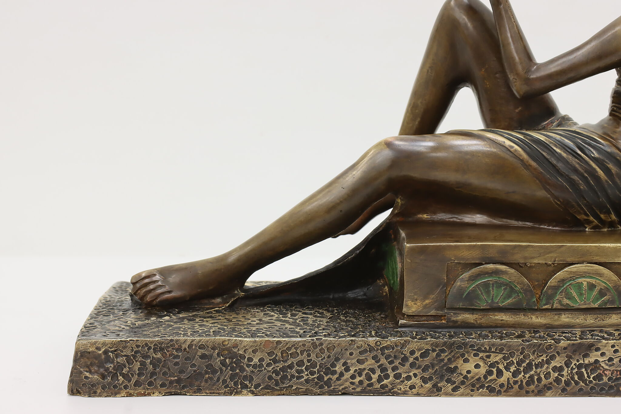 A darling sculpture in the Art Deco style depicts a reclining goddess holding a mortal woman in her hand.