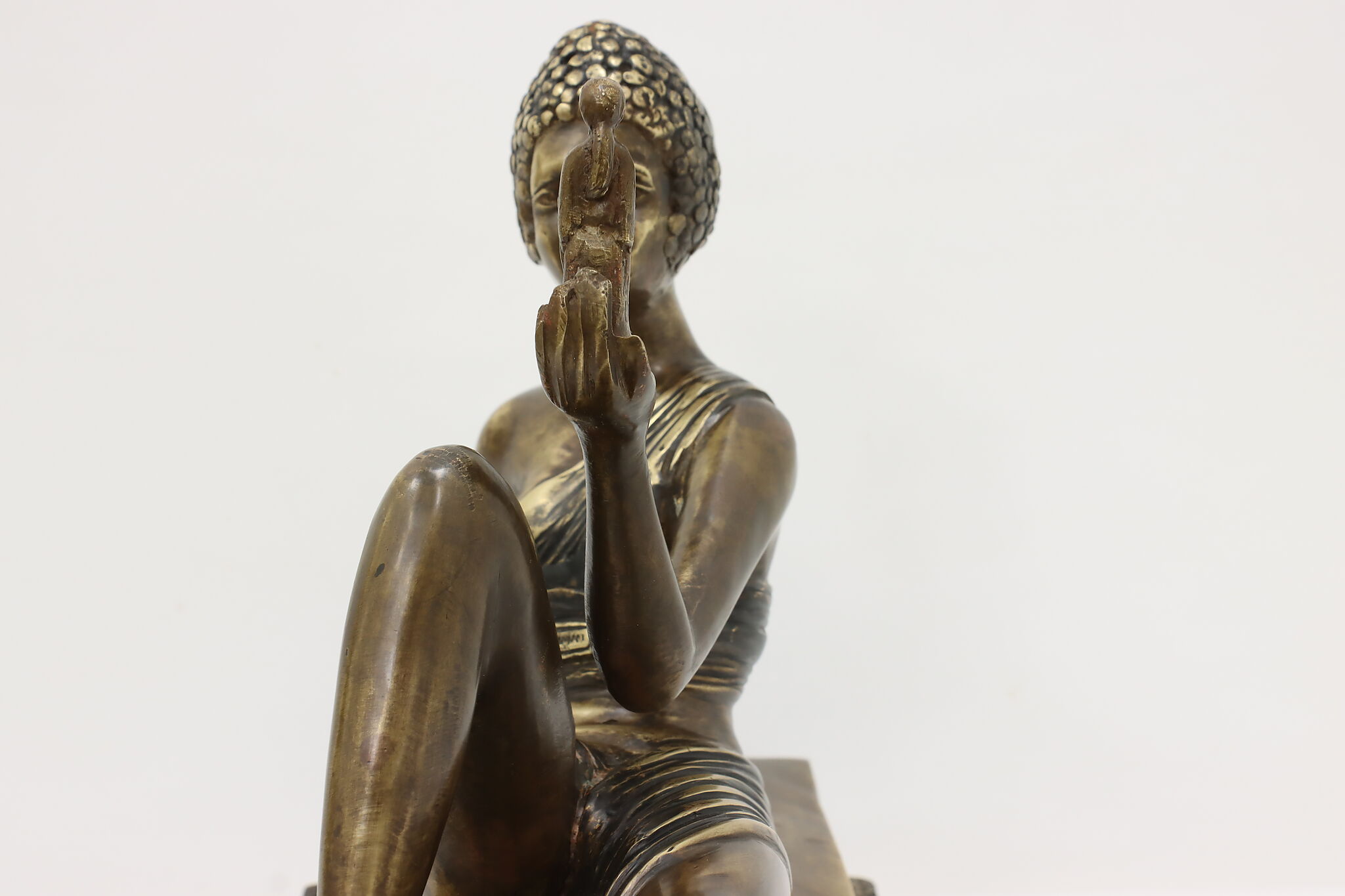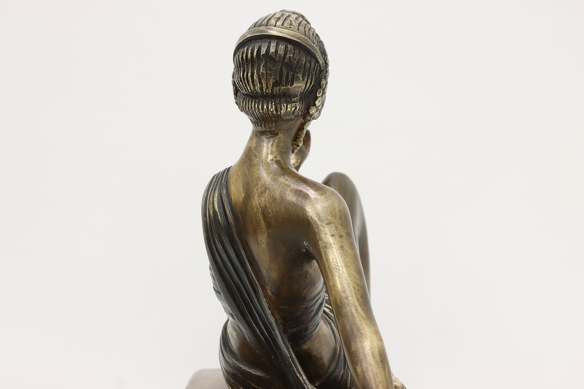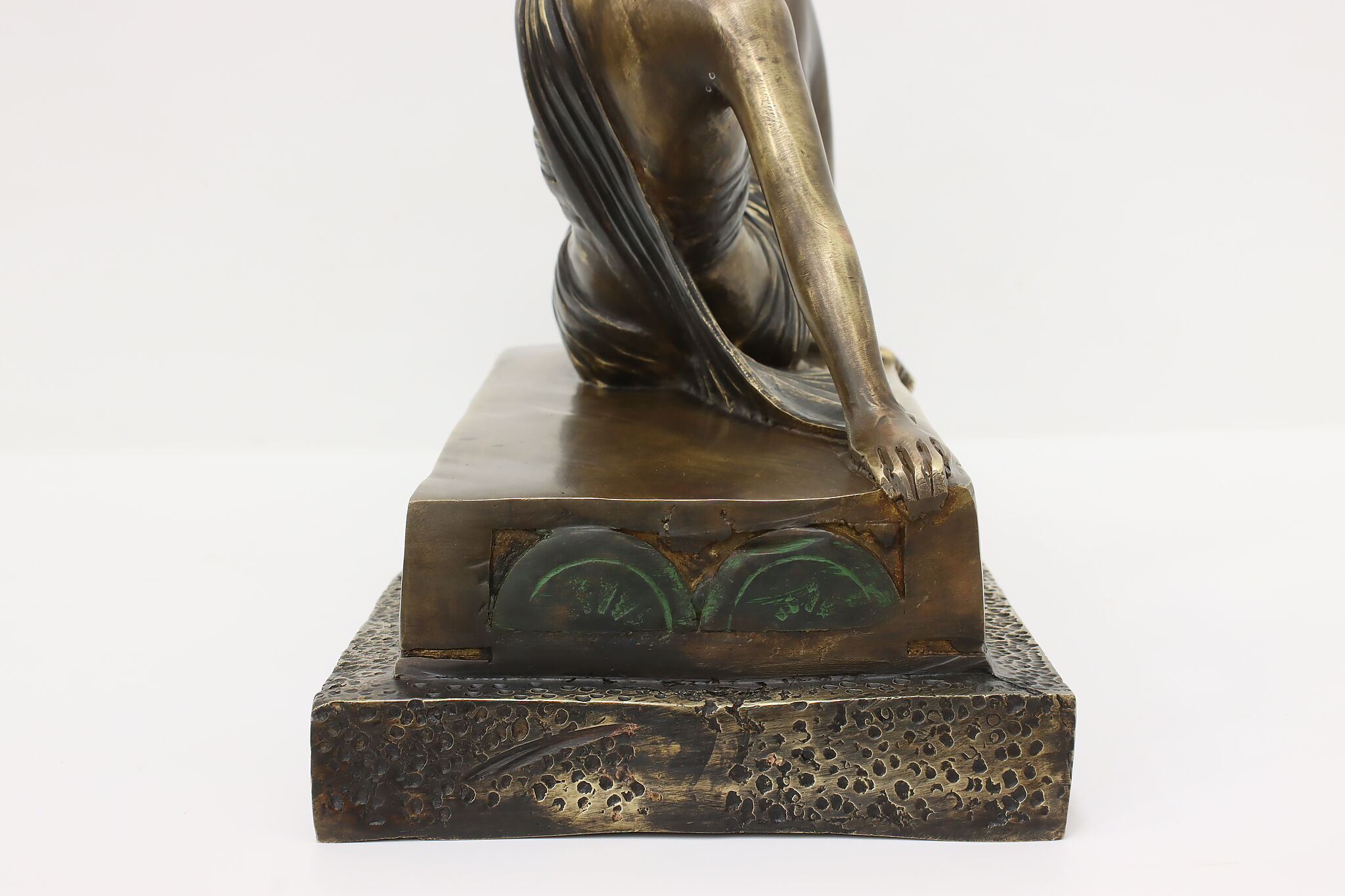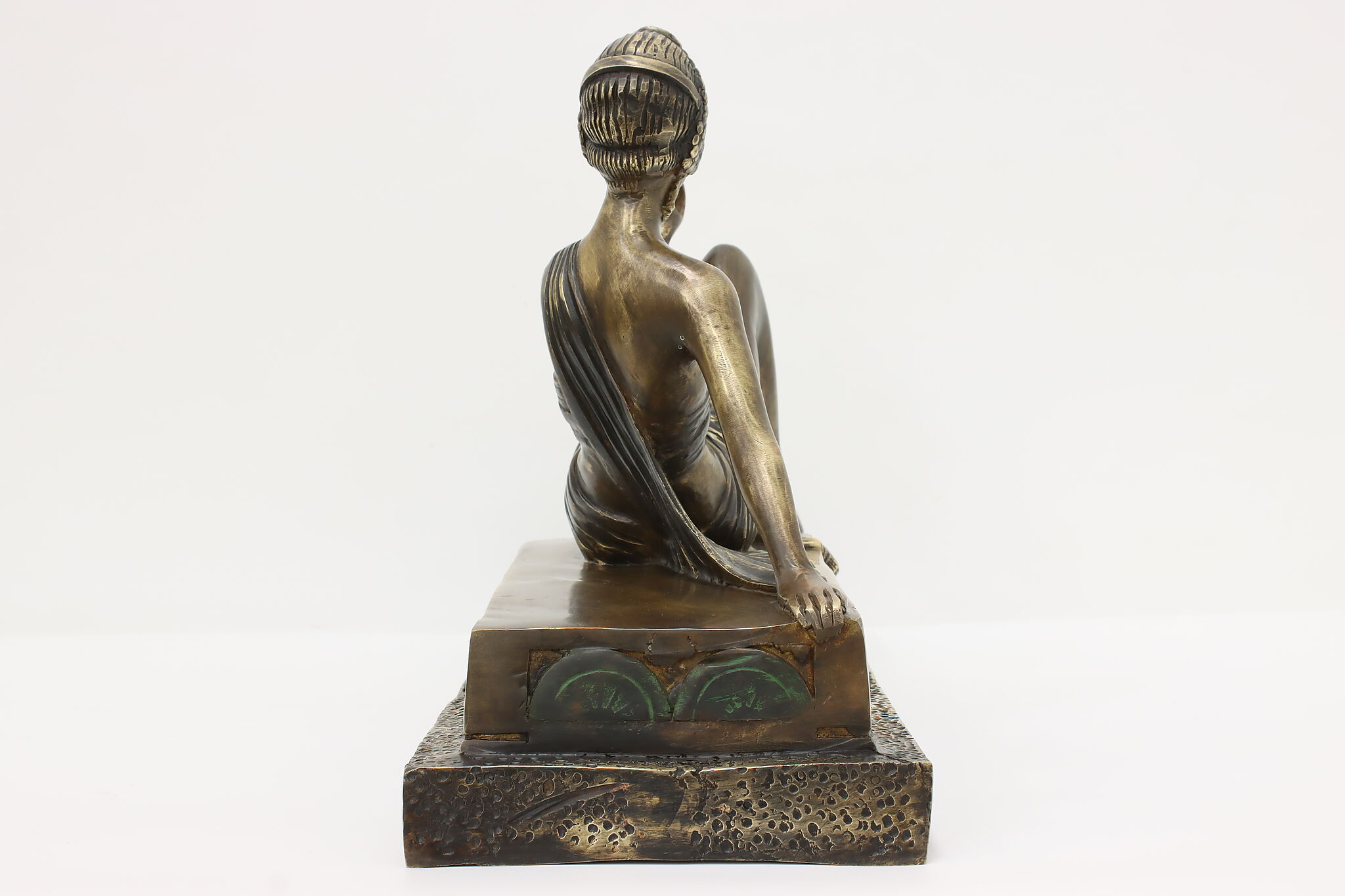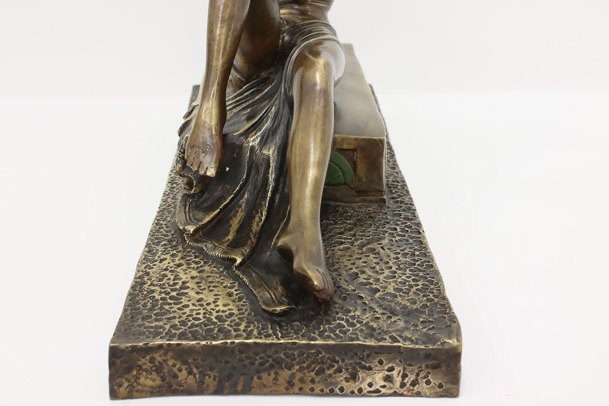 A darling sculpture in the Art Deco style depicts a reclining goddess holding a mortal woman in her hand.