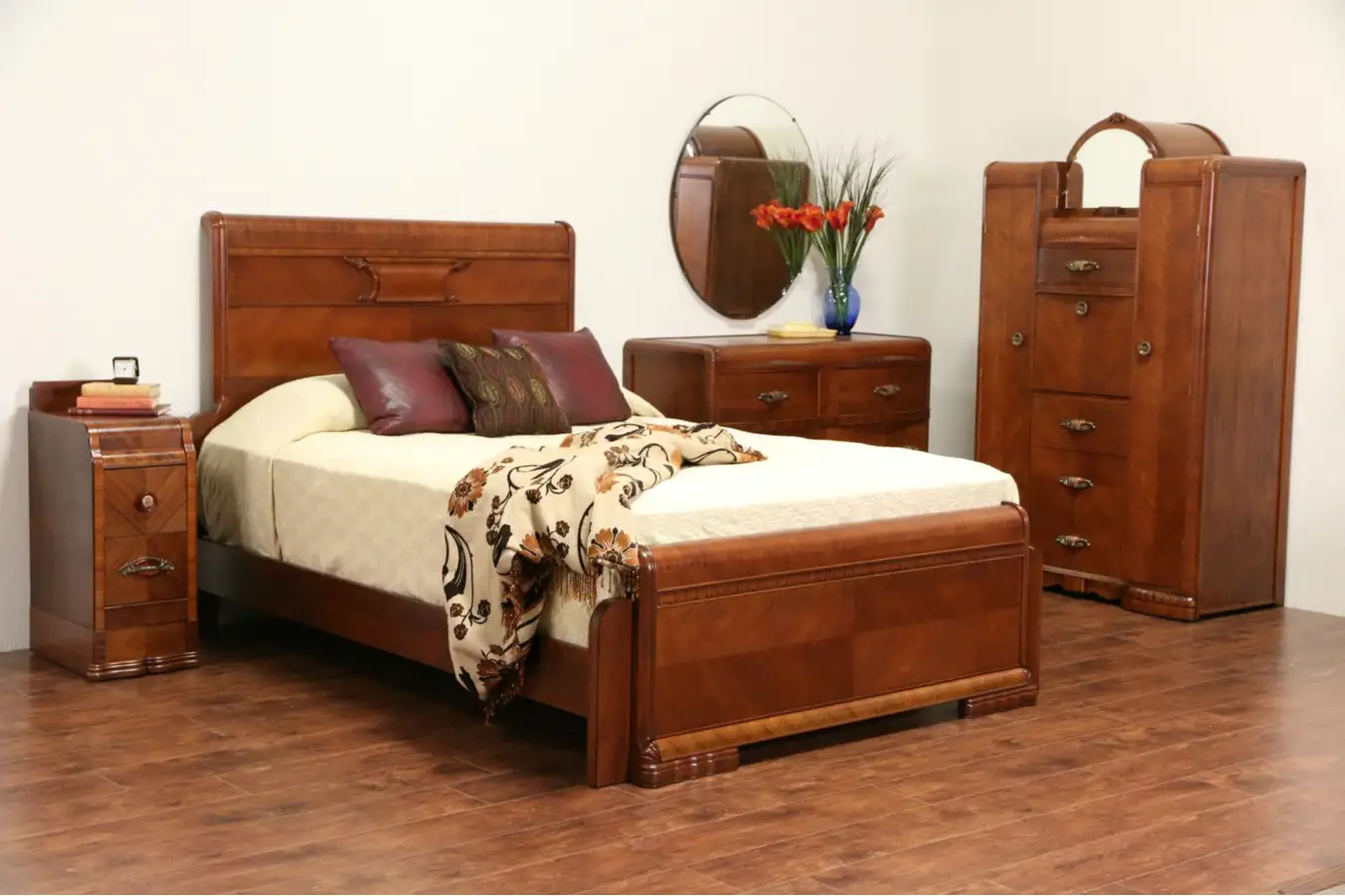 An Art Deco period late 1930's "waterfall" design bedroom set includes a queen size bed, dresser, wall mirror and chifferobe with cedar lined closets.