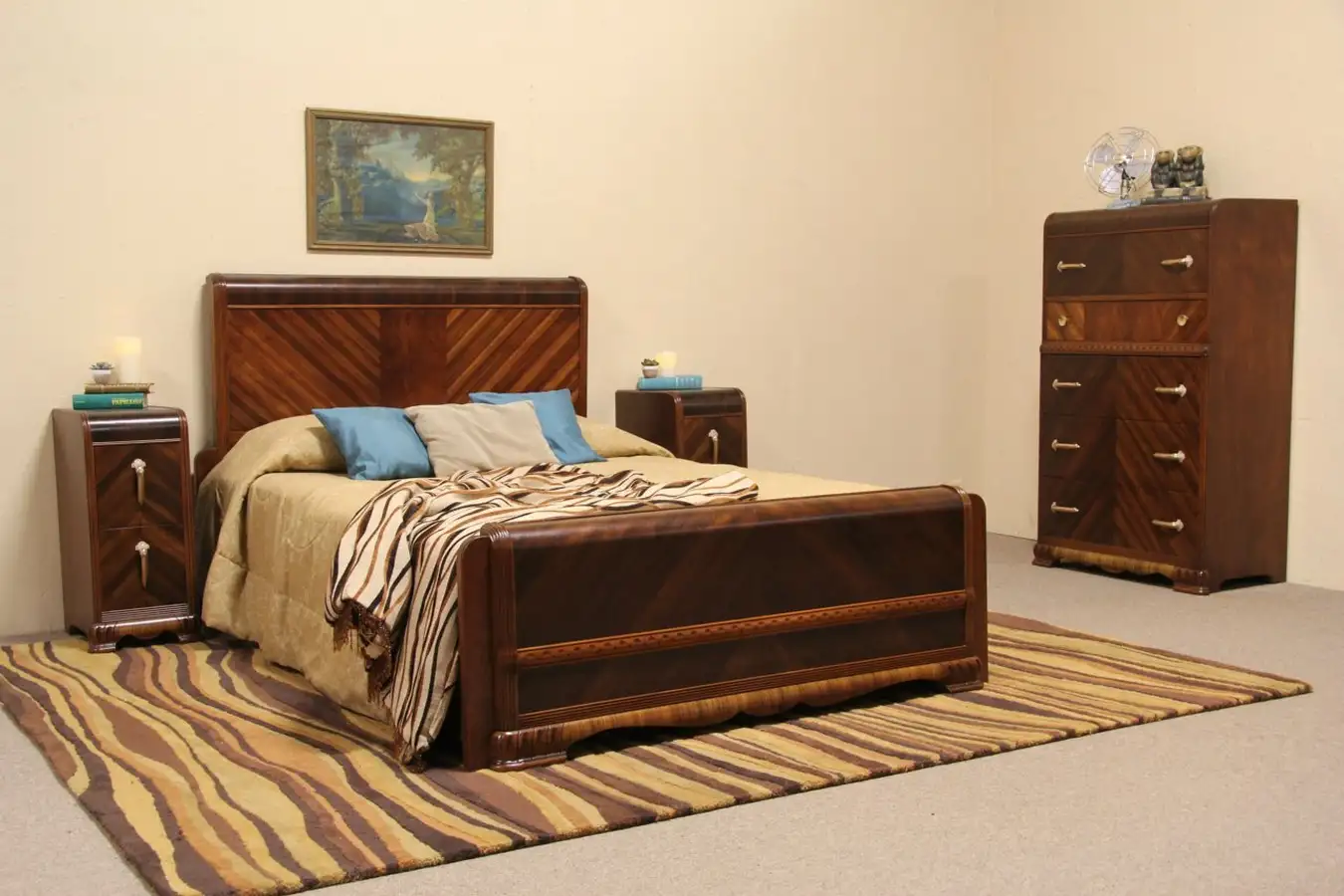 This four piece "waterfall" design bedroom set from about 1935 includes a queen size bed, tall chest or highboy dresser and two nightstands.