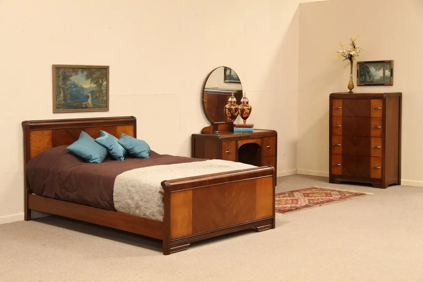 An authentic Art Deco bedroom set is in the classic "waterfall" pattern - the curving front edge rolls down like "water over a dam." Included are a standard full or double size bed, desk or dressing table and tall chest of drawers.