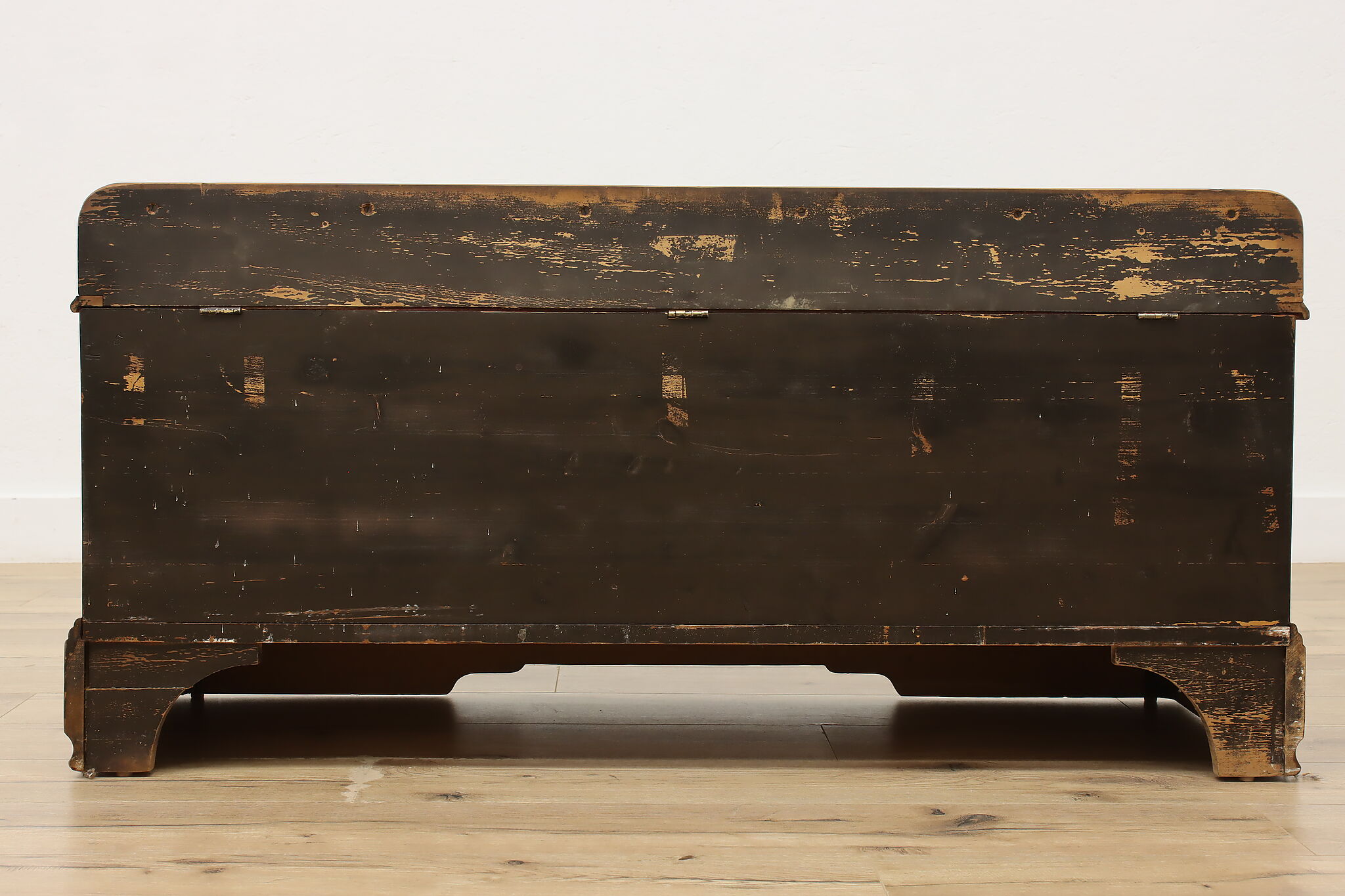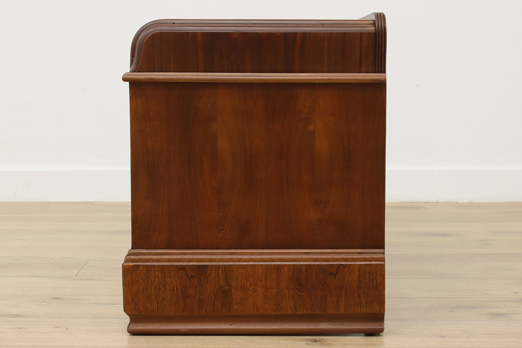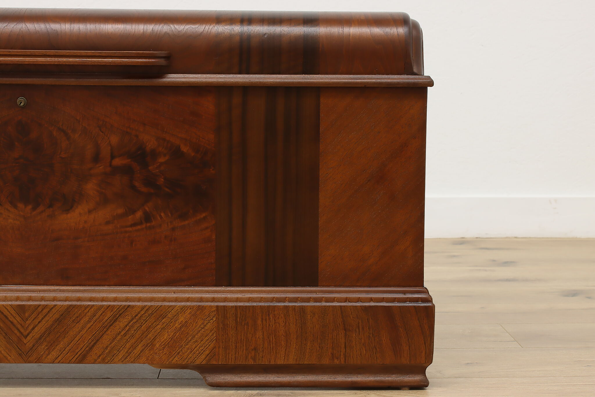An Art Deco period "waterfall" design blanket chest or storage trunk has an "automatic" tray when lid is lifted.