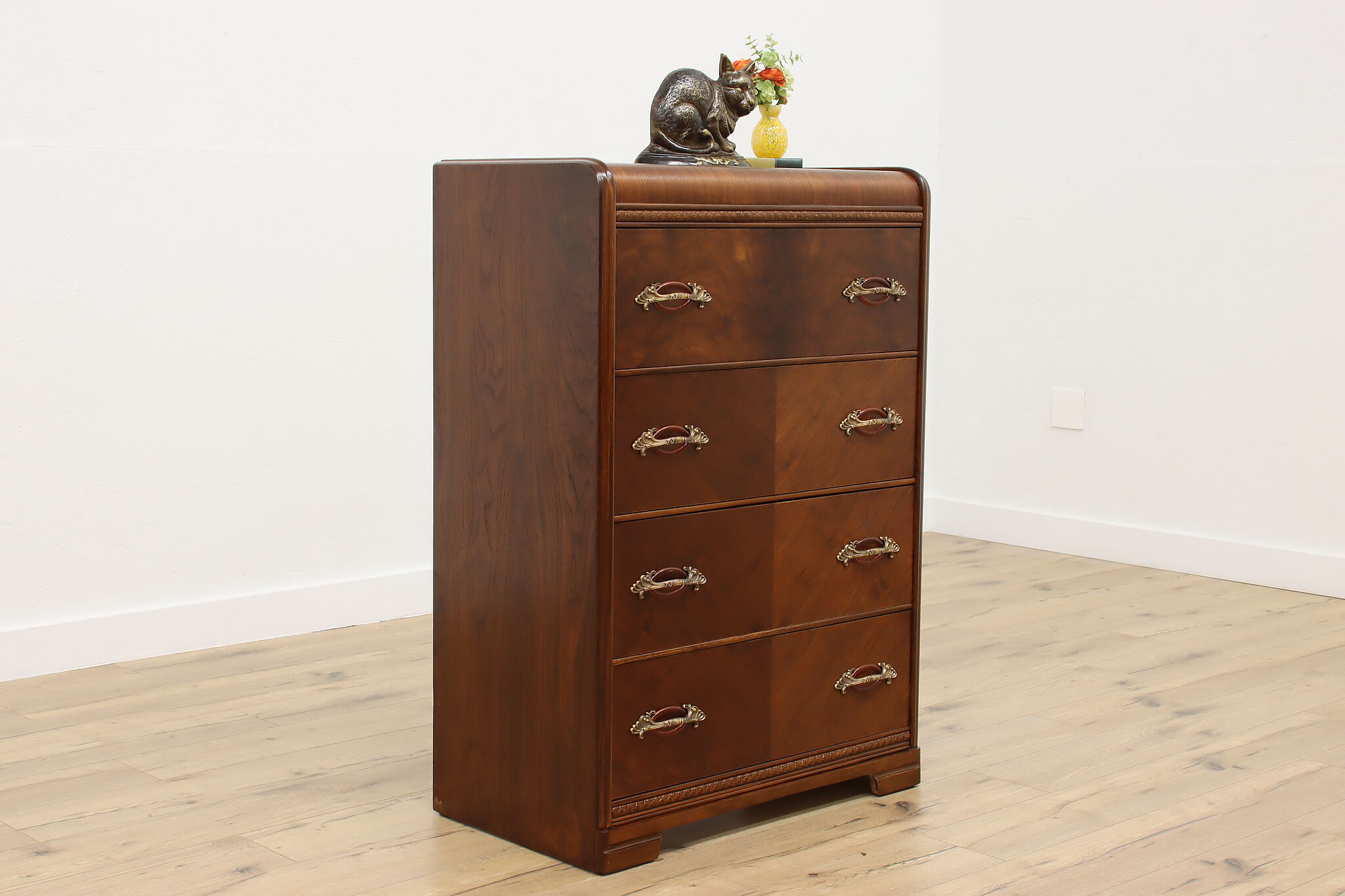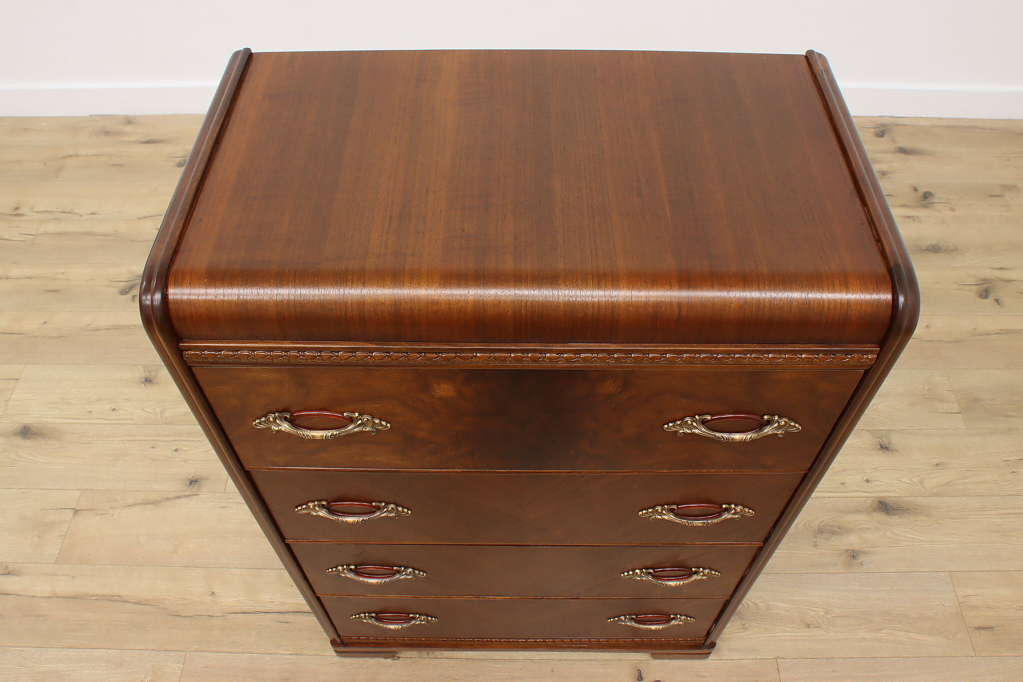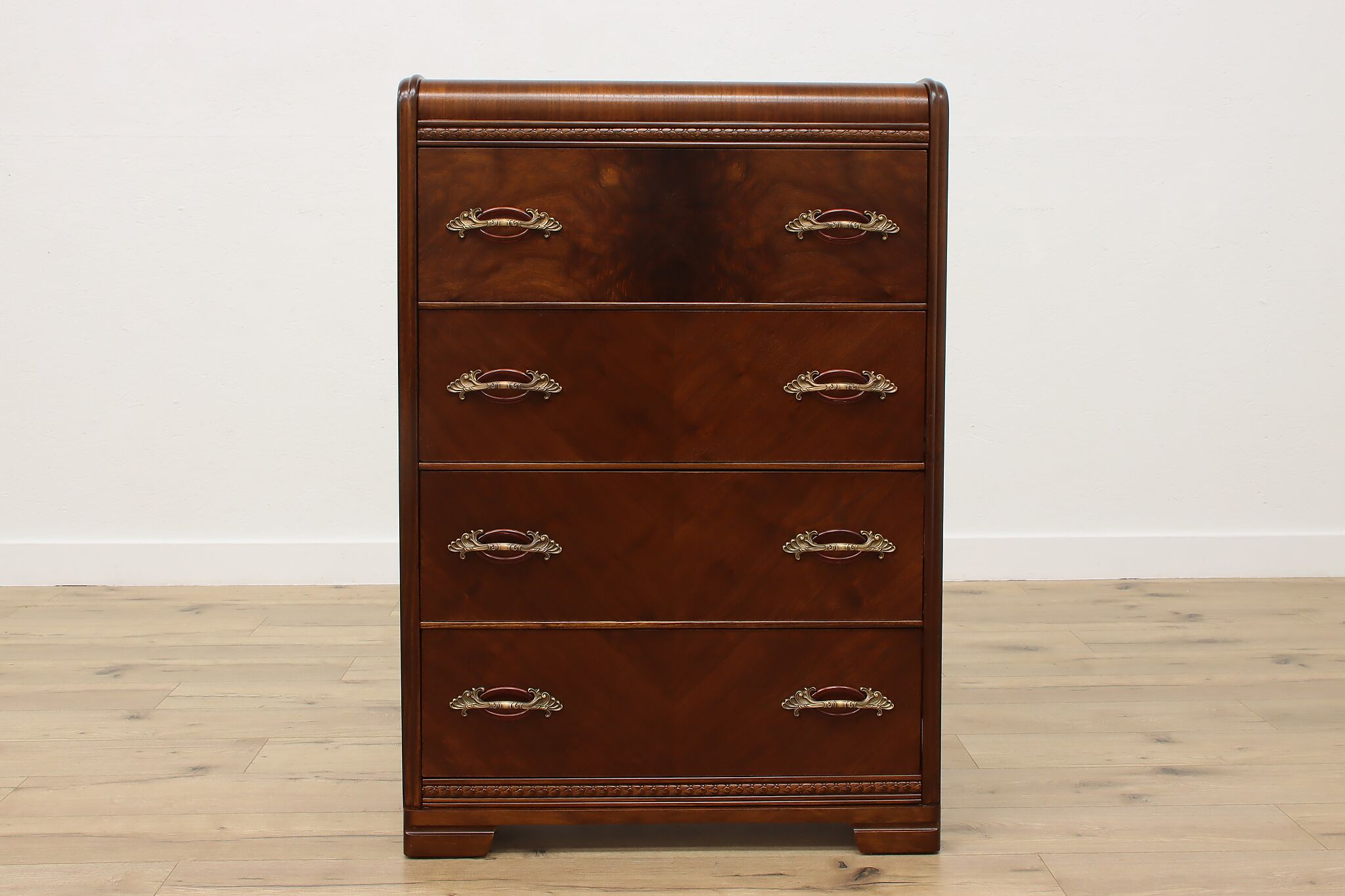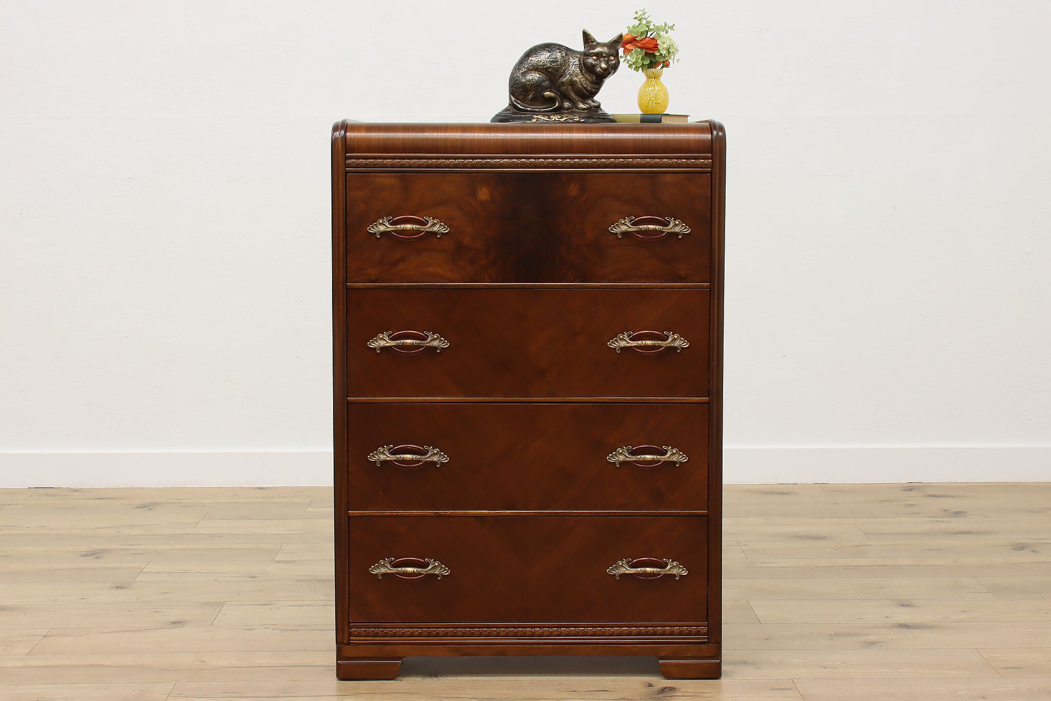 A classic Art Deco period chest or dresser has beautiful "waterfall" design and bookmatched drawer fronts.