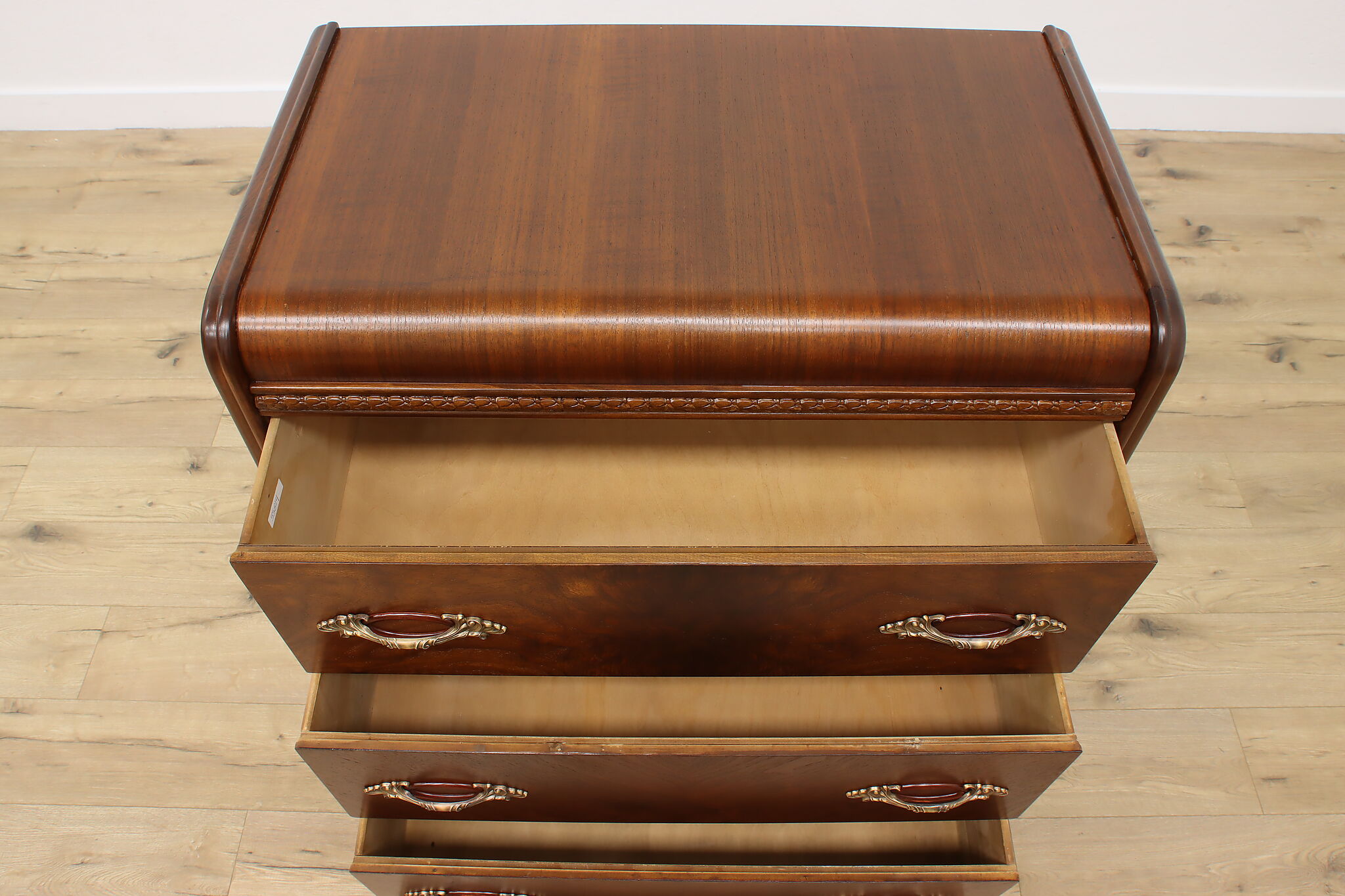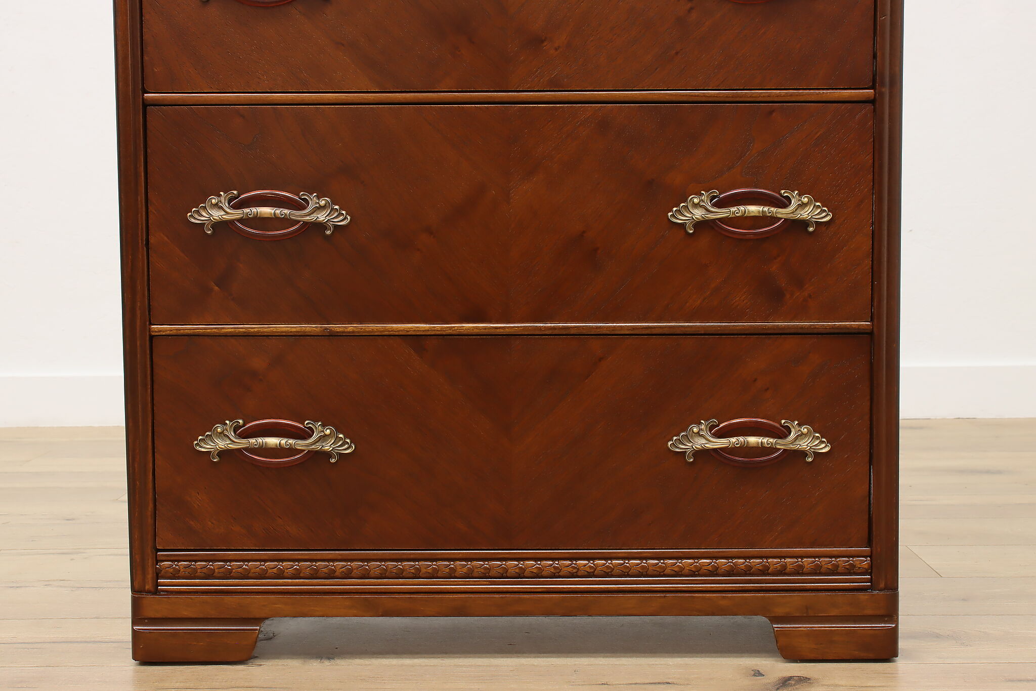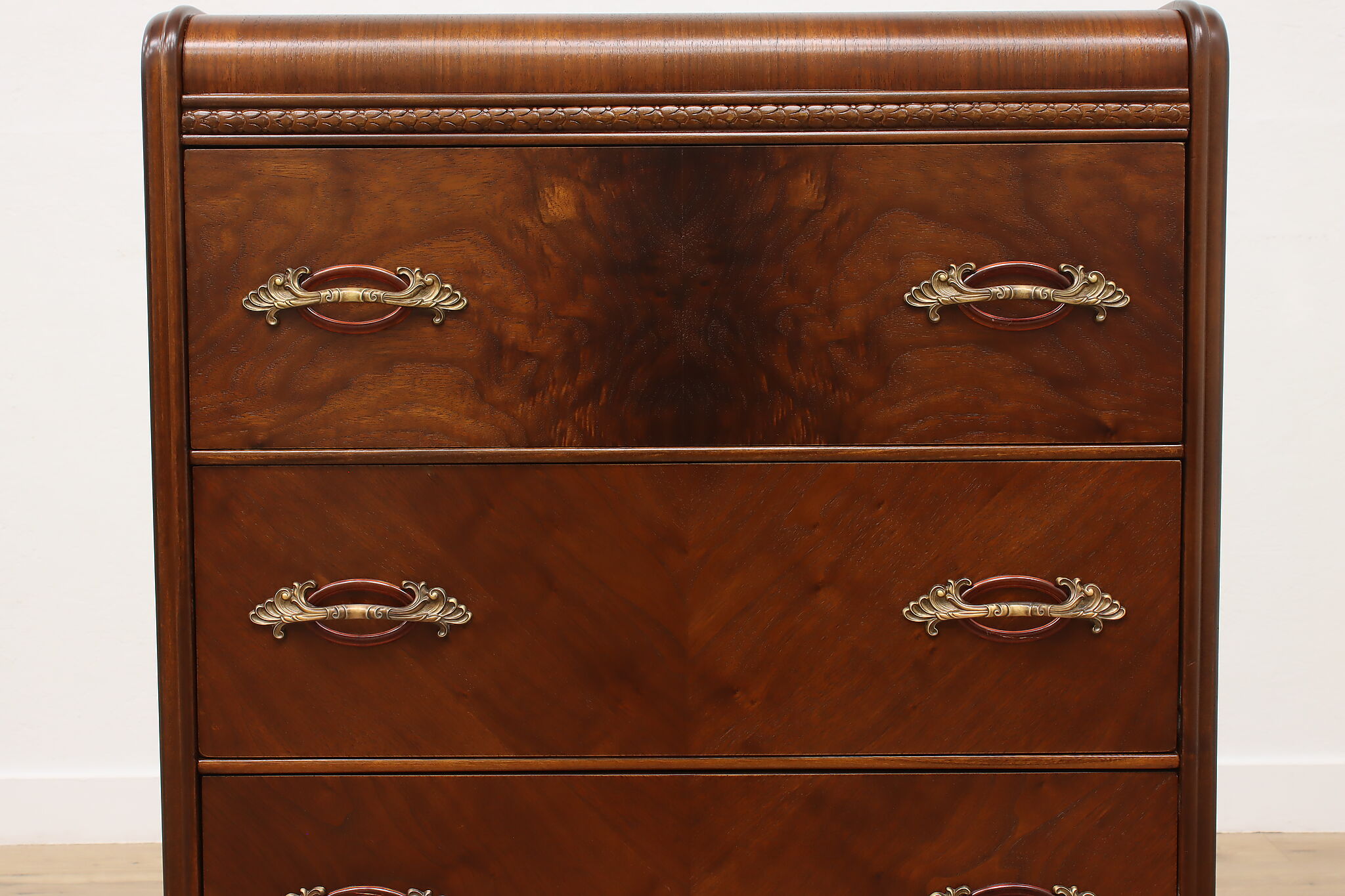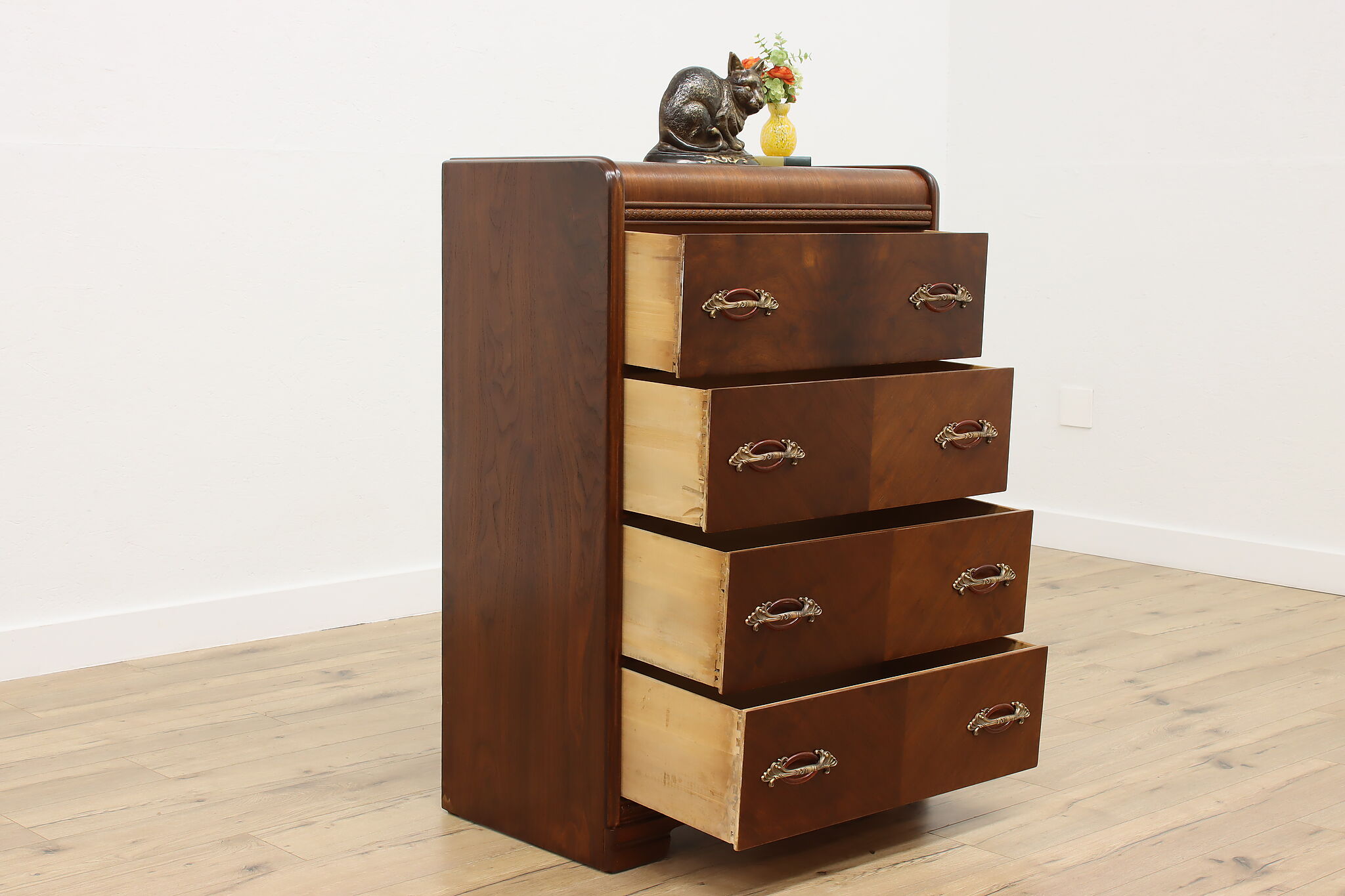 A classic Art Deco period chest or dresser has beautiful "waterfall" design and bookmatched drawer fronts.