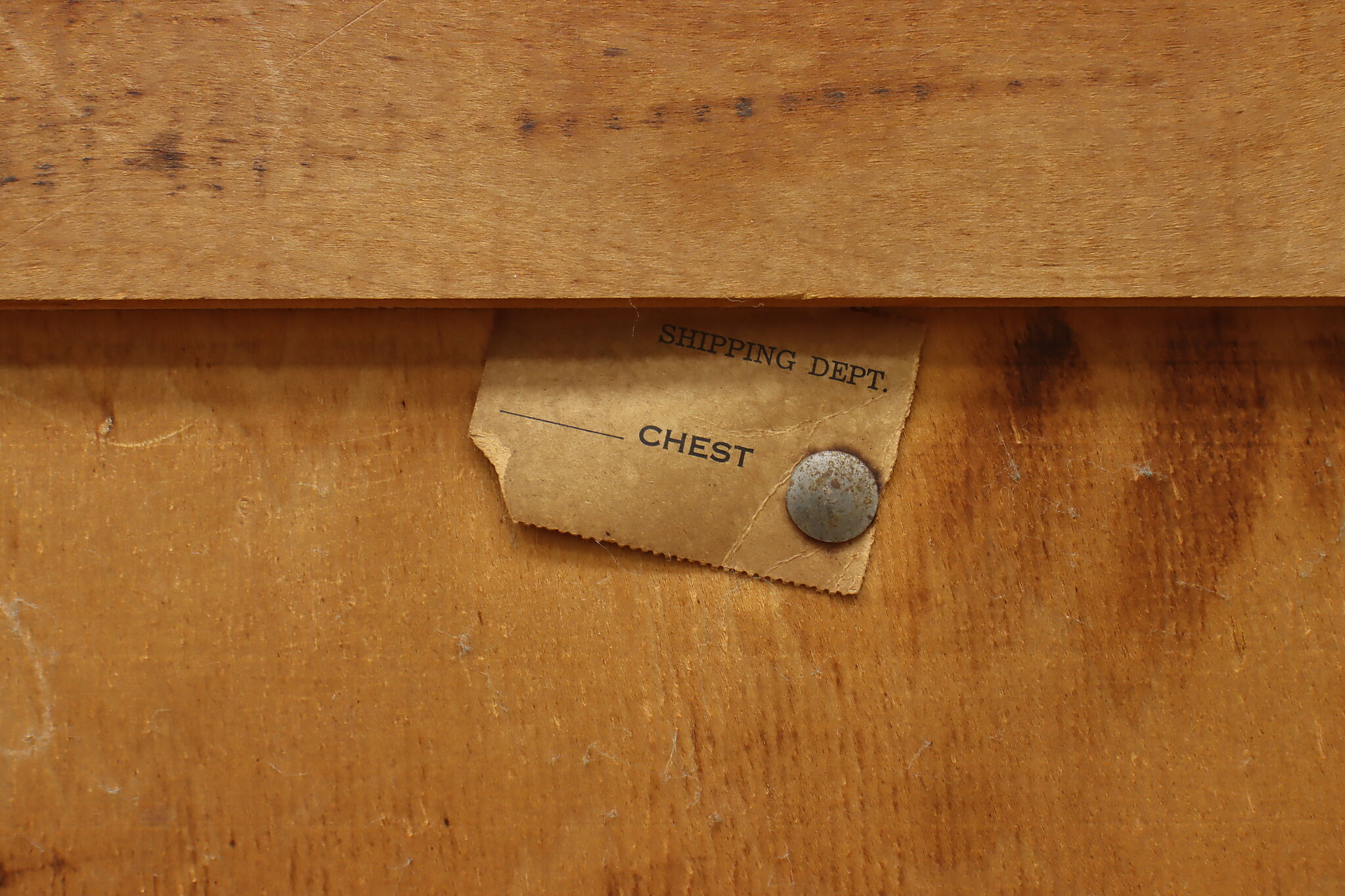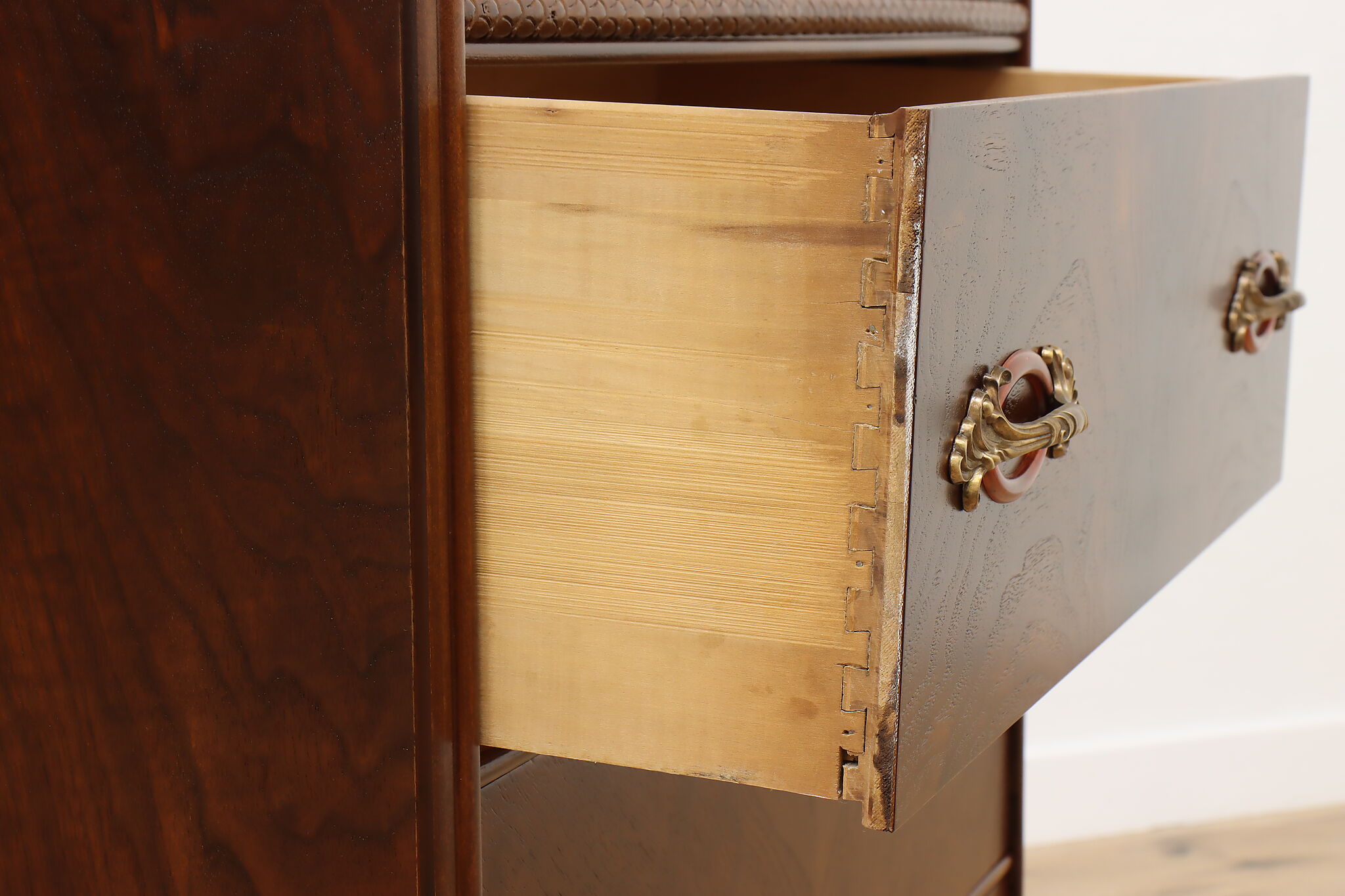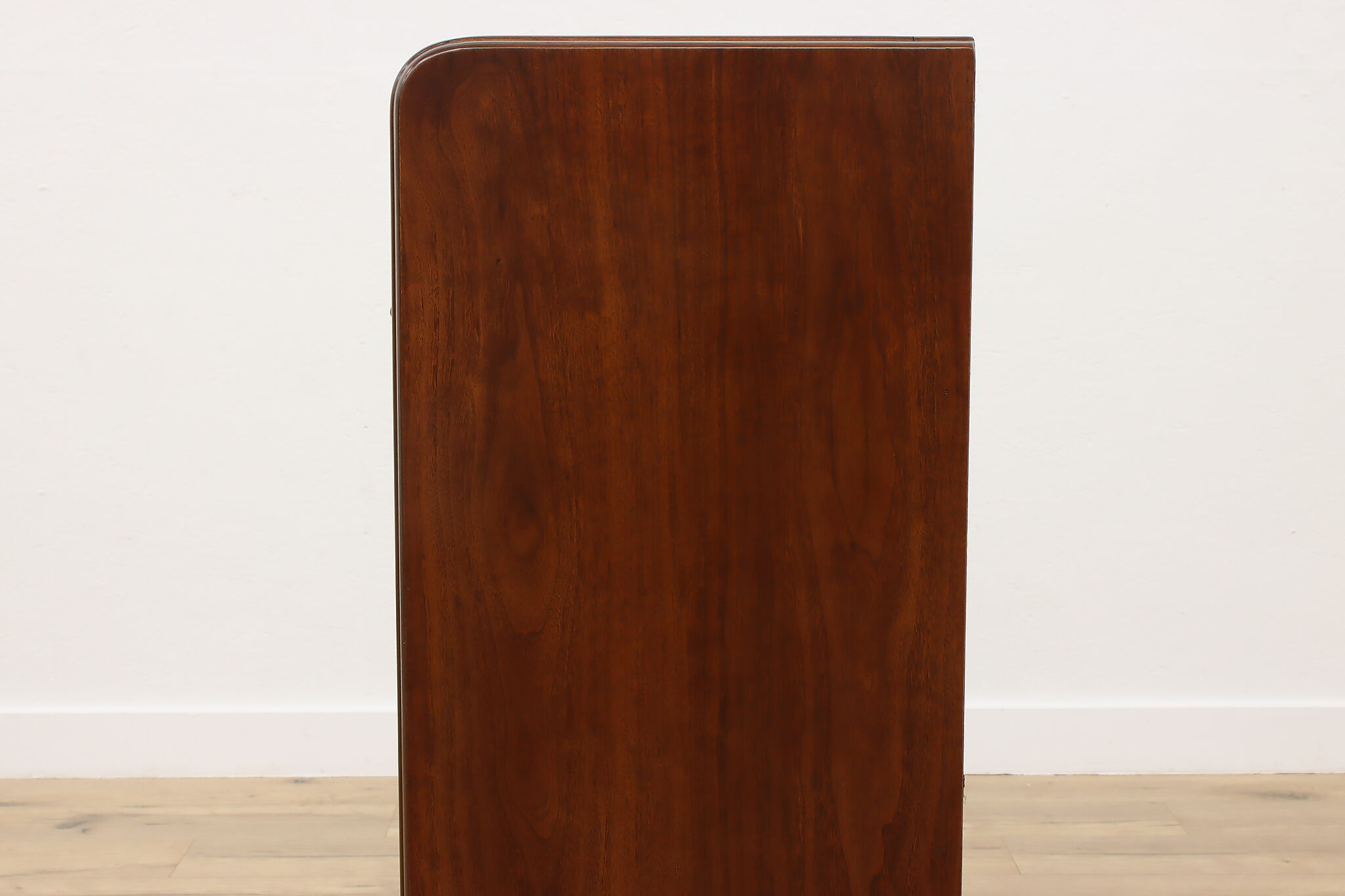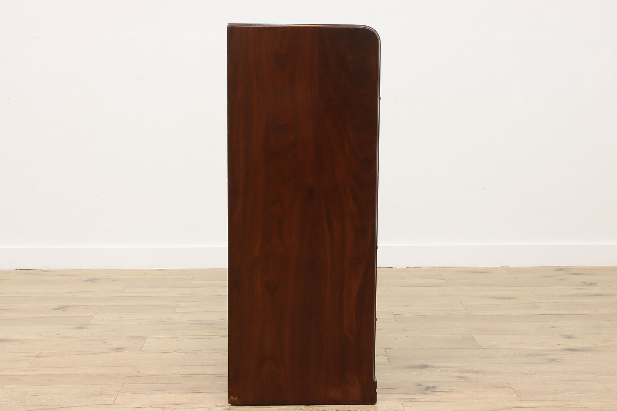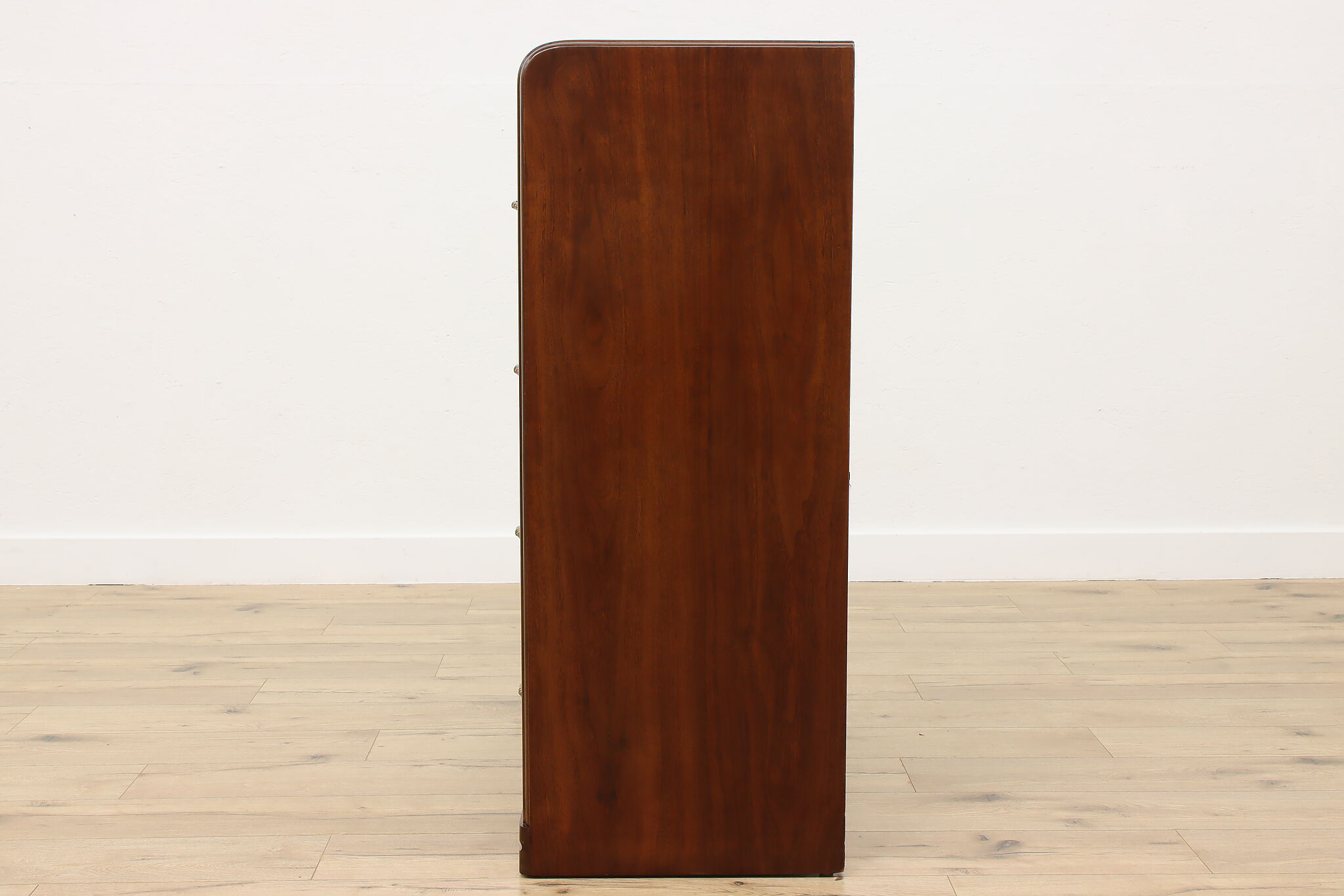 A classic Art Deco period chest or dresser has beautiful "waterfall" design and bookmatched drawer fronts.