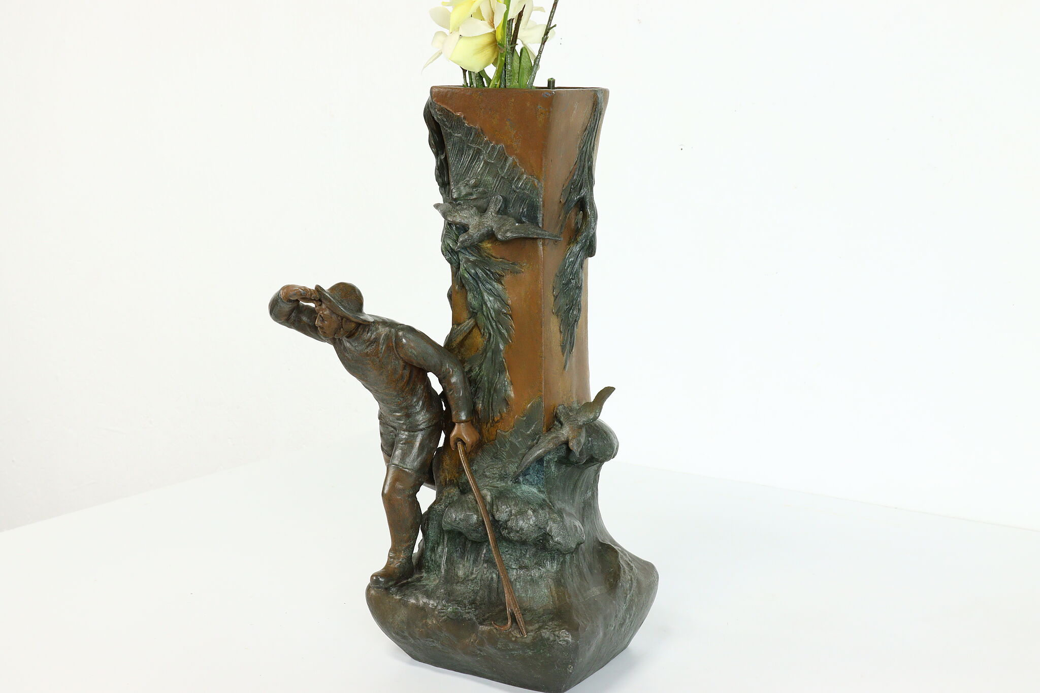 This planter or vase is a sculpture of a sailor looking to sea with fishing gaff hook, waves at his feet and seagulls flying around him.