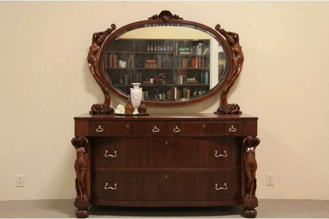 There is a wide bevel on the original oval mirror, which has a little "smoke" for character. The front is gracefully bowed on this remarkable American crafted antique, said to be Karpen.