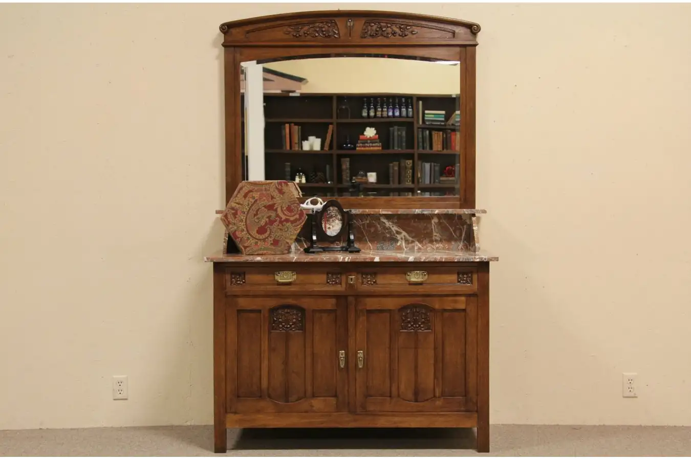 A lovely early 1900's Art Nouveau solid oak marble top chest with beveled mirror would make a wonderful server or vessel sink vanity.