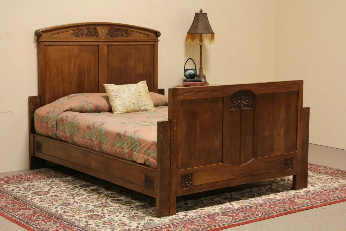 A wonderful solid oak bed from the Art Nouveau period about 1900 has been adapted to fit a standard queen size mattress as shown.