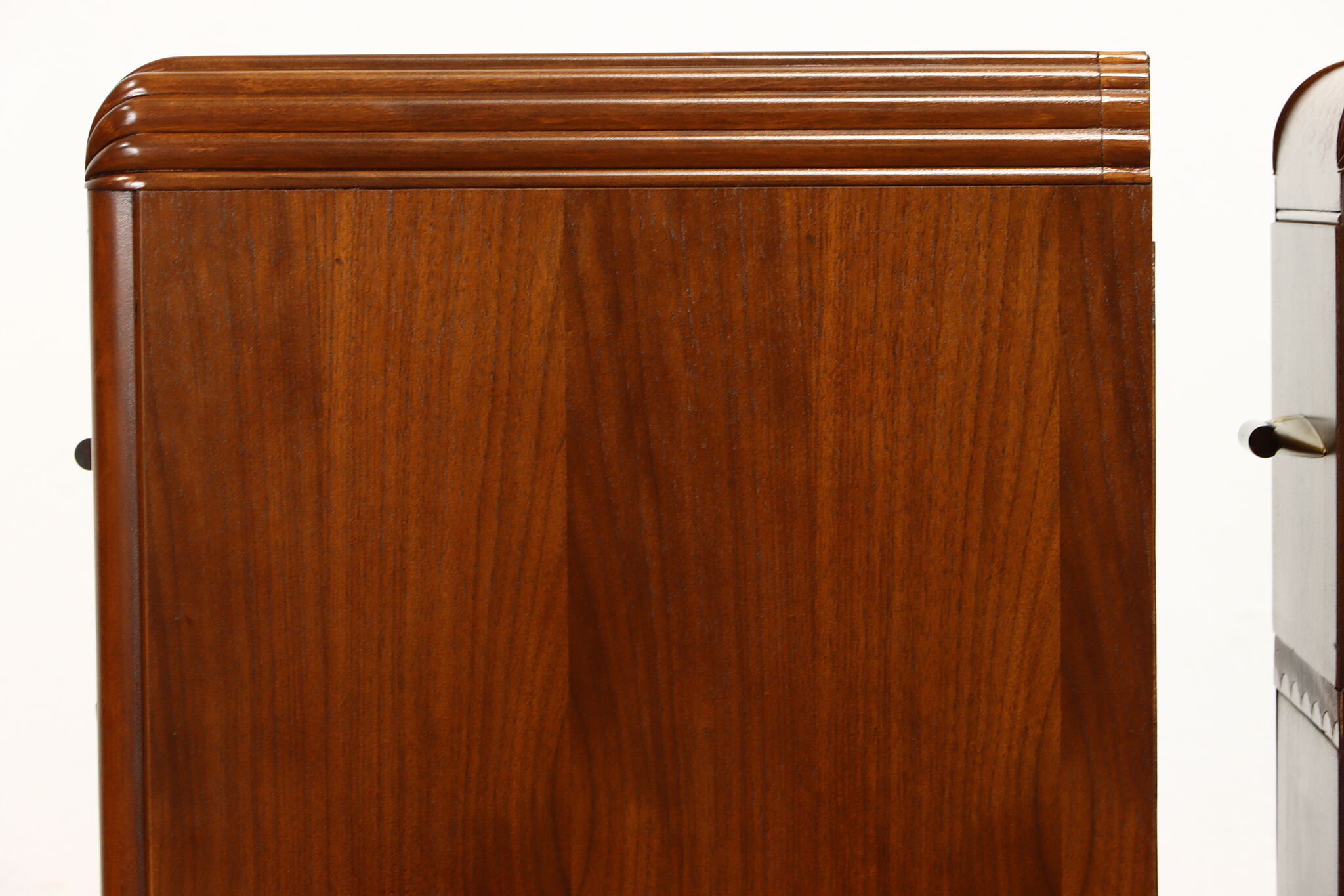A pair of Art Deco nightstands is sturdy with original amber bakelite pulls.