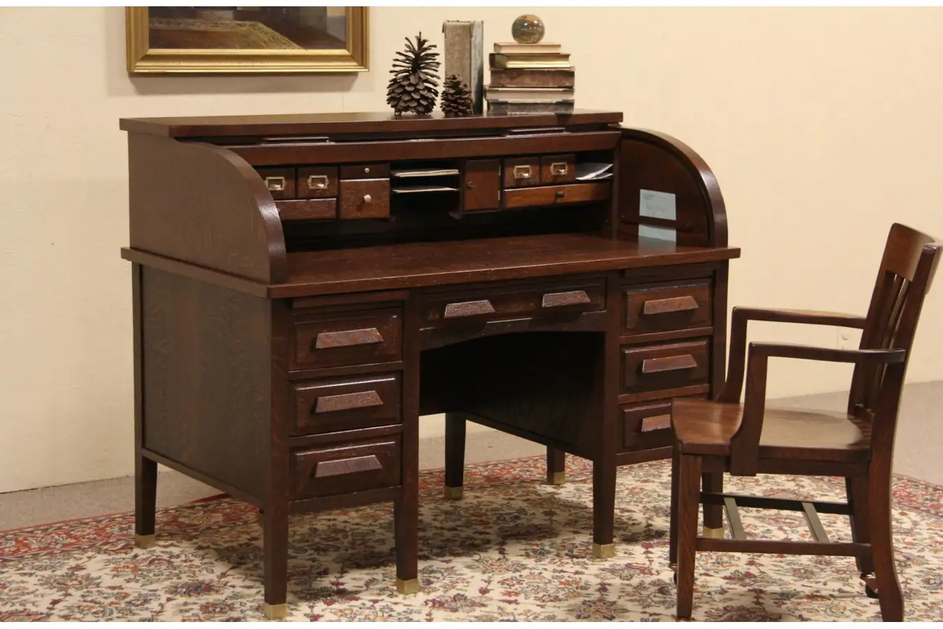 Deep dovetailed drawers include a large file drawer, two pull-out shelves add workspace. The roll glides smoothly, inside are tiny cubicles and drawers plus pencil and letter holders. A compartment door key and lock still works.