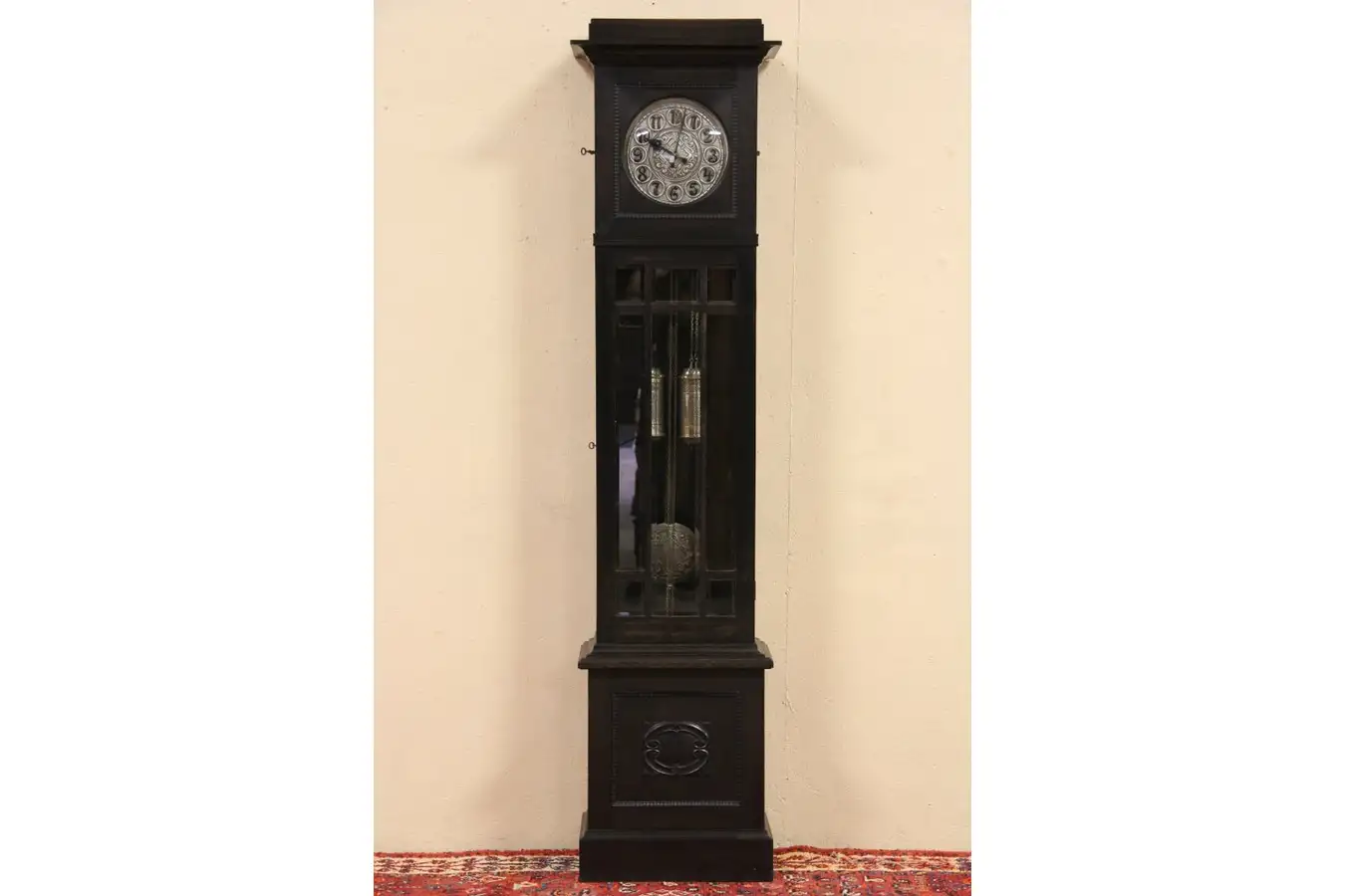 The hand hammered brass dial, weights and pendulum have a beautiful pewter or nickel wash. There is round convex glass in the upper drawer, lower door panes are all beveled, both doors lock. Small side doors give access to the movement.