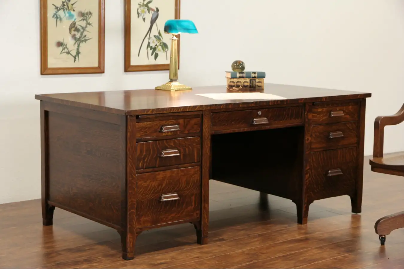 A splendid large executive desk from the Arts and Crafts or Mission Oak period about 1900 is solid quarter sawn oak.