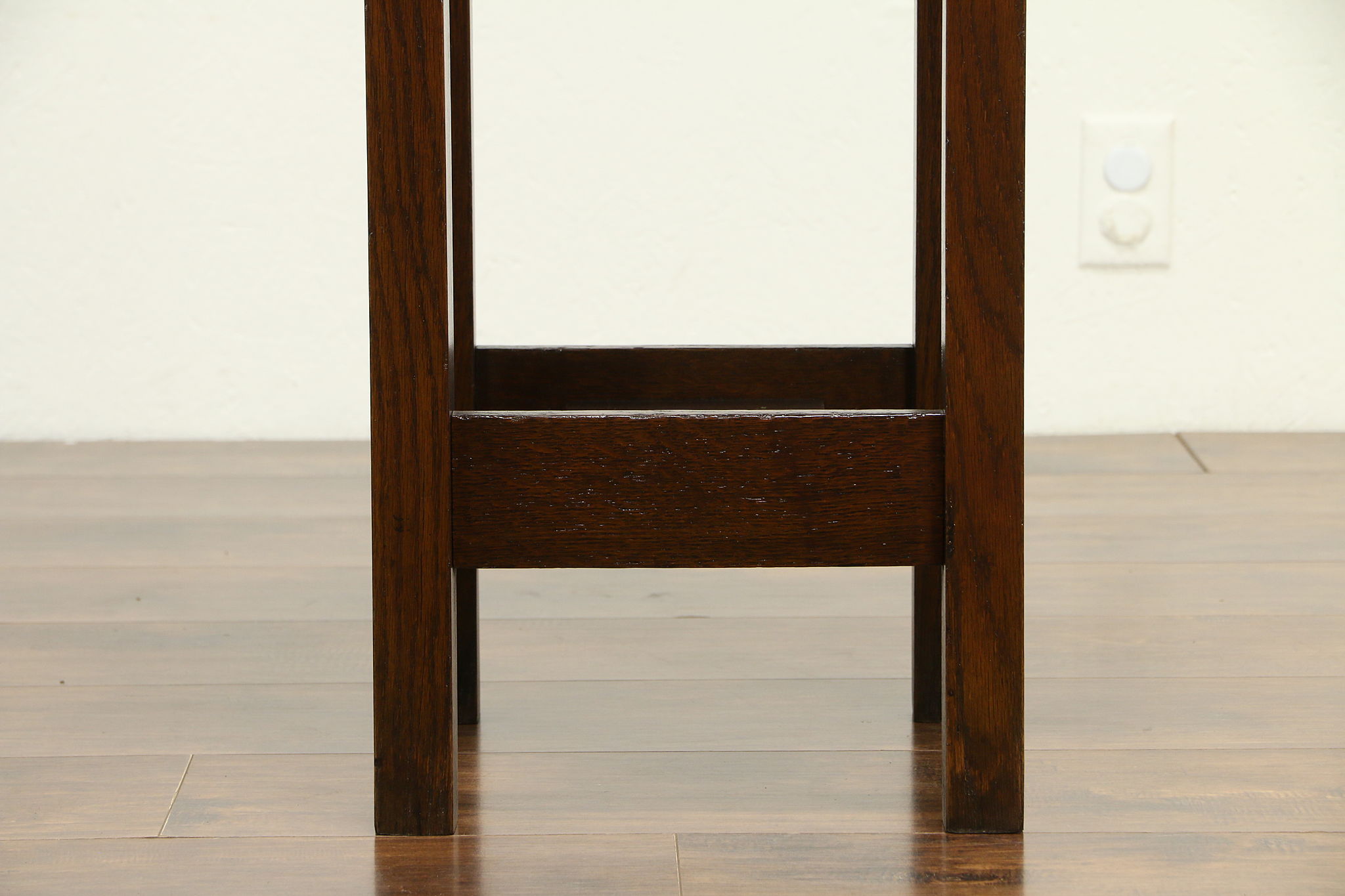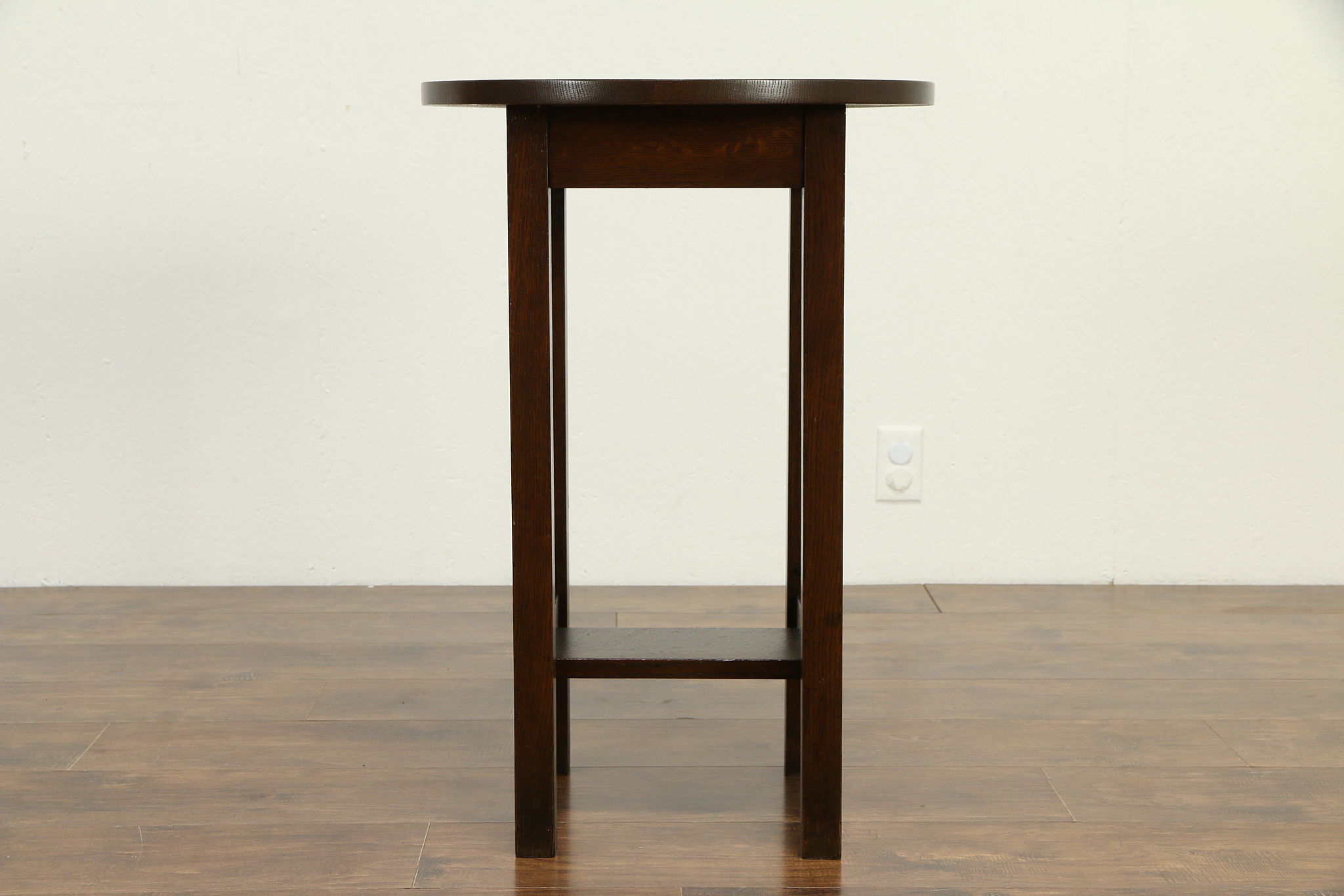 A round lamp or end table is from the Arts and Crafts or Mission Oak period about 1905. Solid quarter sawn oak, this antique furniture is strong and sturdy.