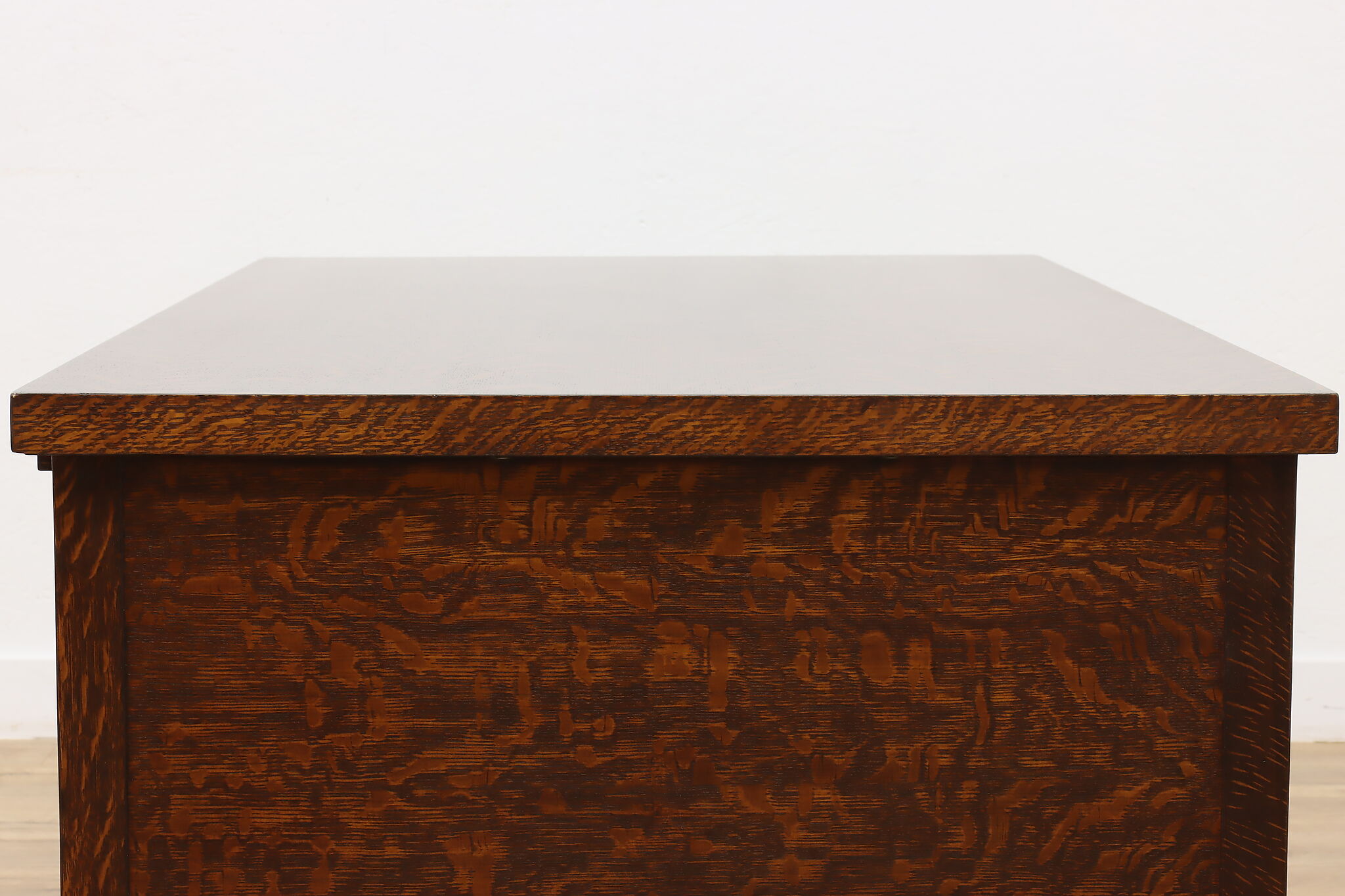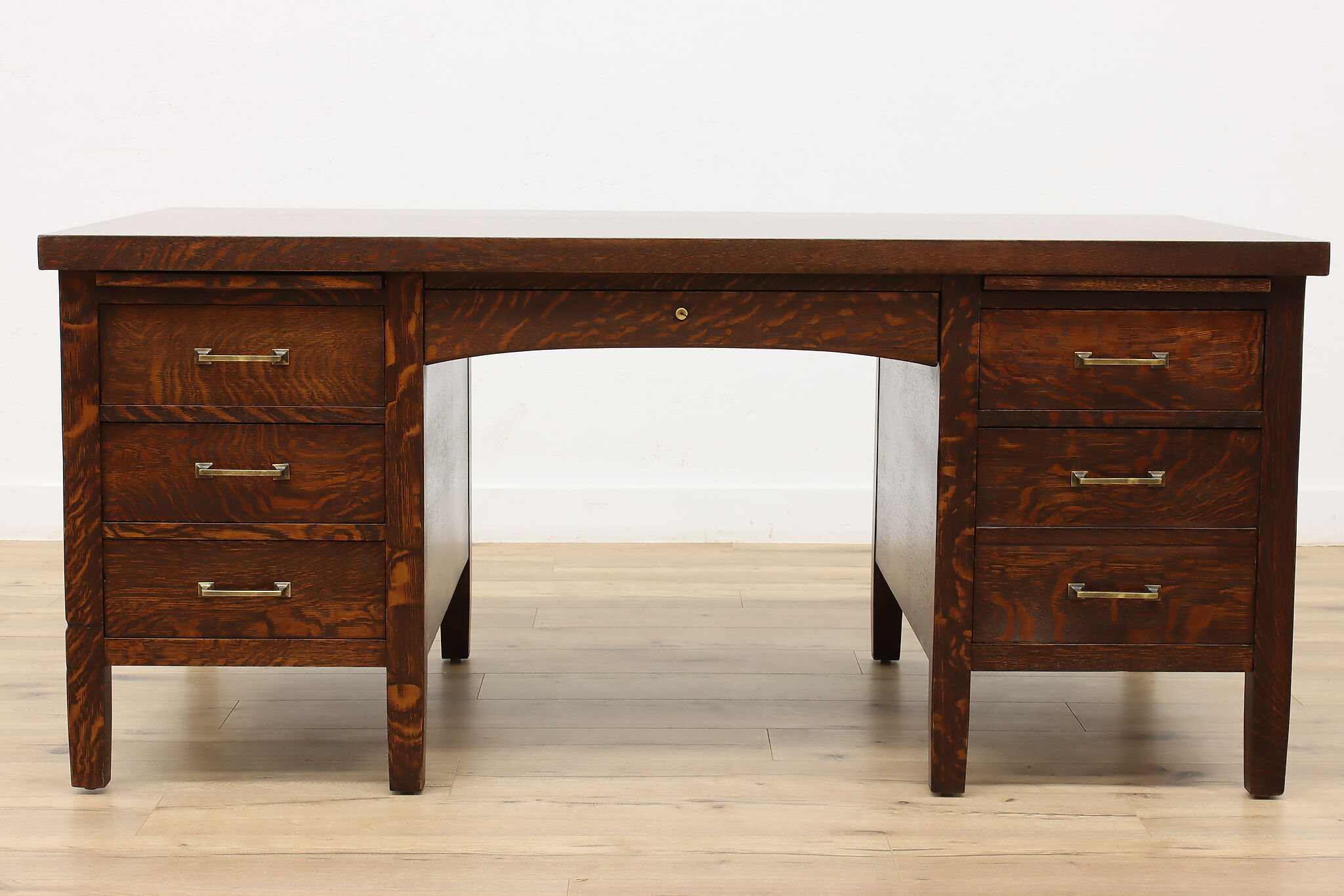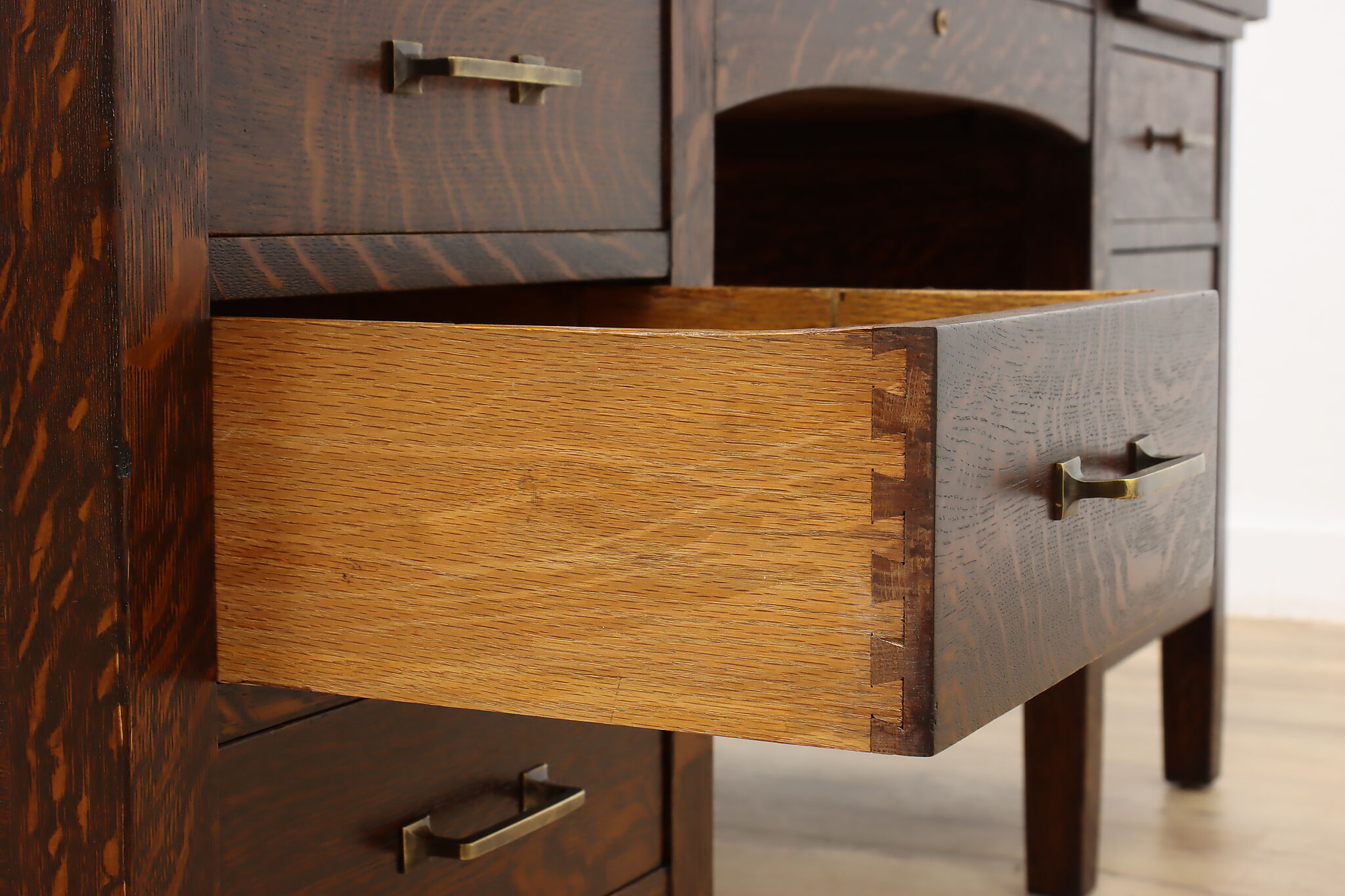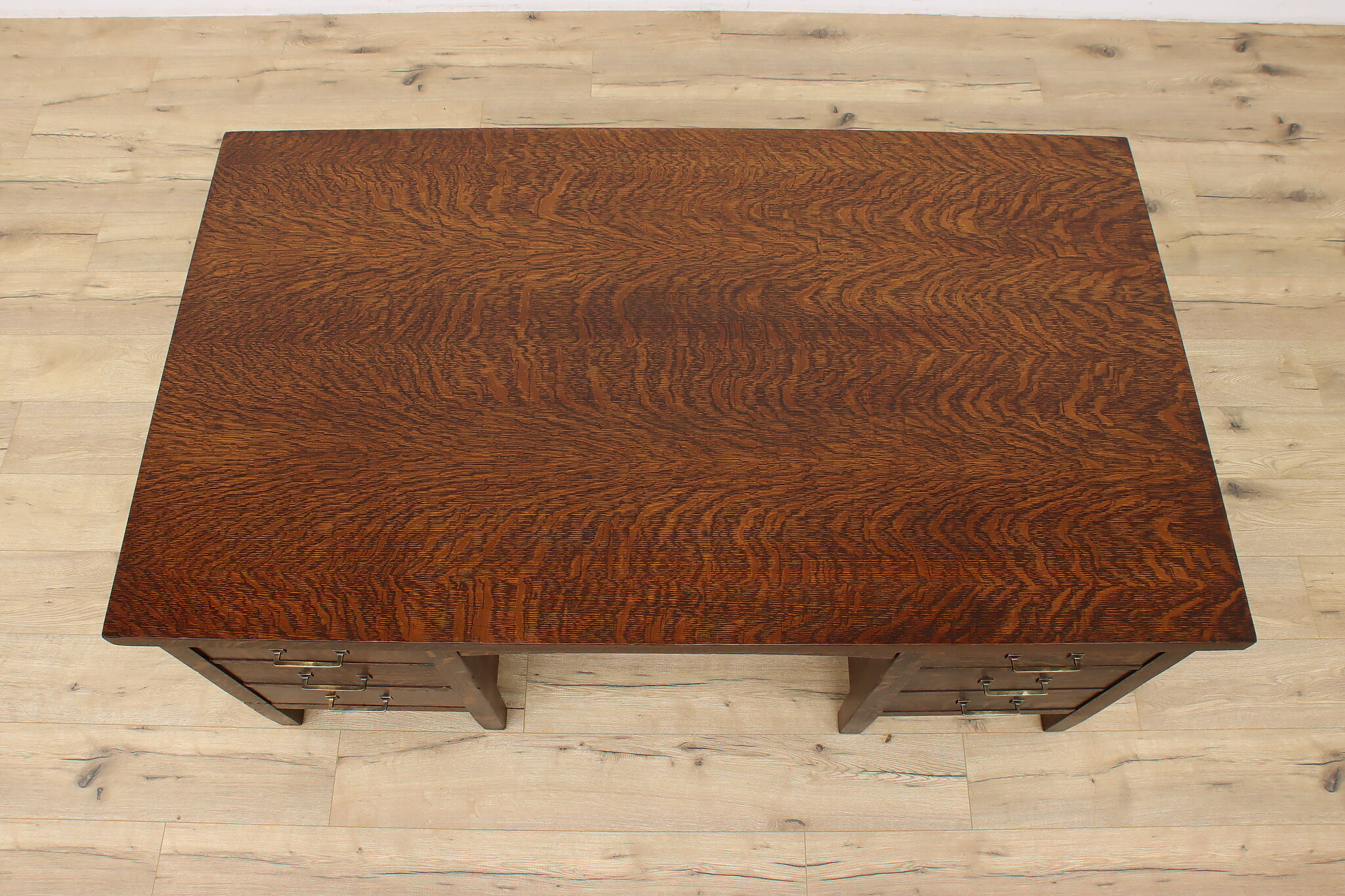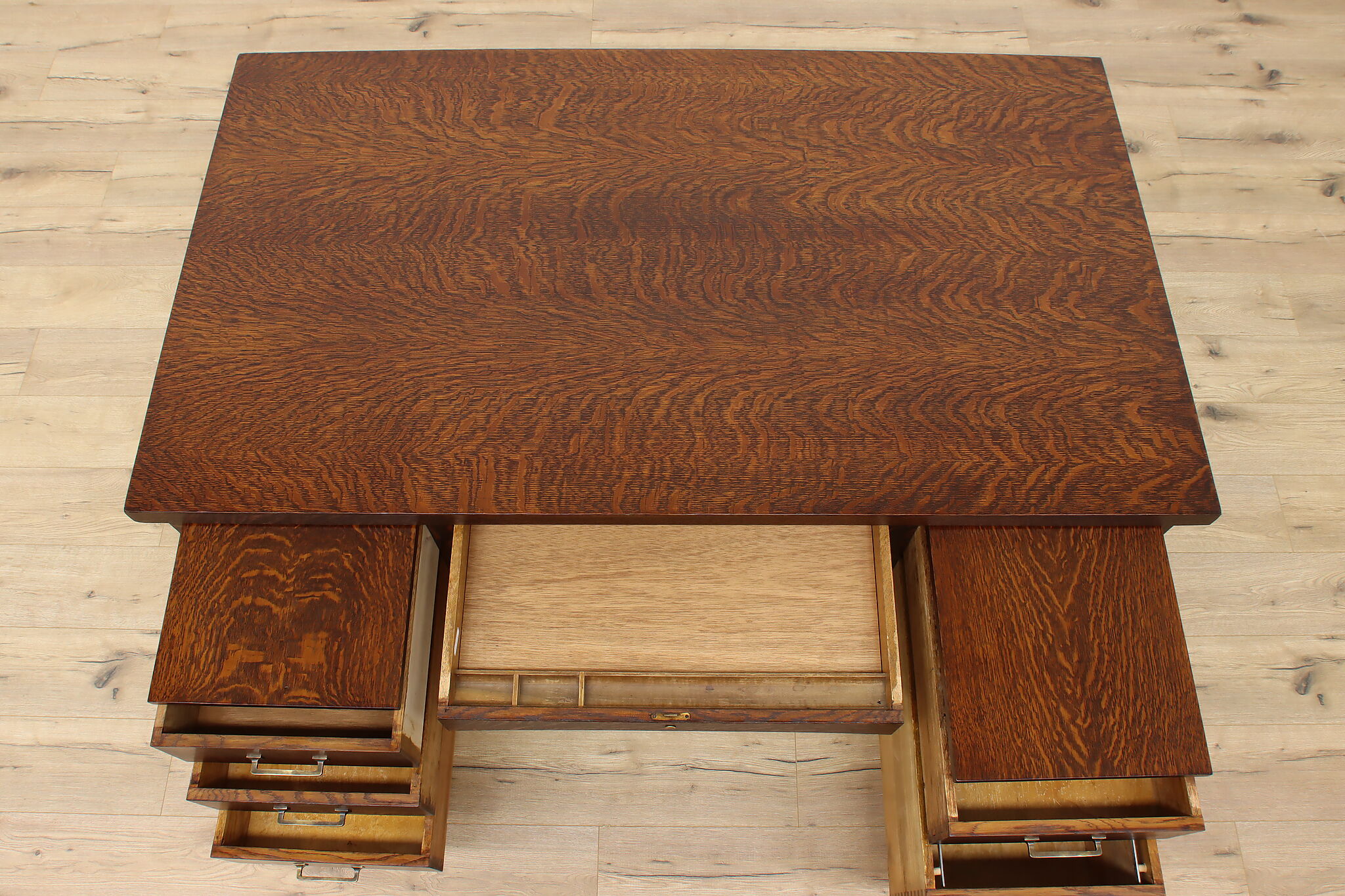 A Craftsman era office or library desk is gorgeous quarter sawn oak with bold natural grain.
