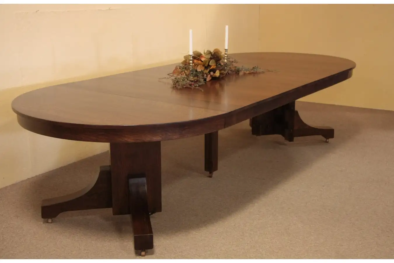 This magnificent classic Arts and Crafts or Mission Oak 54" round dining table has a substantial pedestal and six leaves with skirts. It is solid quartersawn oak with gorgeous shimmering grain.