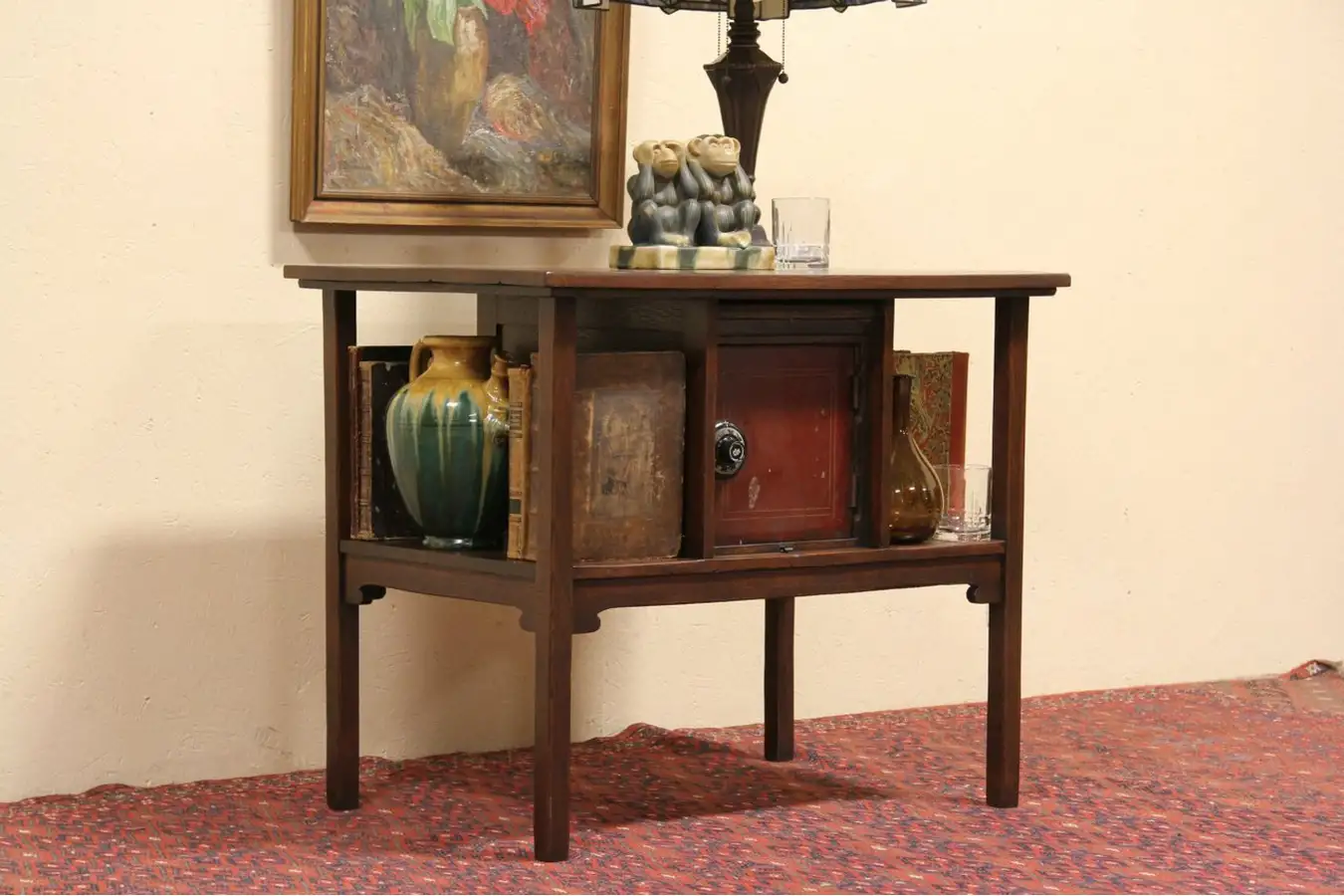 What appears to be an Arts and Crafts or Mission Oak hall table has "secret" doors that slide up to reveal a hidden jewel safe.