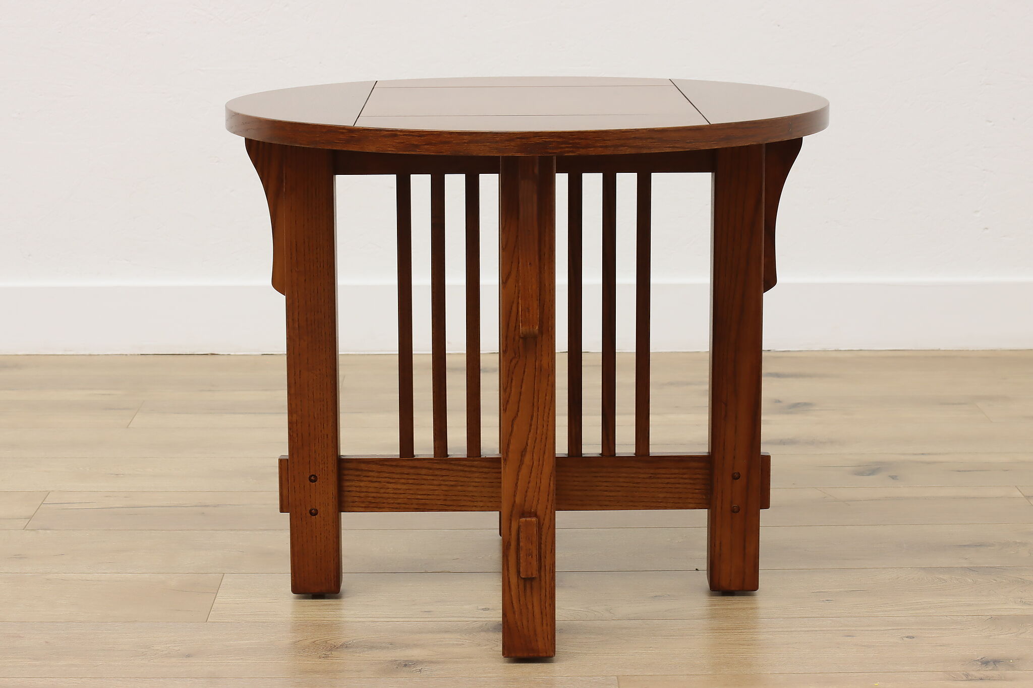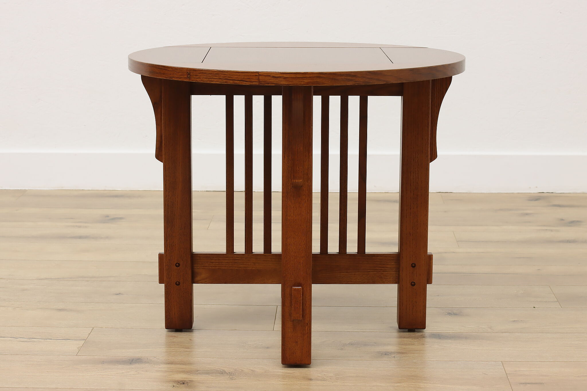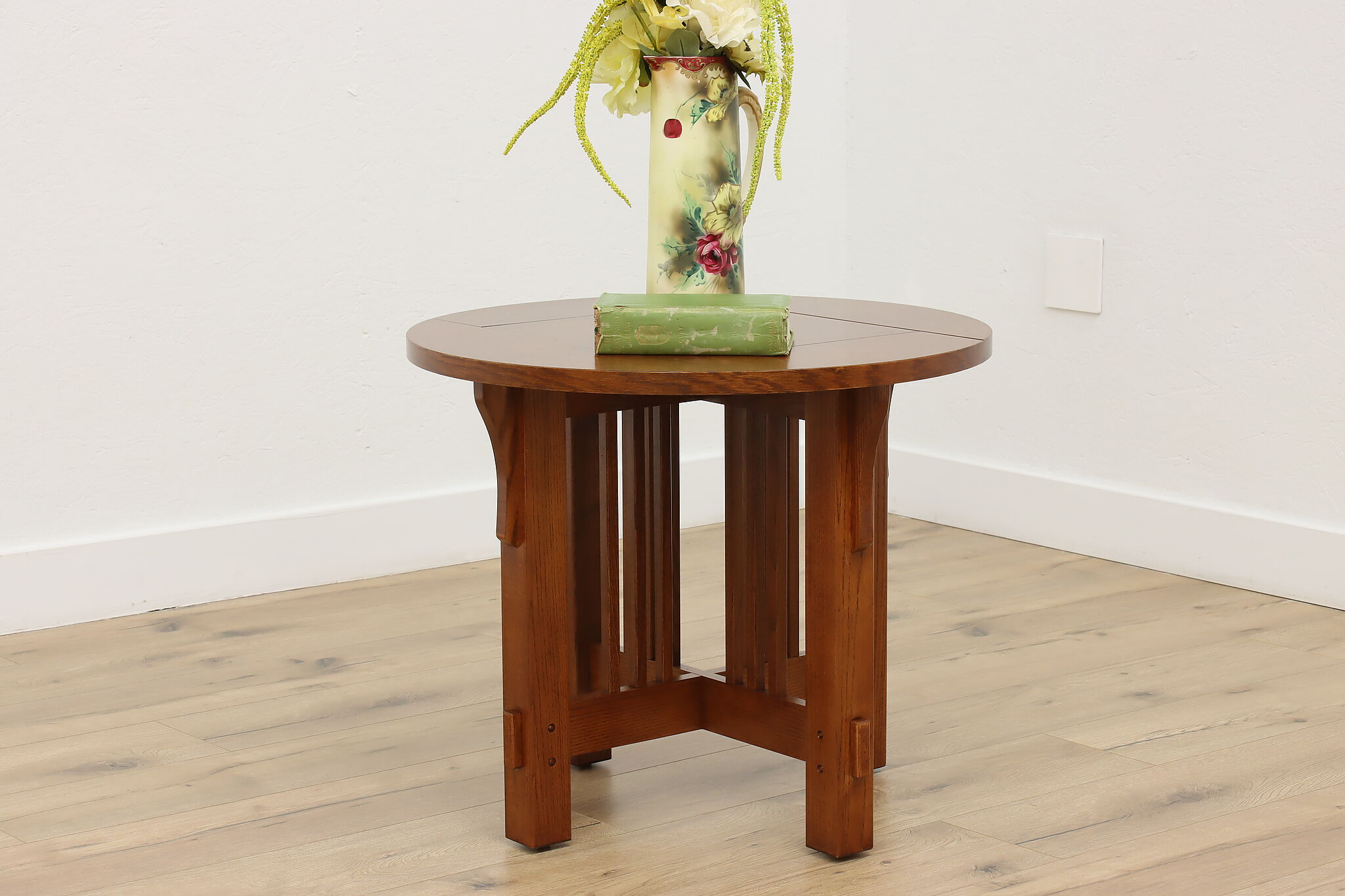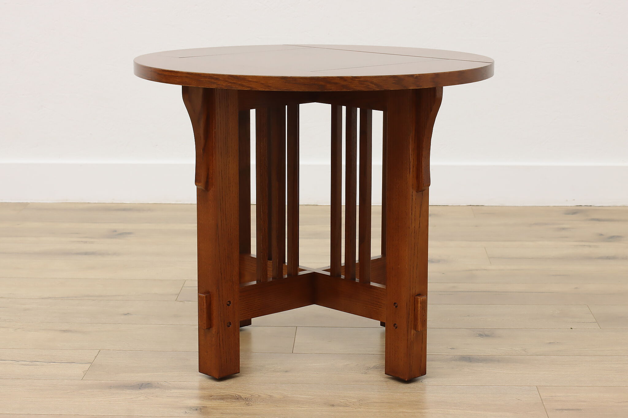 Little over a century later, craftsman period design remains popular for its clean lines and sturdy construction. Place this round chair side or end table in your living room to add definition and antique charm.
