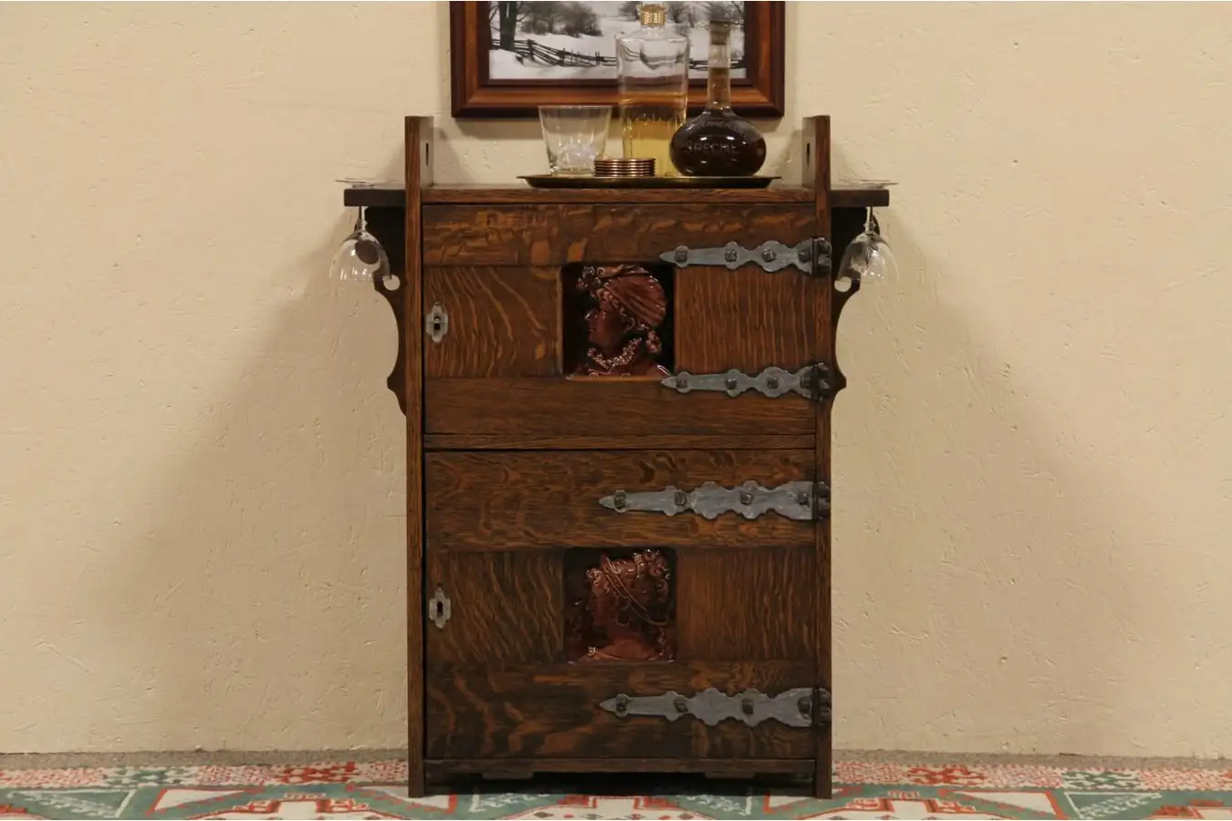 Notches on the sides could hold either smoking pipes or glass goblets. In both doors are embossed ceramic tiles with Renaissance figures that you can name yourself if you desire.