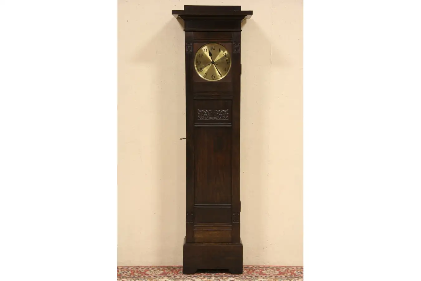 This Classic Arts and Crafts design 1900 era tall case or grandfather clock is from Germany. The original finish is very well preserved with minor mars at the edges. Hand carved details are understated, brass dial and pendulum are original, there is wear to the painted numerals, see photos.