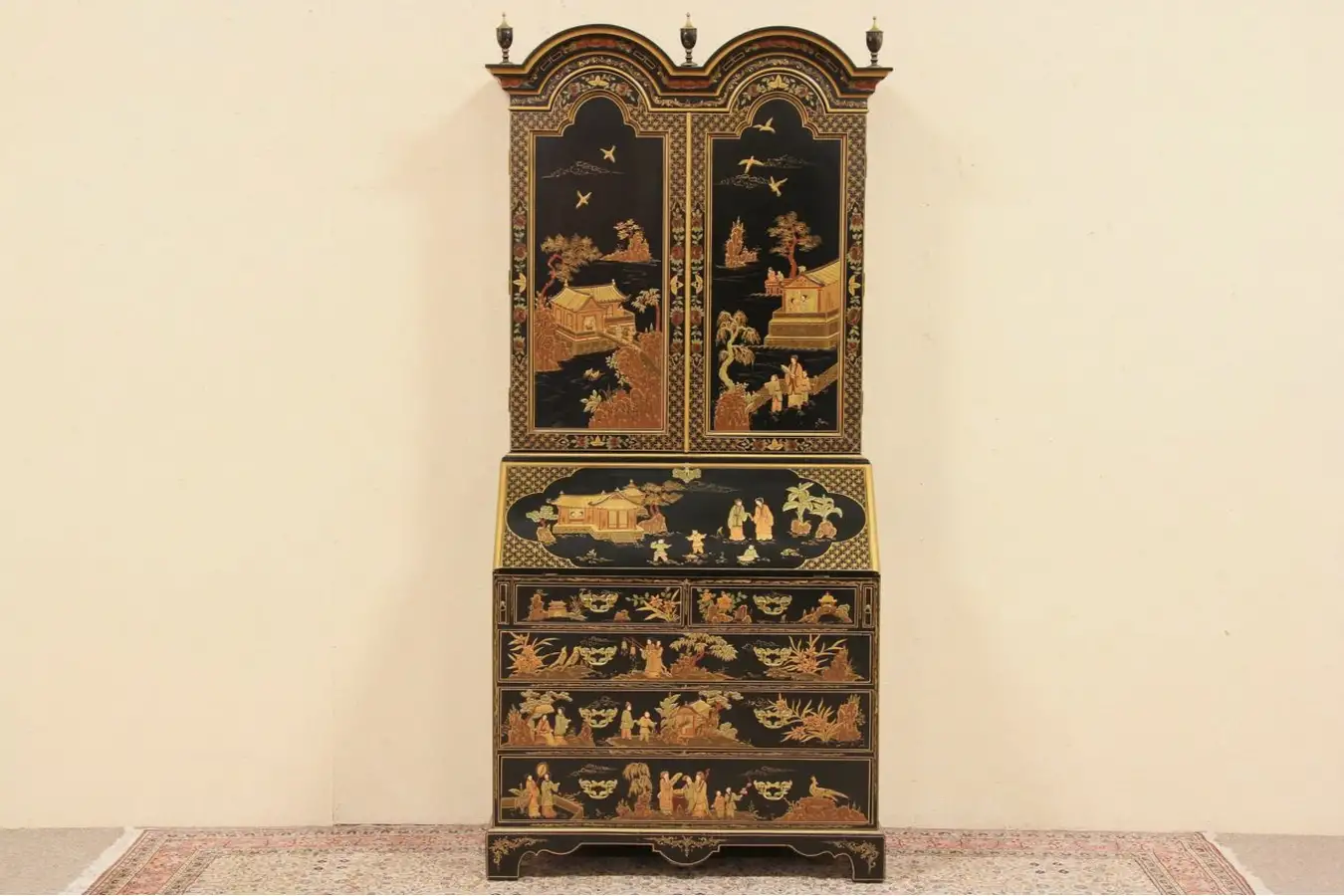 This exquisite "Chinoiserie" secretary desk with bookcase top combines Georgian lines, Asian hand work in lacquer and hand painted raised enamel. Estimate age is of this secretary is about 50 years.