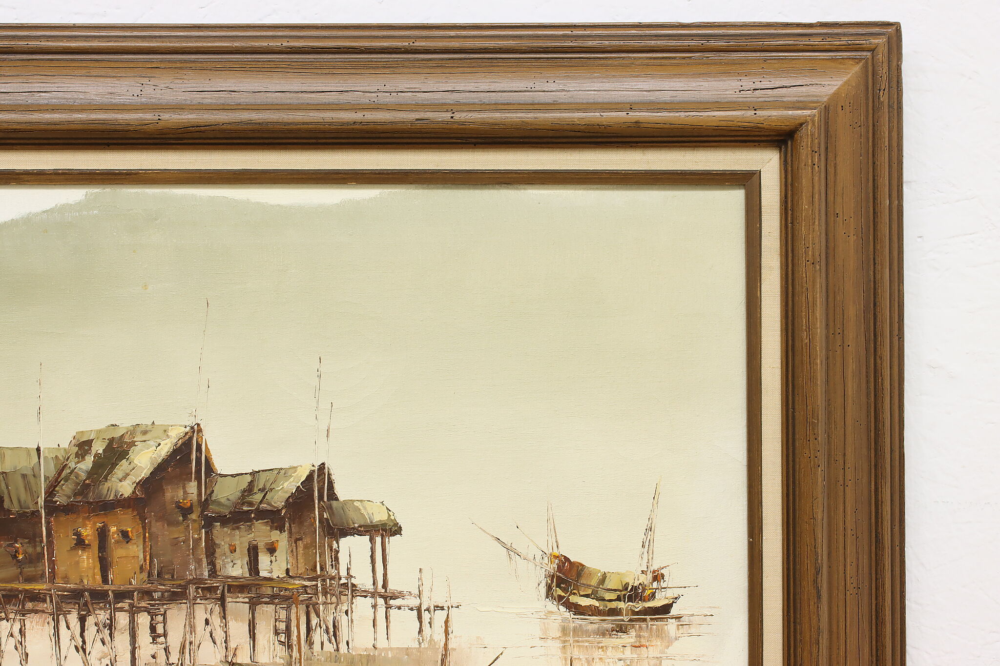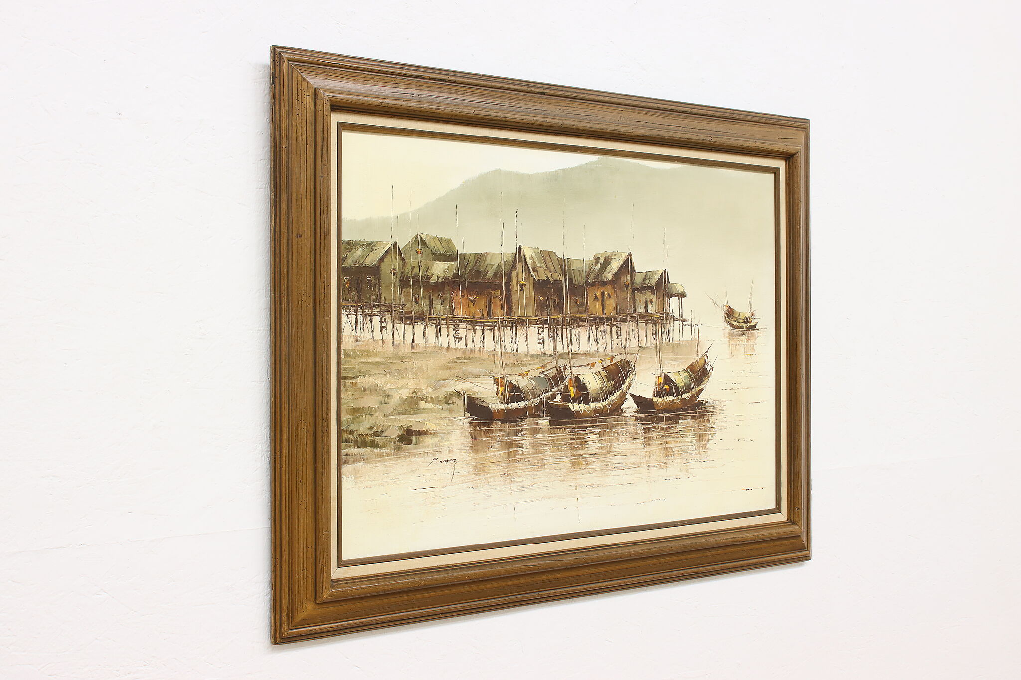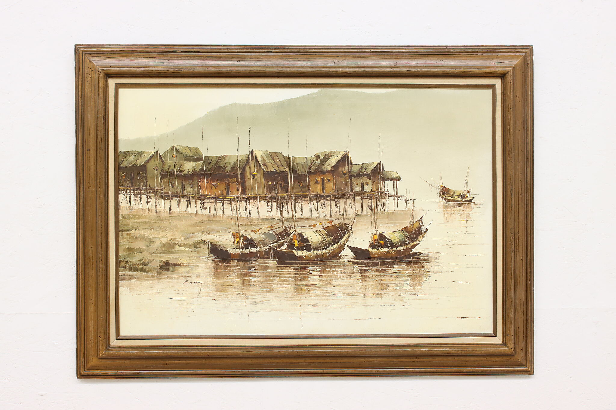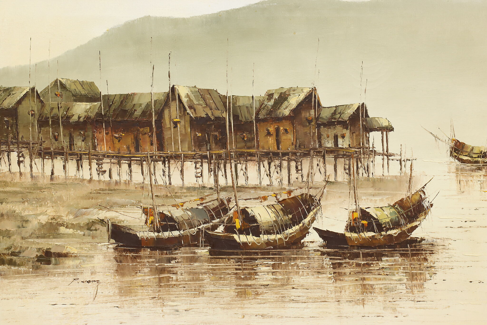 A foggy morning over a Chinese village on stilts with boats is the subject of this beautifully detailed painting.