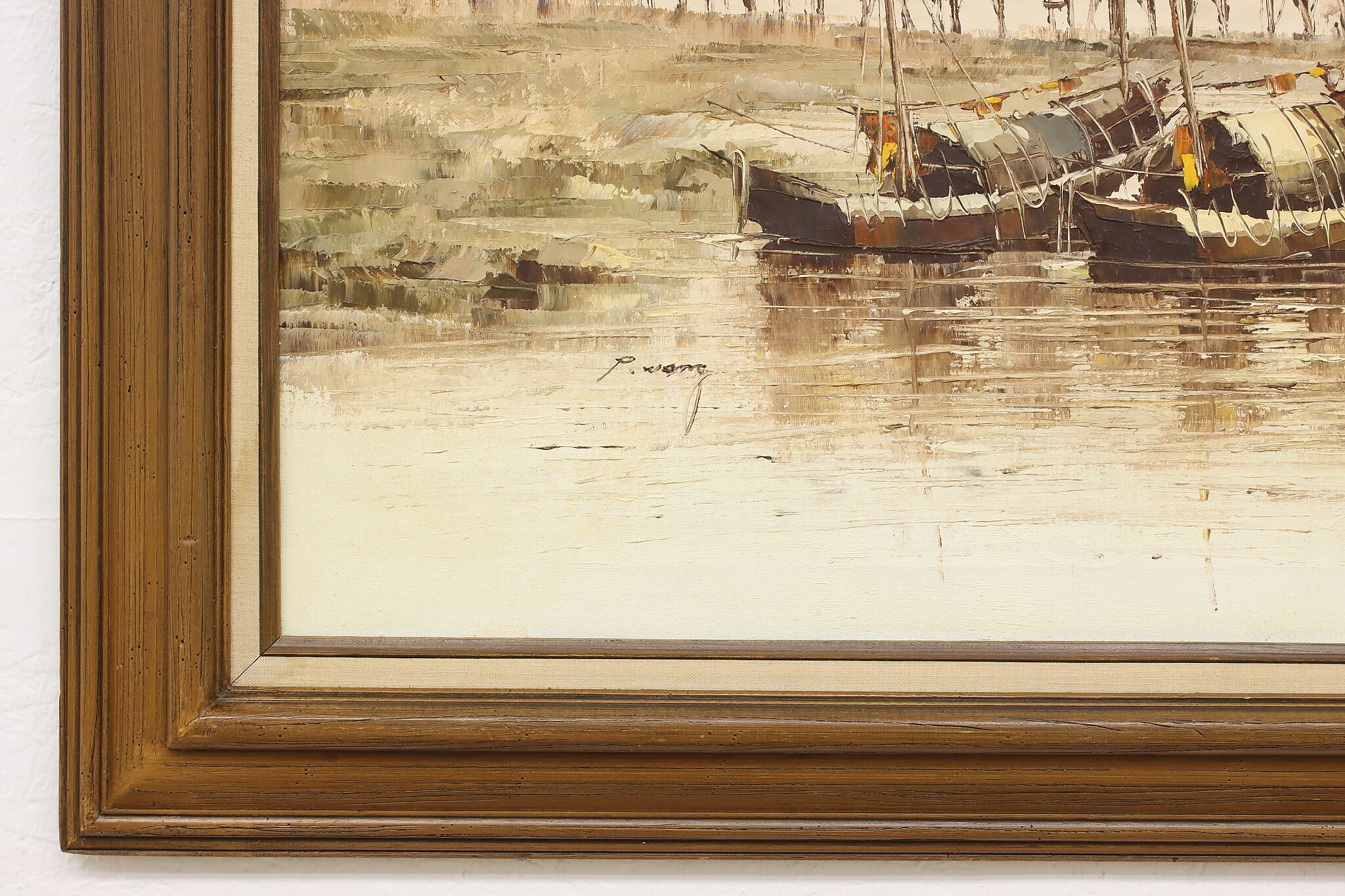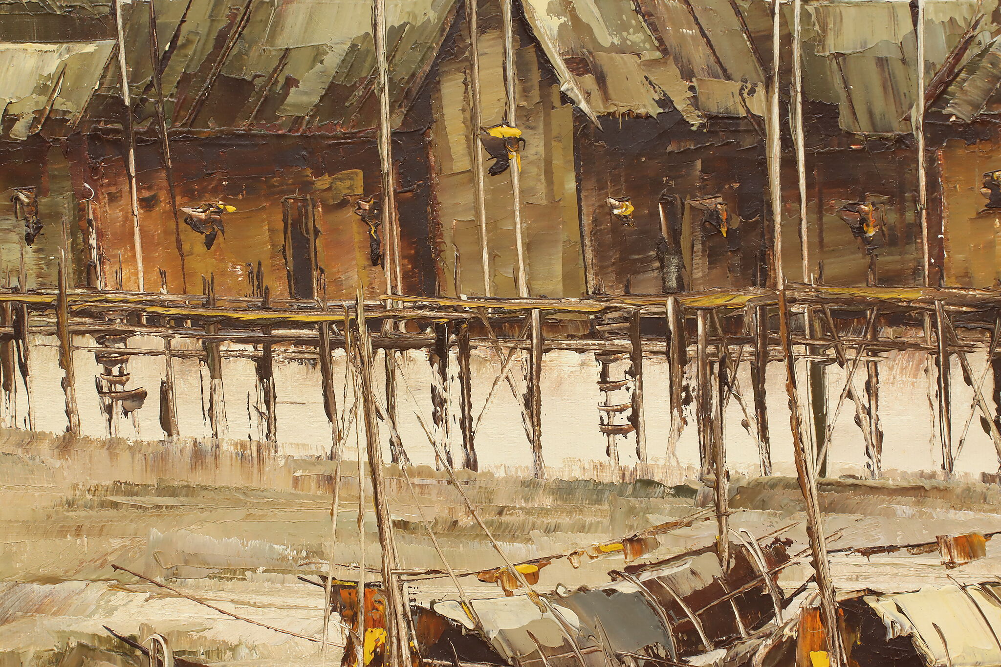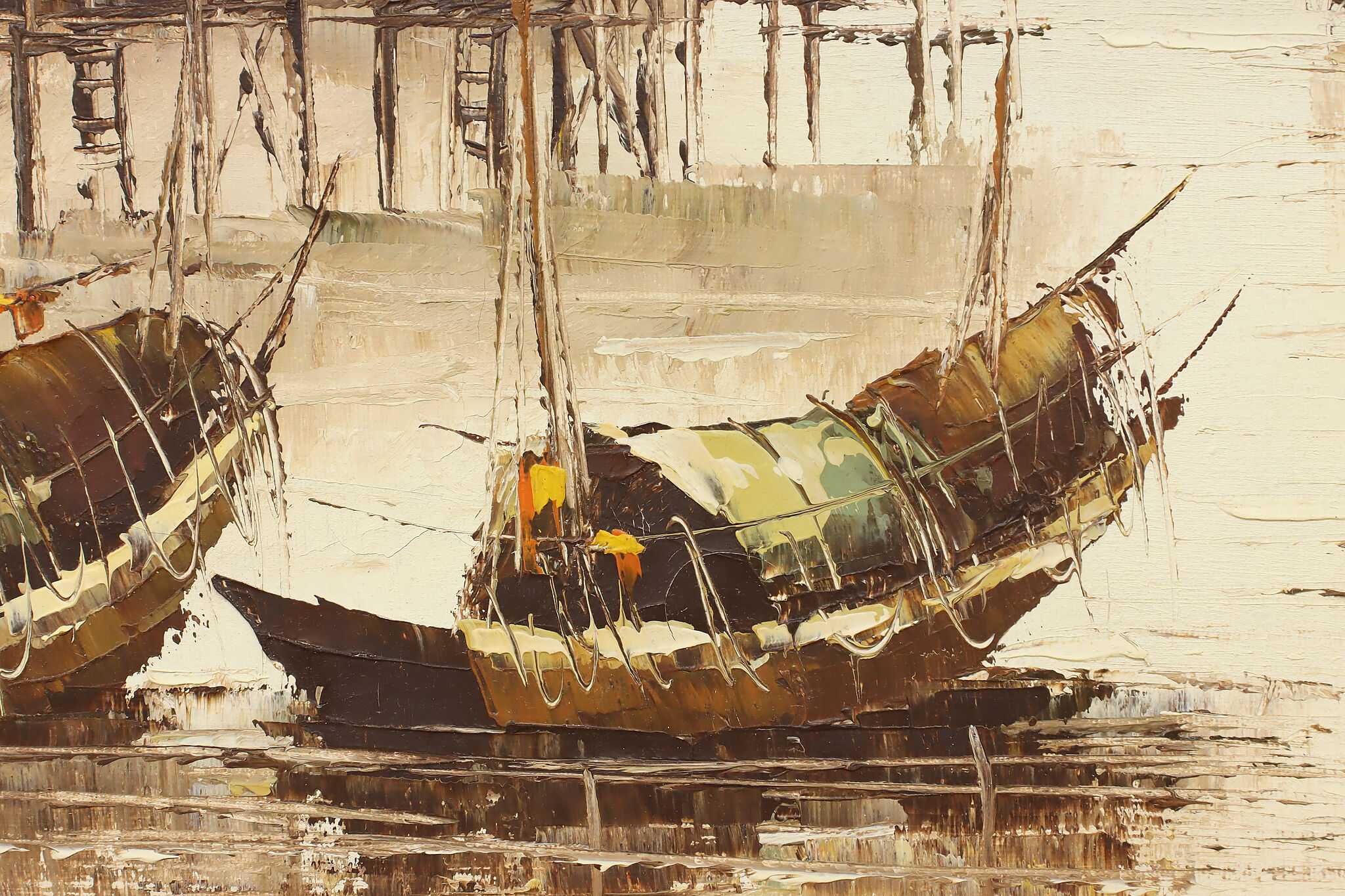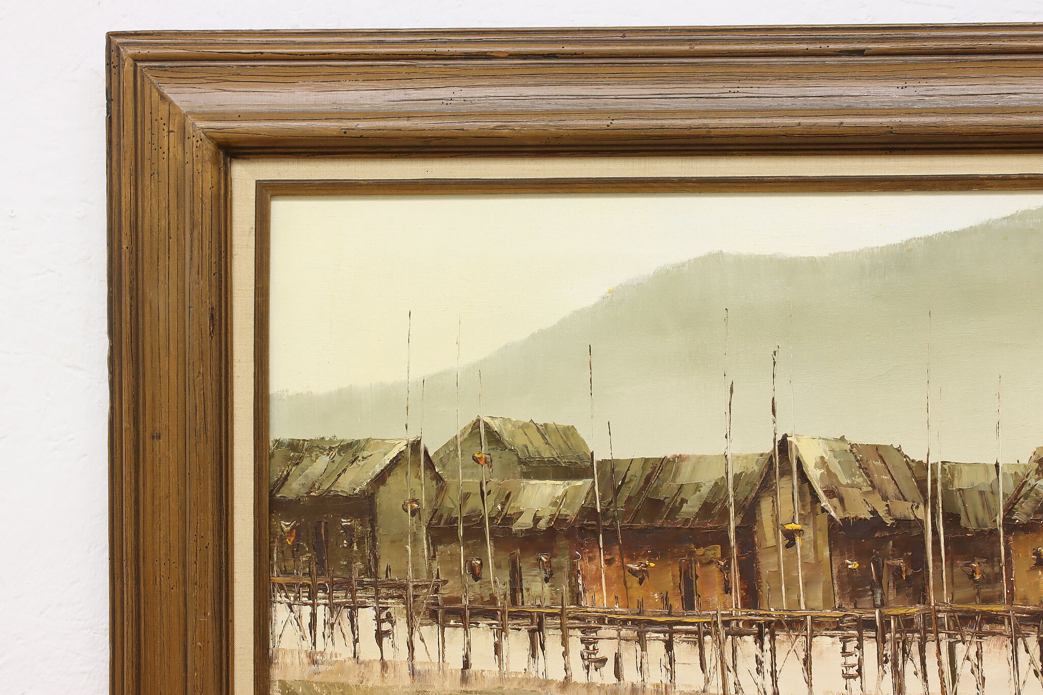 A foggy morning over a Chinese village on stilts with boats is the subject of this beautifully detailed painting.