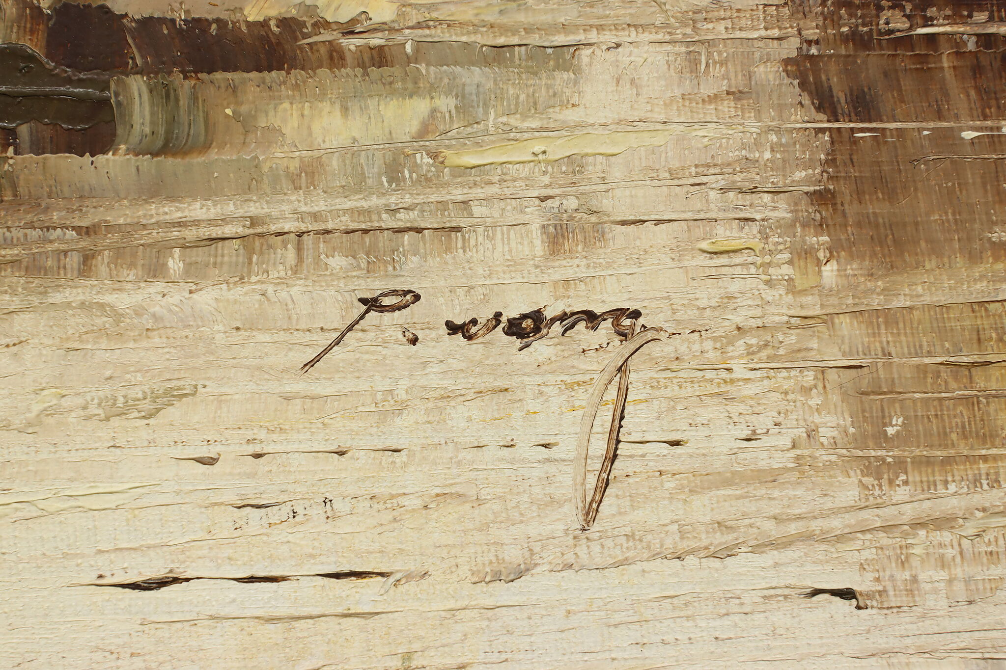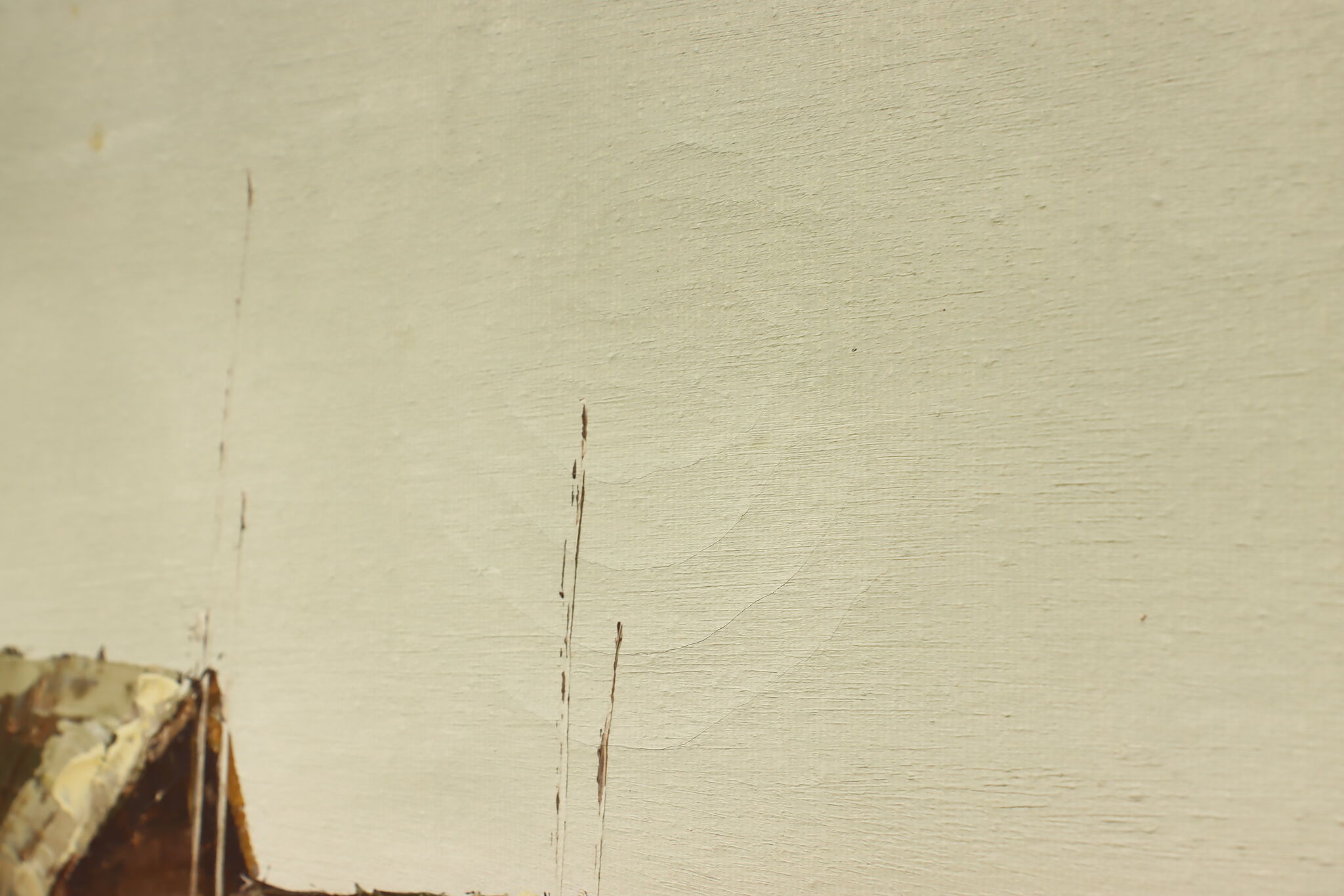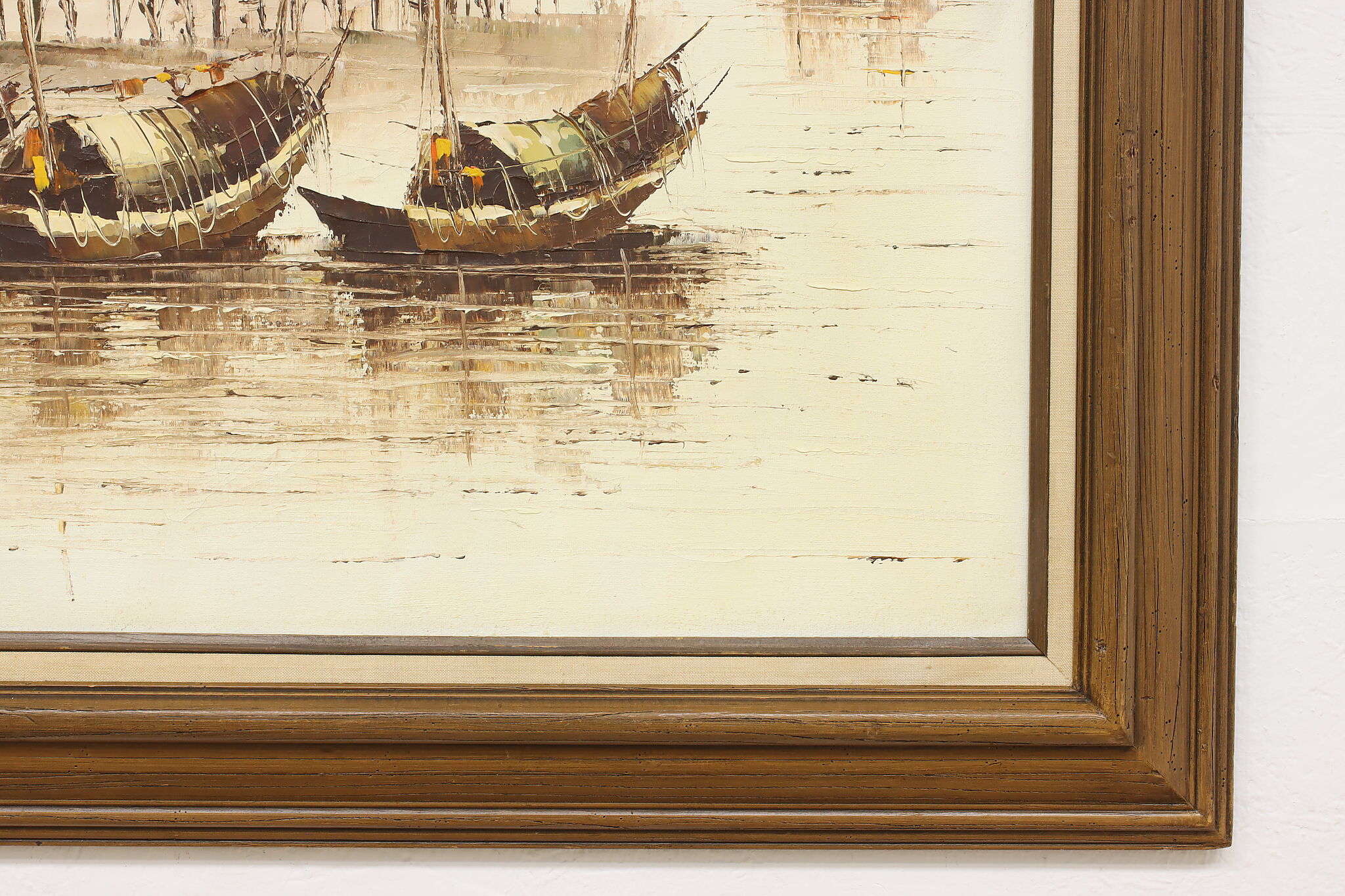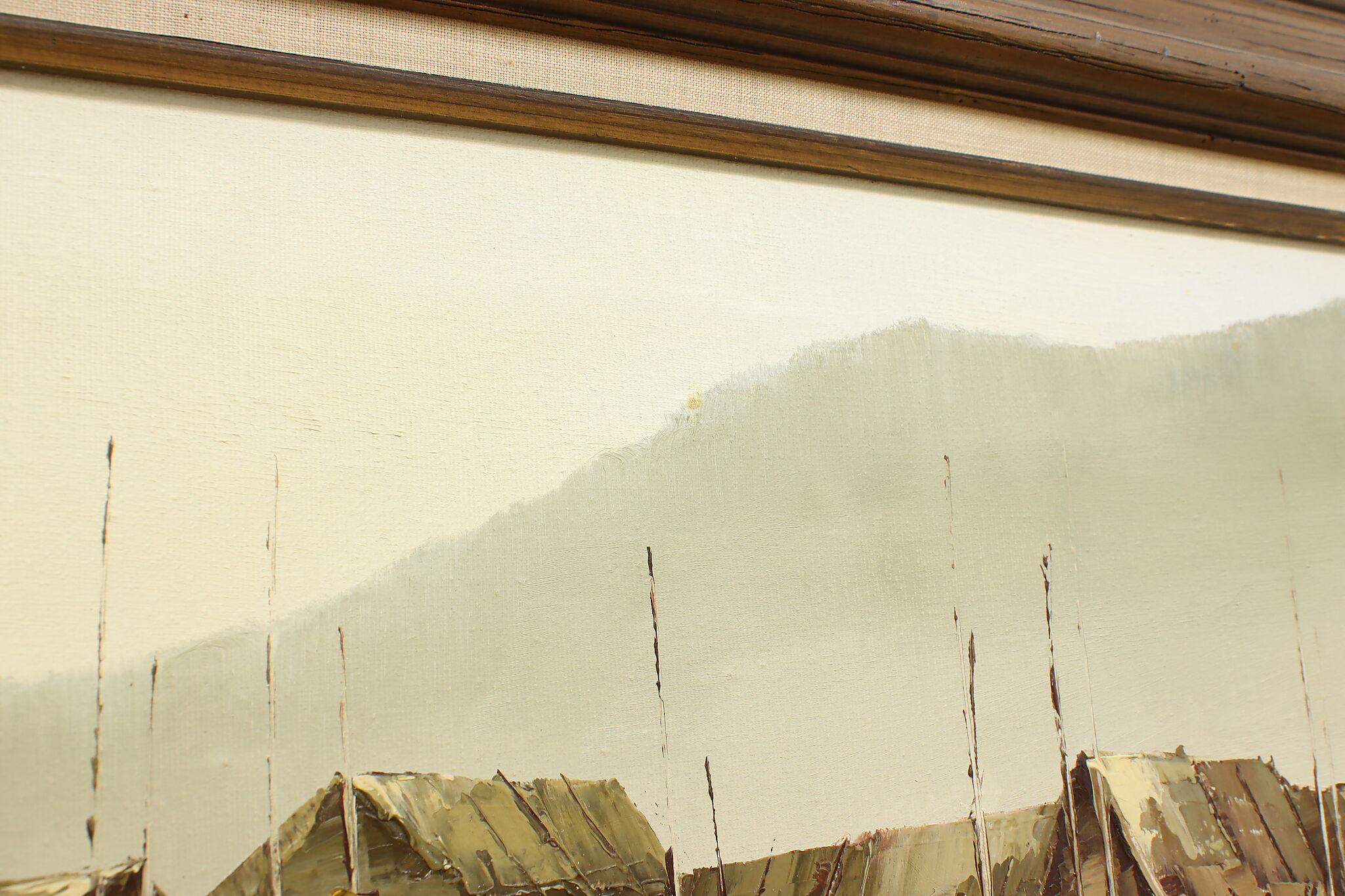 A foggy morning over a Chinese village on stilts with boats is the subject of this beautifully detailed painting.