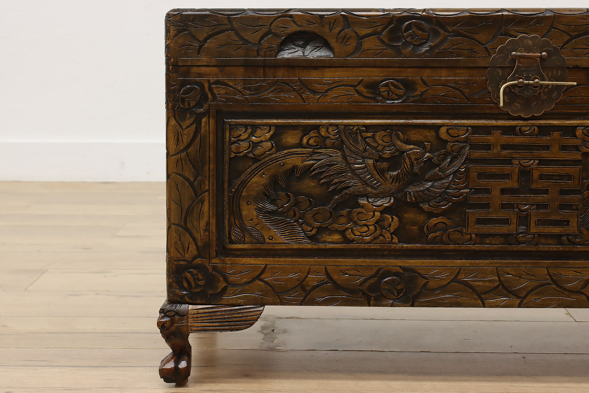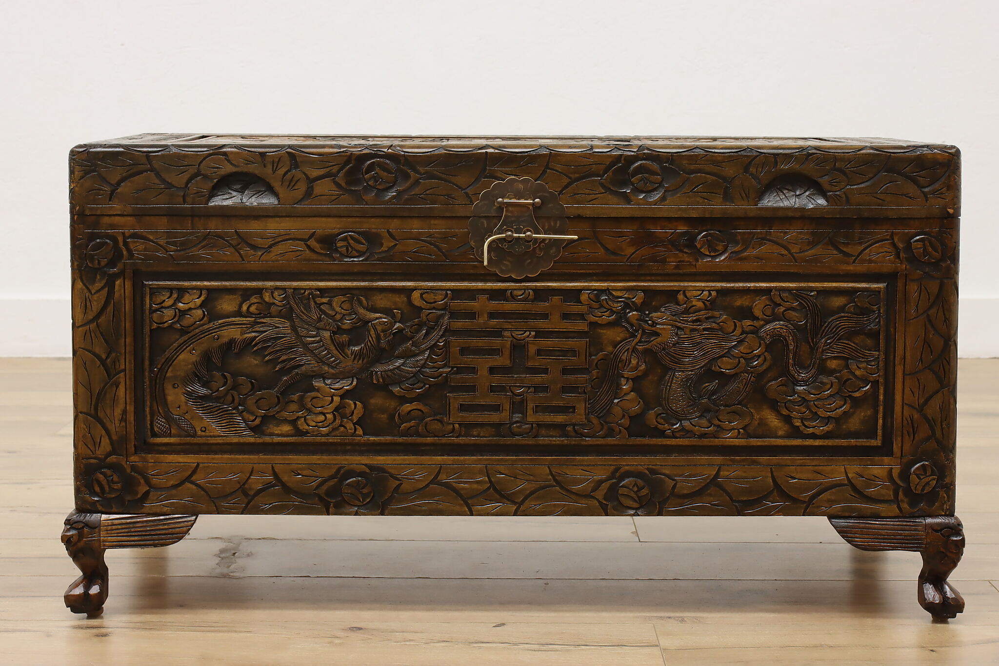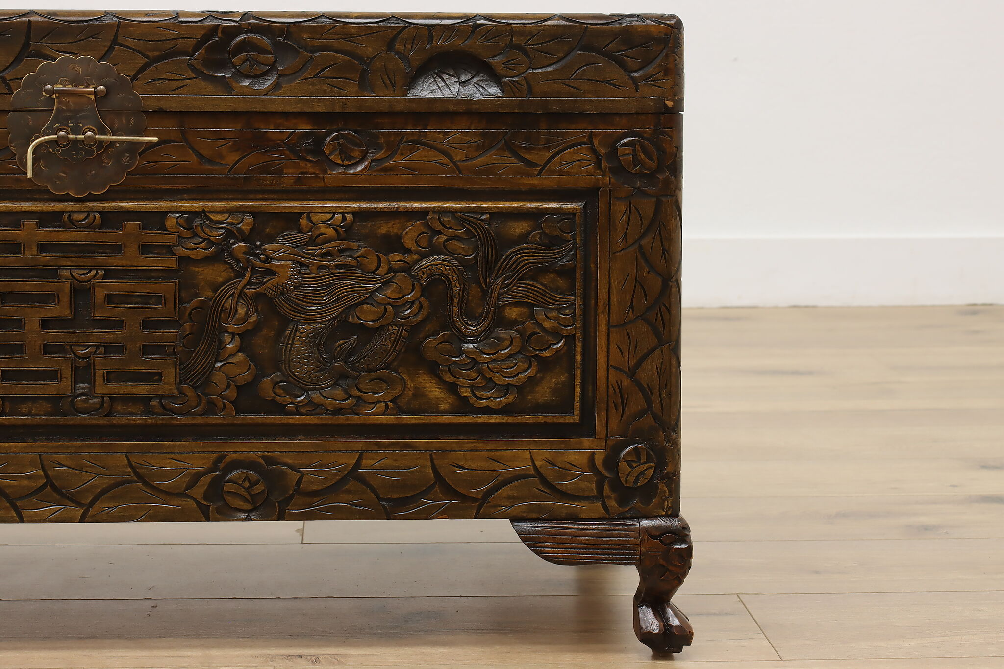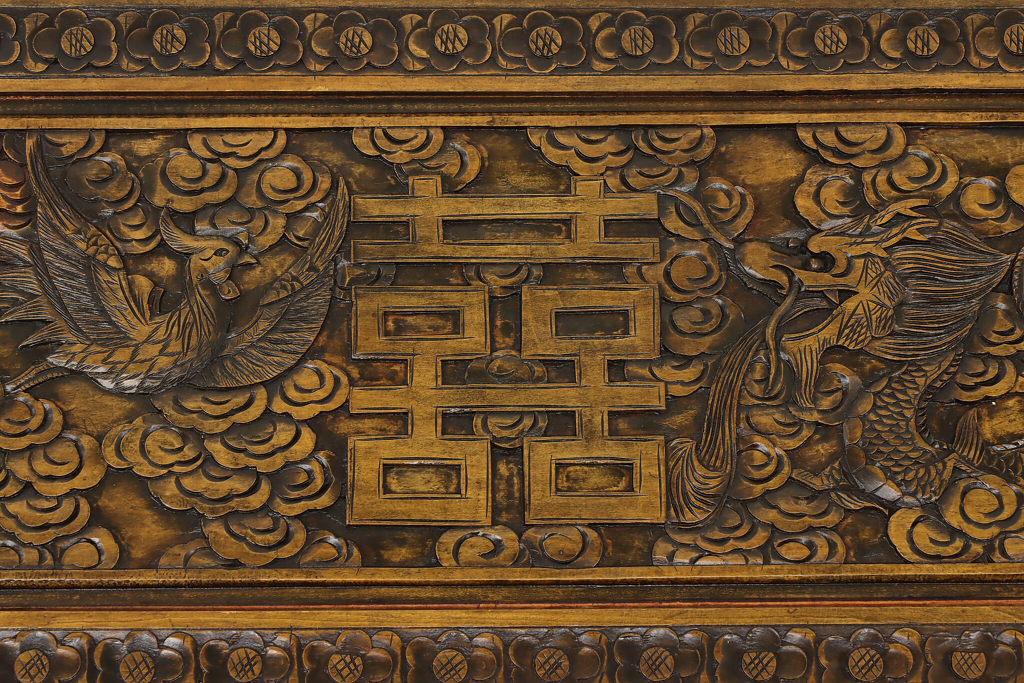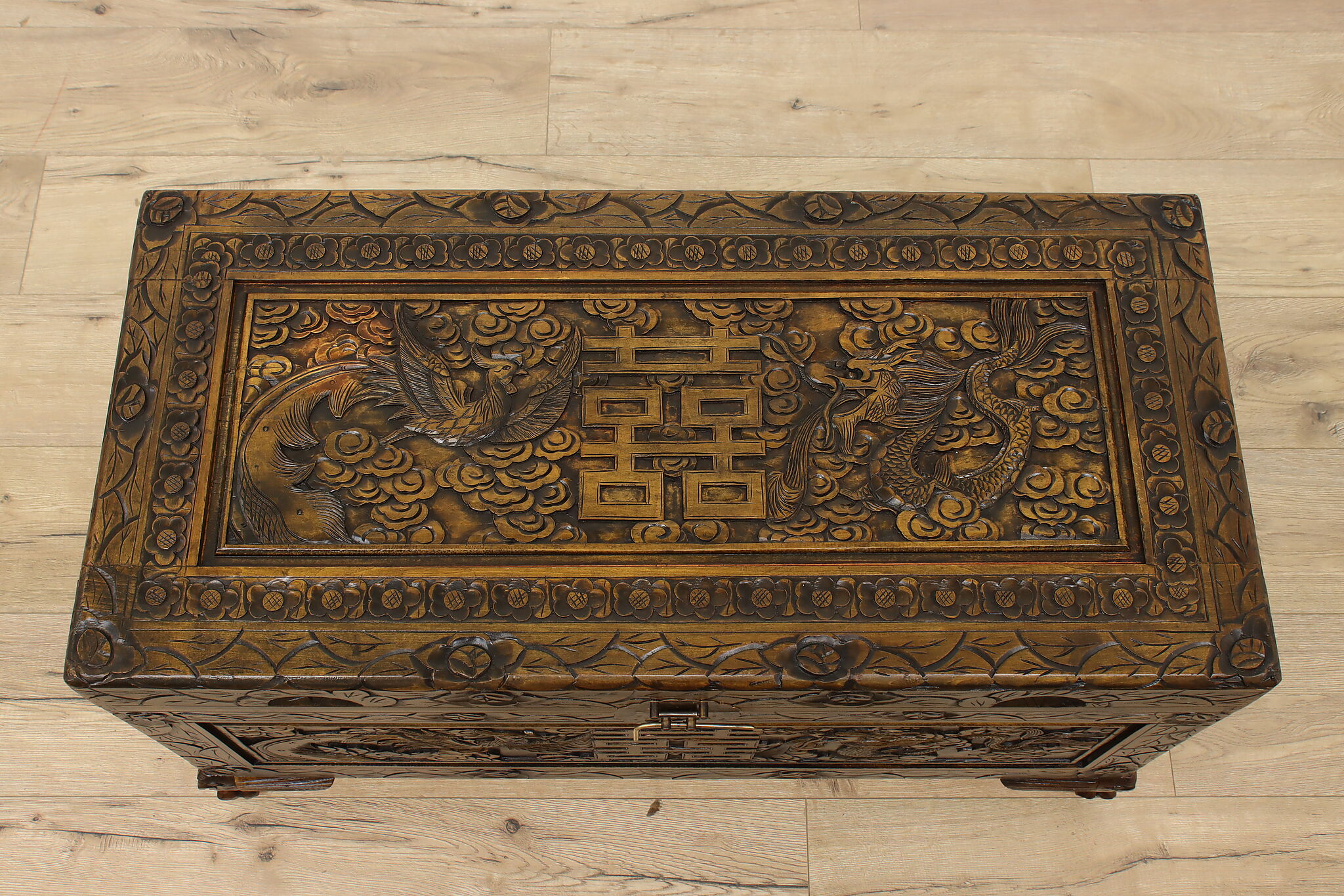 This blanket trunk or chest has fantastically carved dragons, phoenixes, and the Chinese symbol for double happiness. It's very possible that this trunk was given as a gift for a newlywed couple!