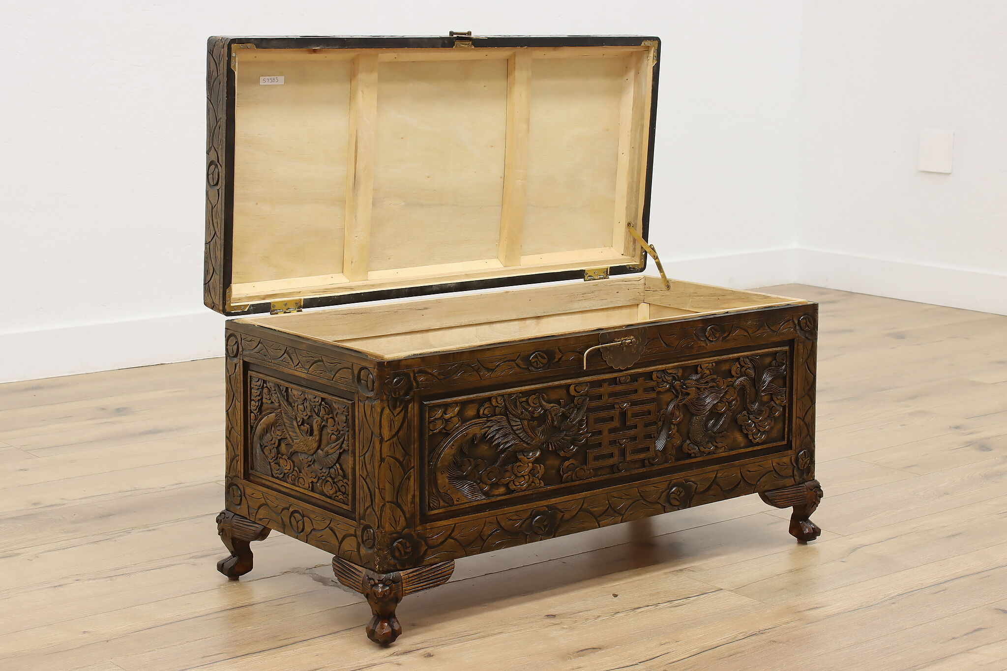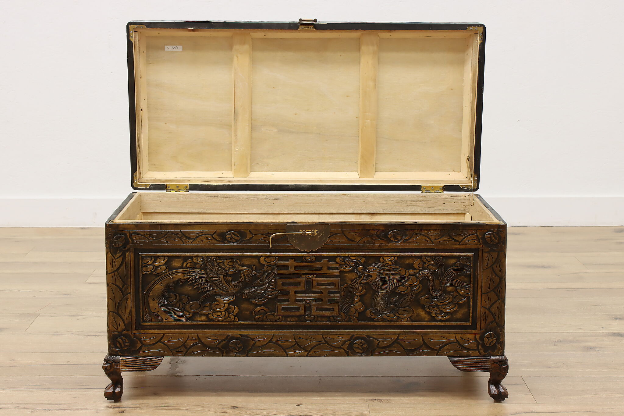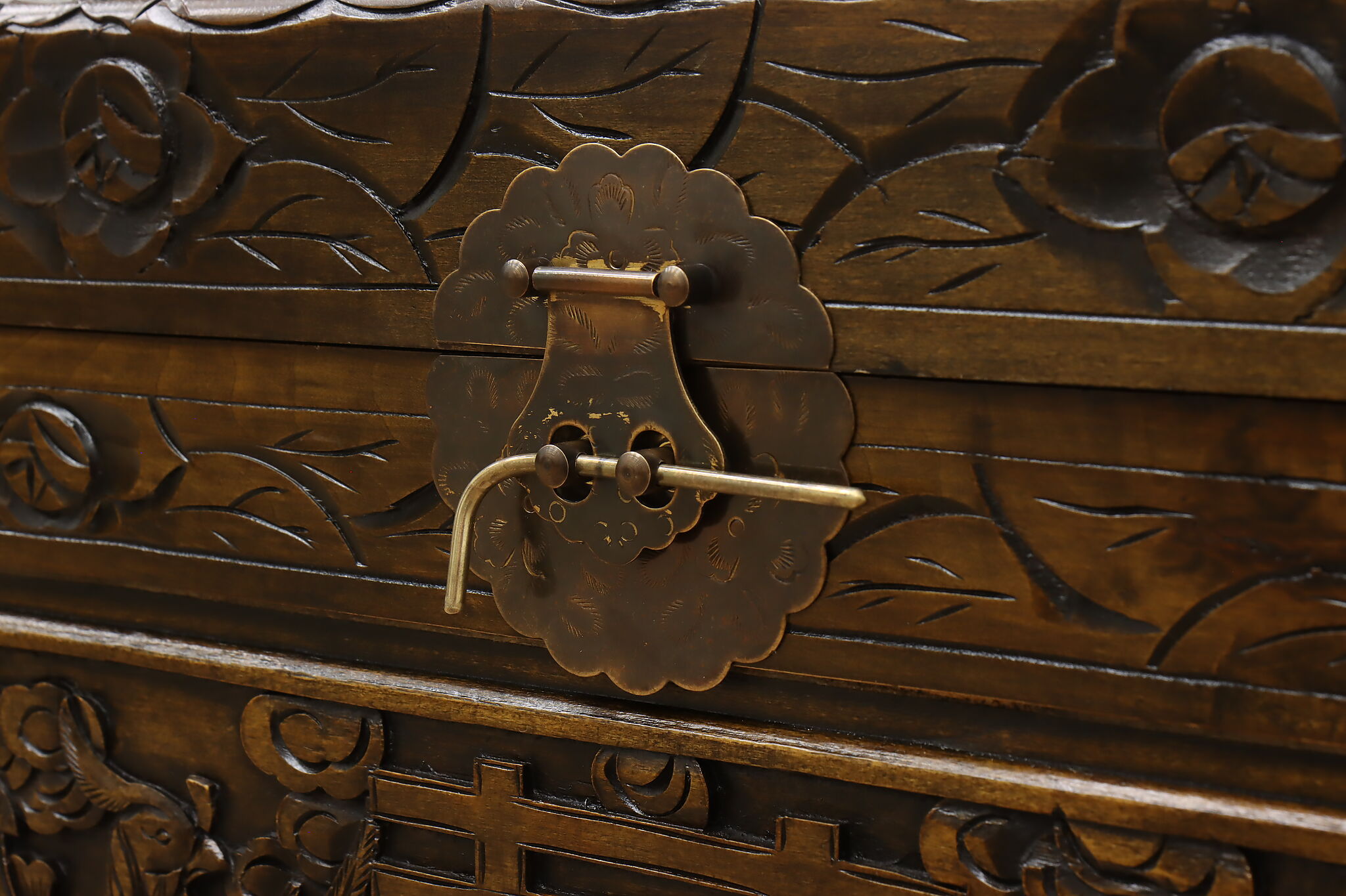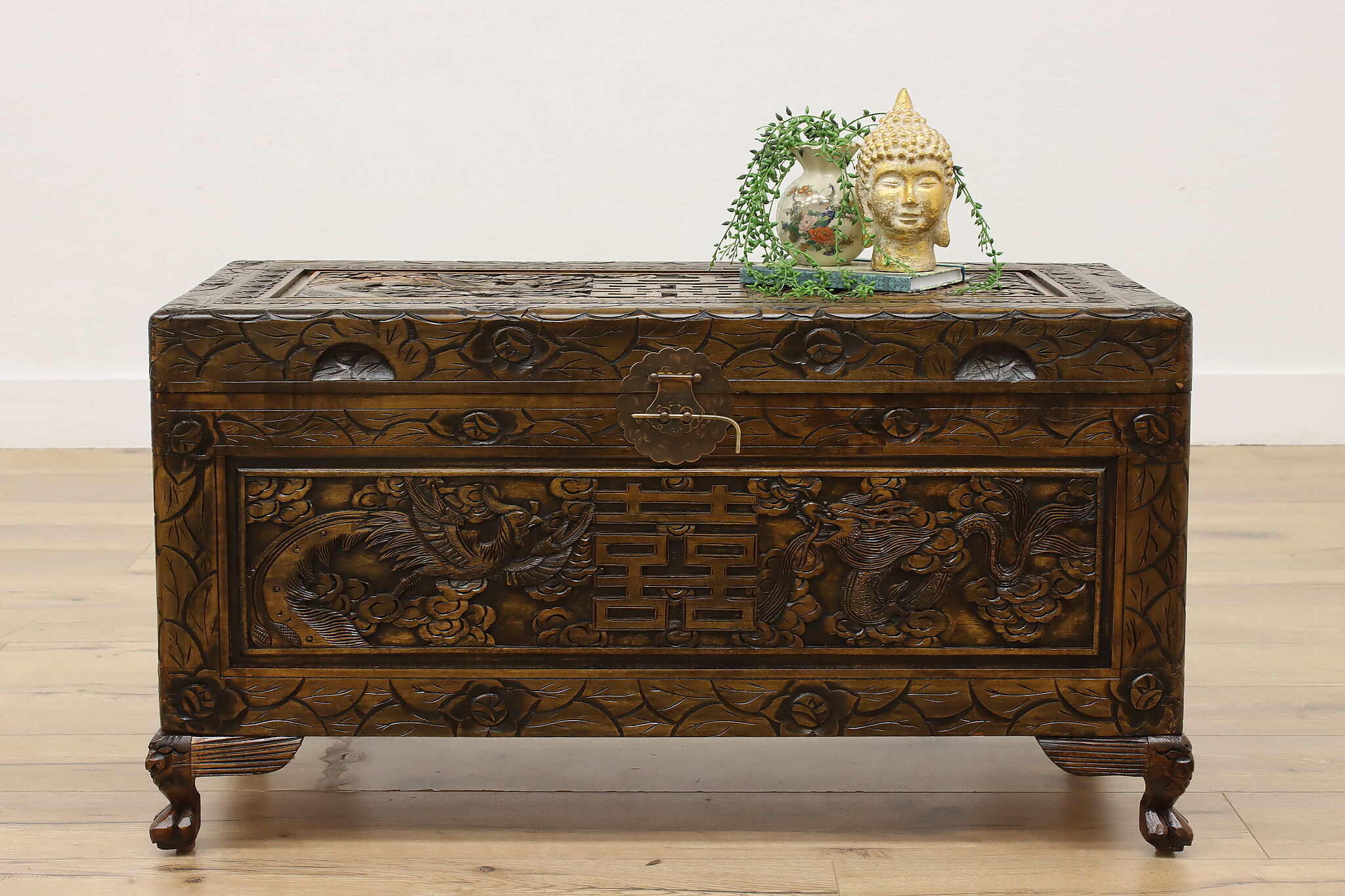 This blanket trunk or chest has fantastically carved dragons, phoenixes, and the Chinese symbol for double happiness. It's very possible that this trunk was given as a gift for a newlywed couple!