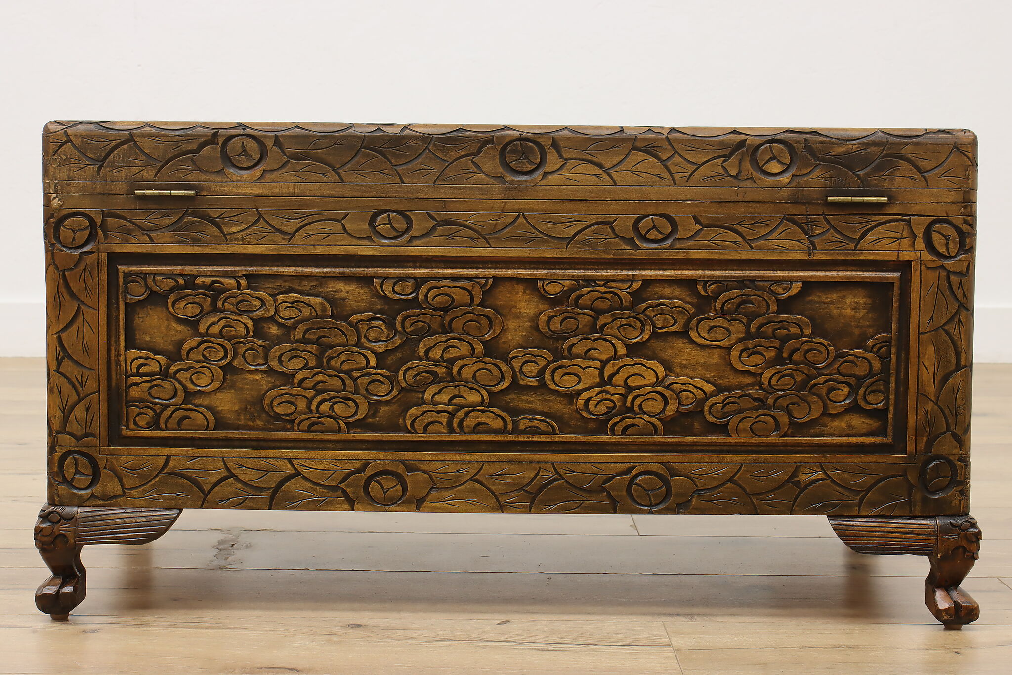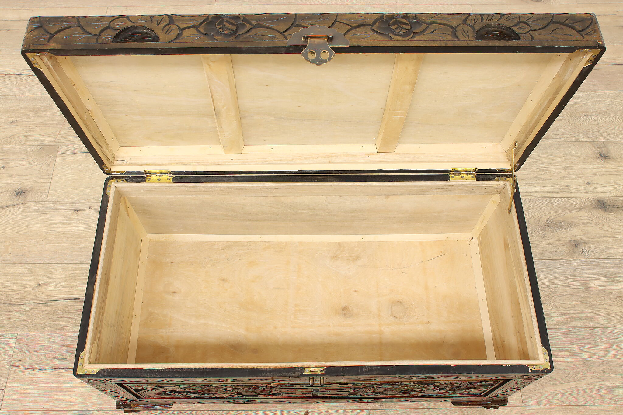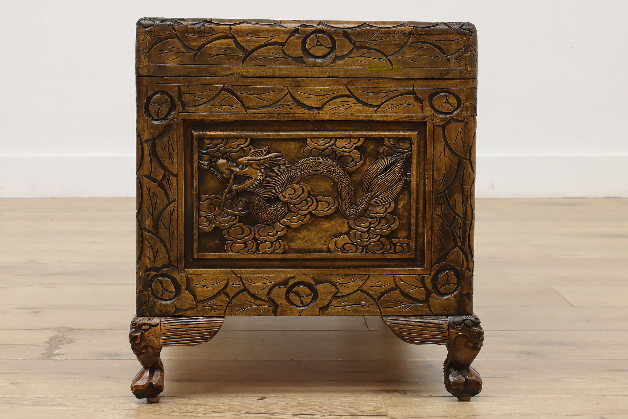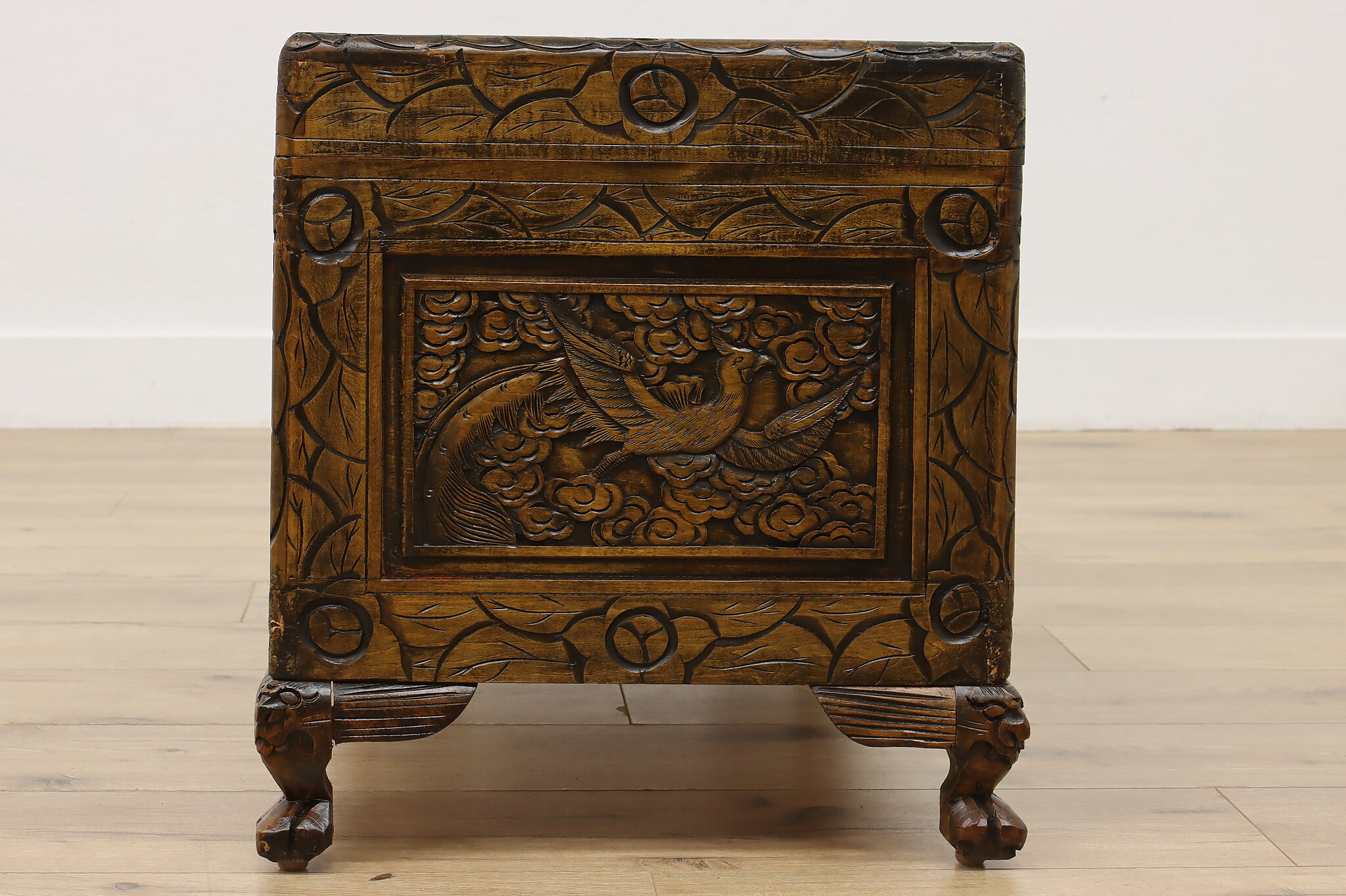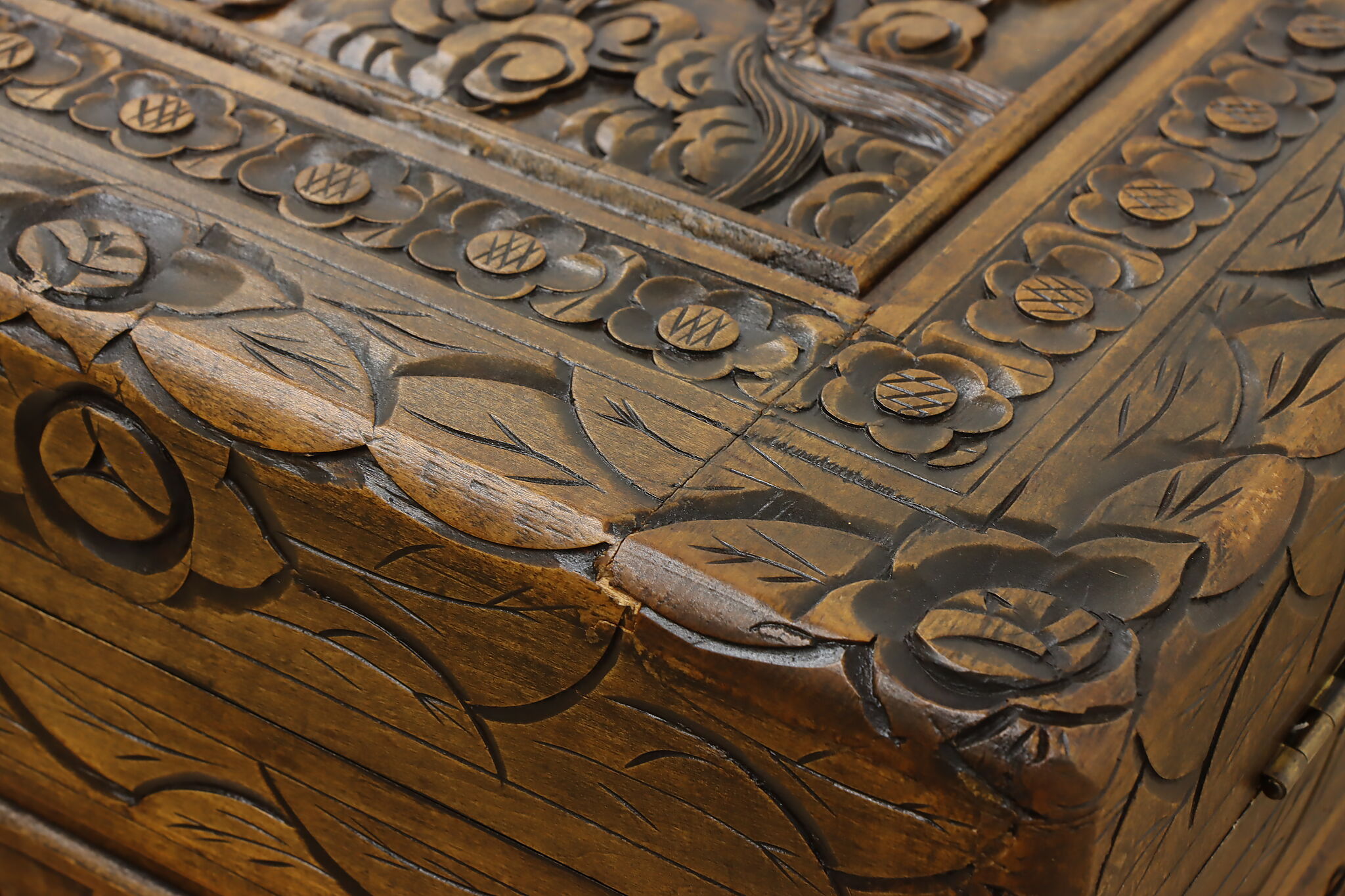 This blanket trunk or chest has fantastically carved dragons, phoenixes, and the Chinese symbol for double happiness. It's very possible that this trunk was given as a gift for a newlywed couple!