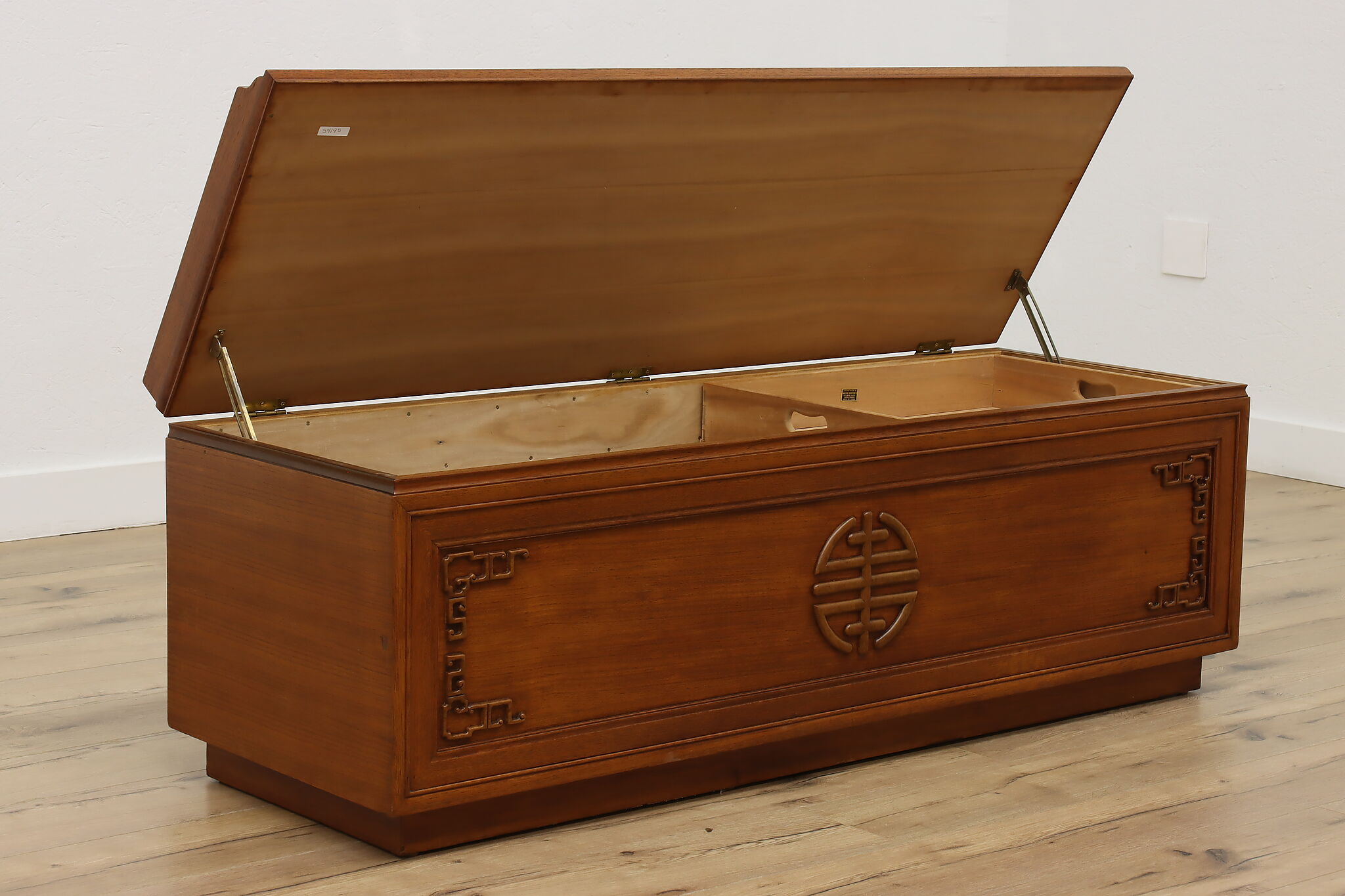 This blanket chest or trunk doubles as a bench and includes a pink upholstered cushion.