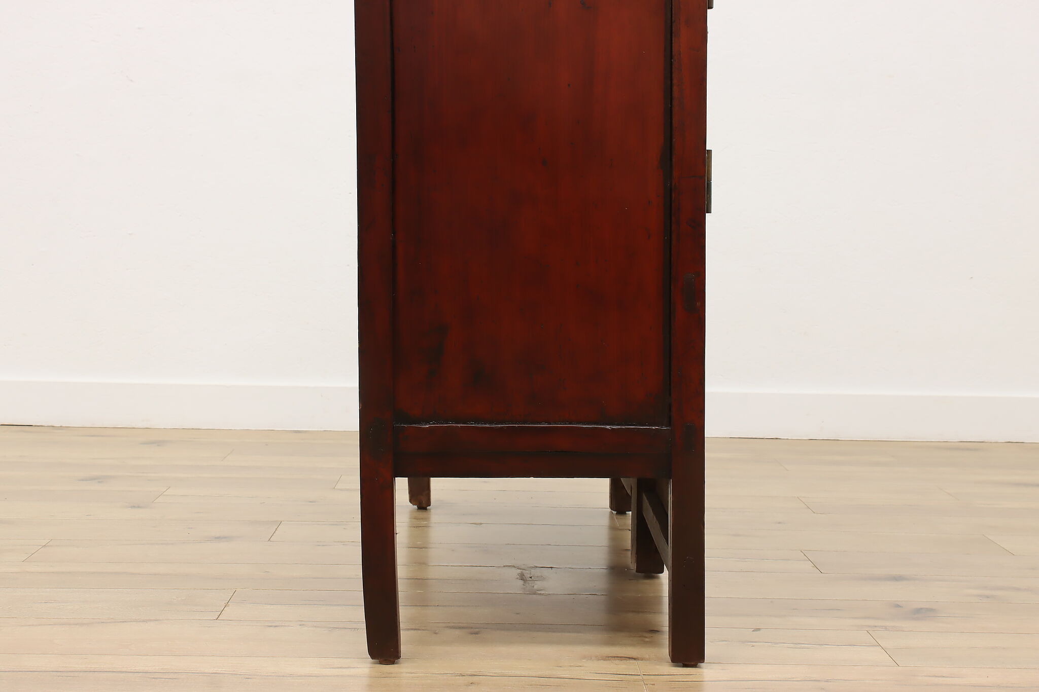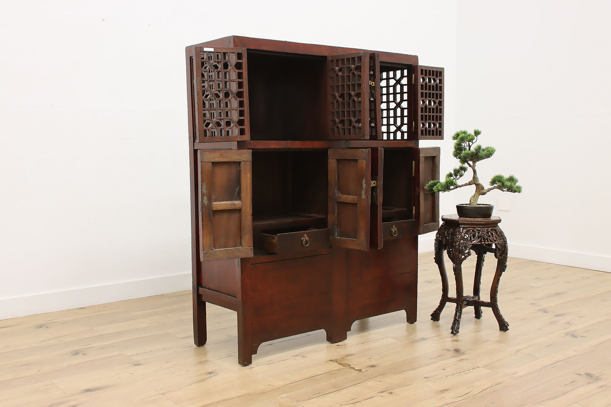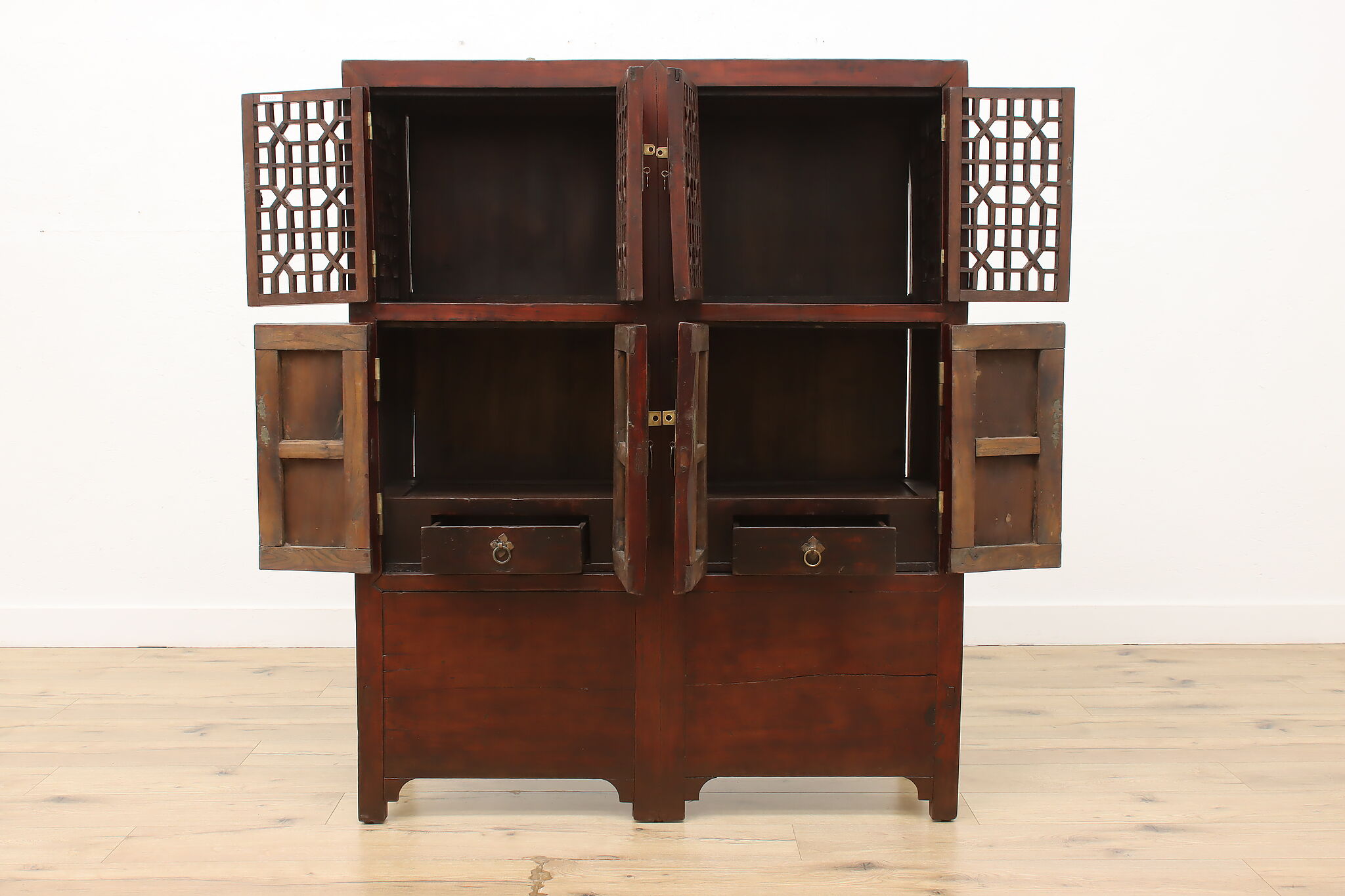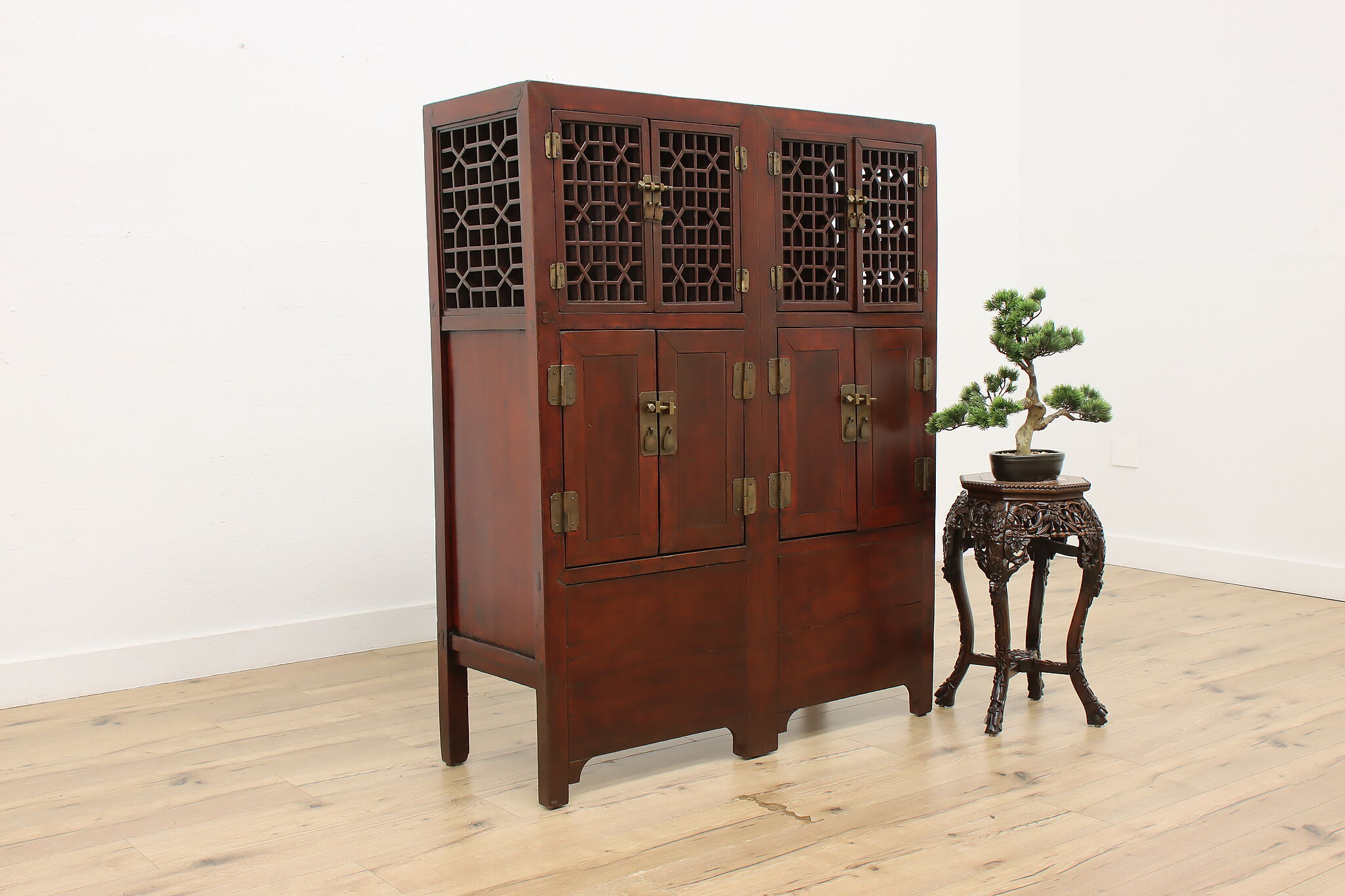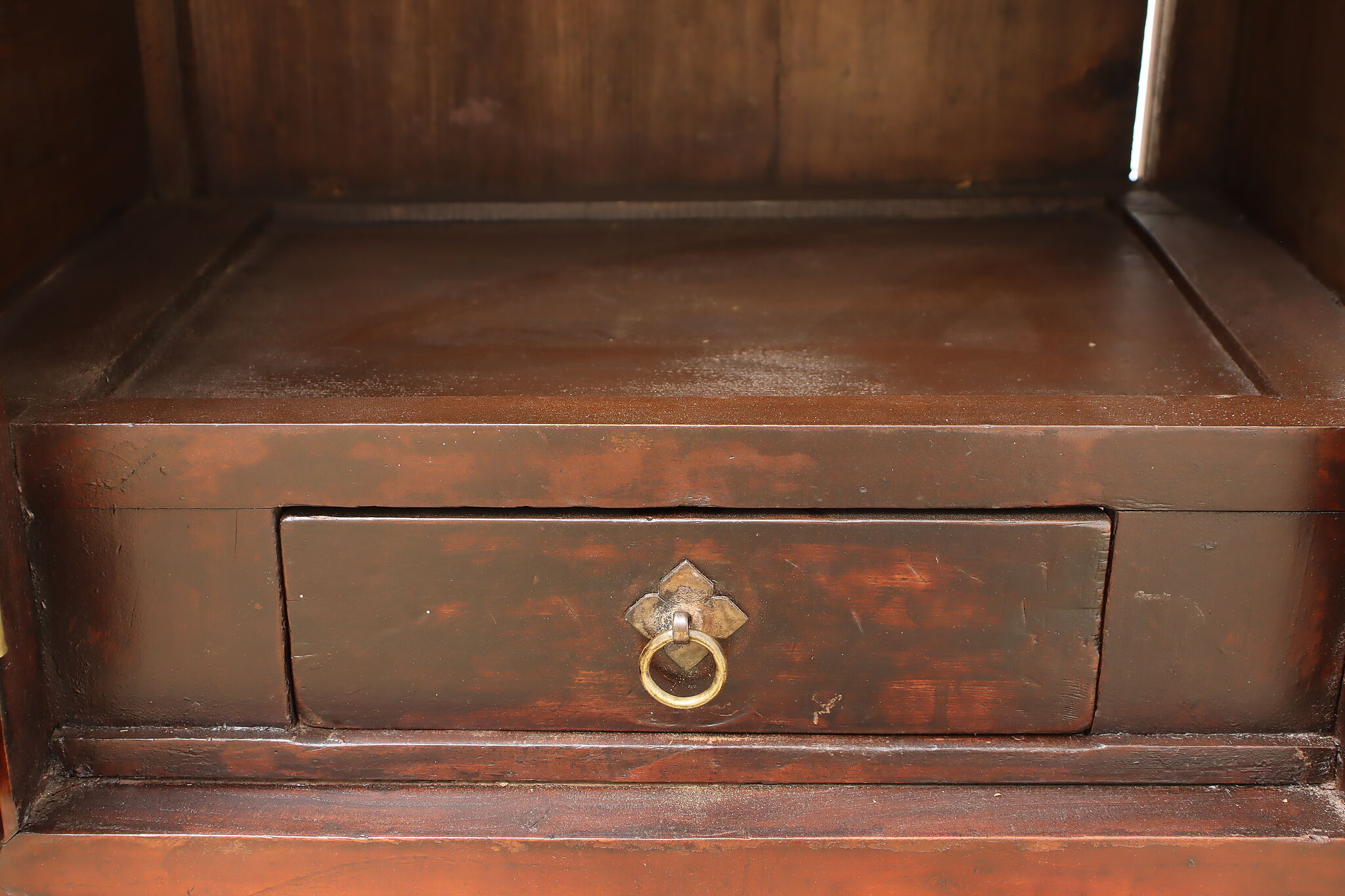 A charmingly rustic Asian design cabinet has plenty of space for books, statues, art pieces, and even liquors!