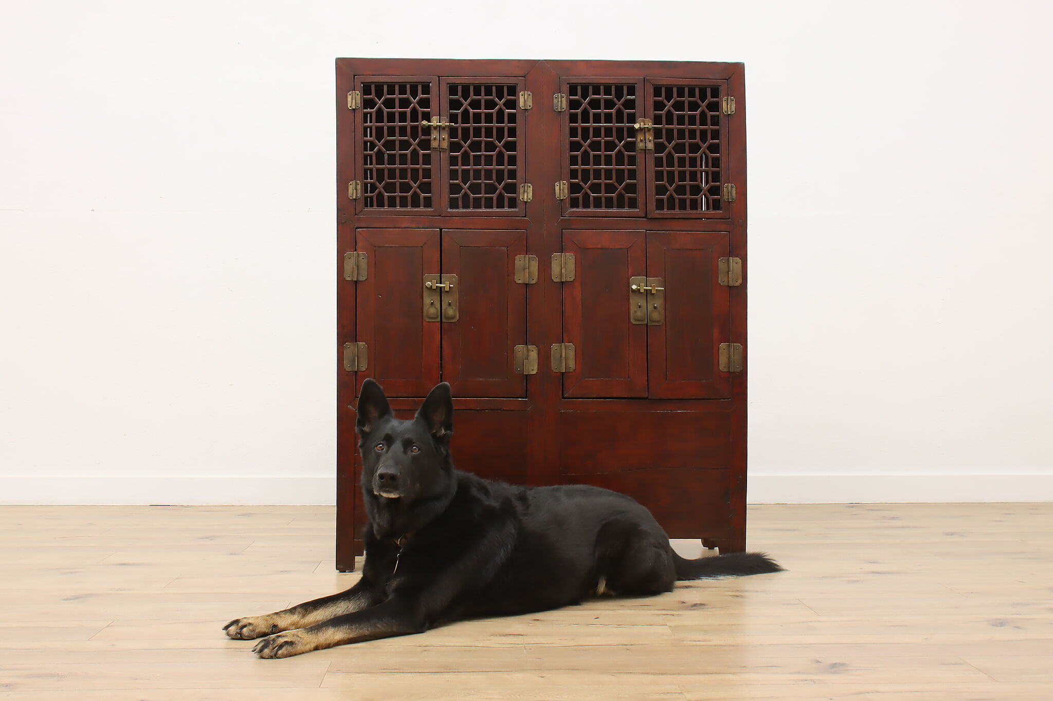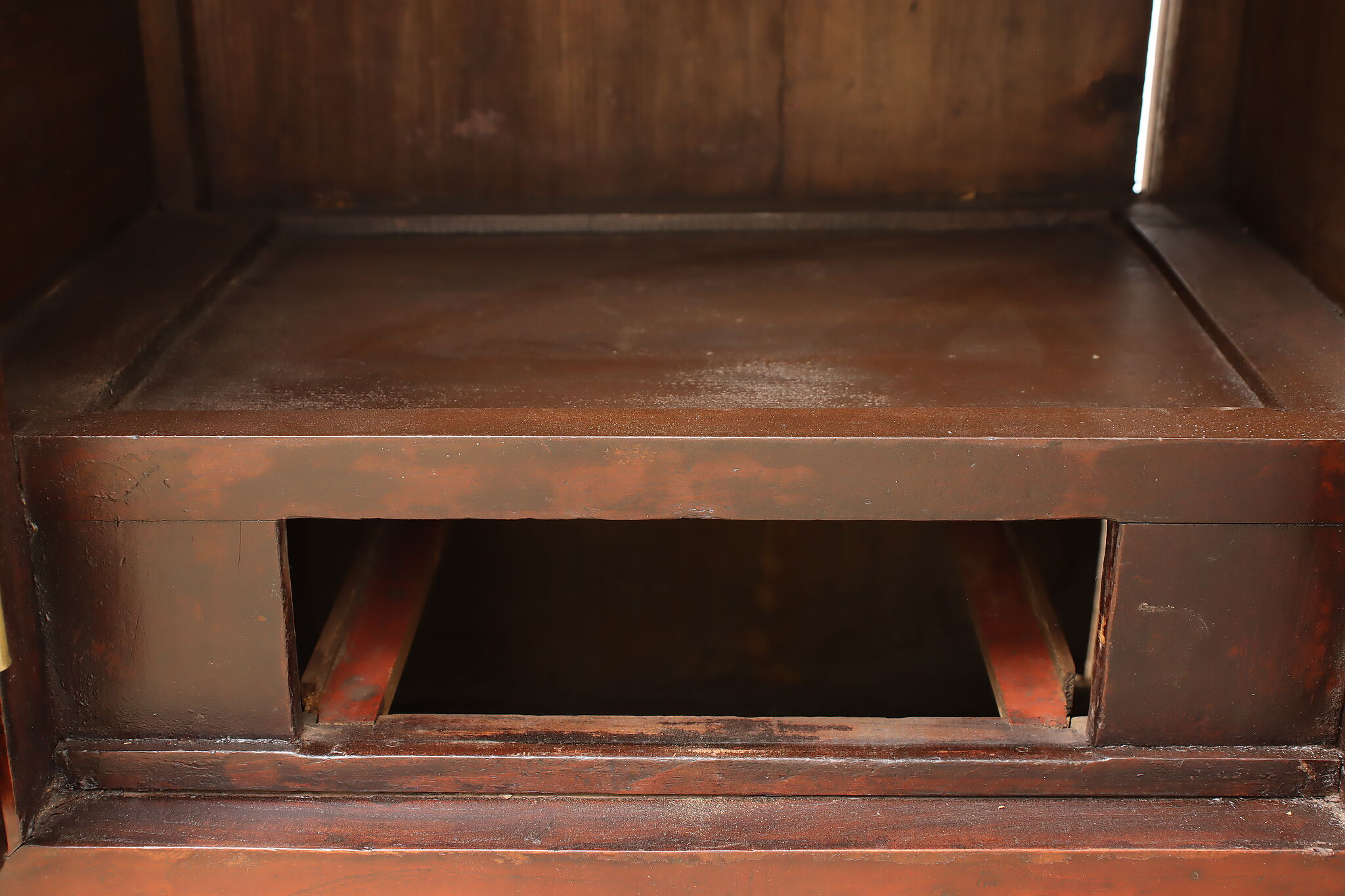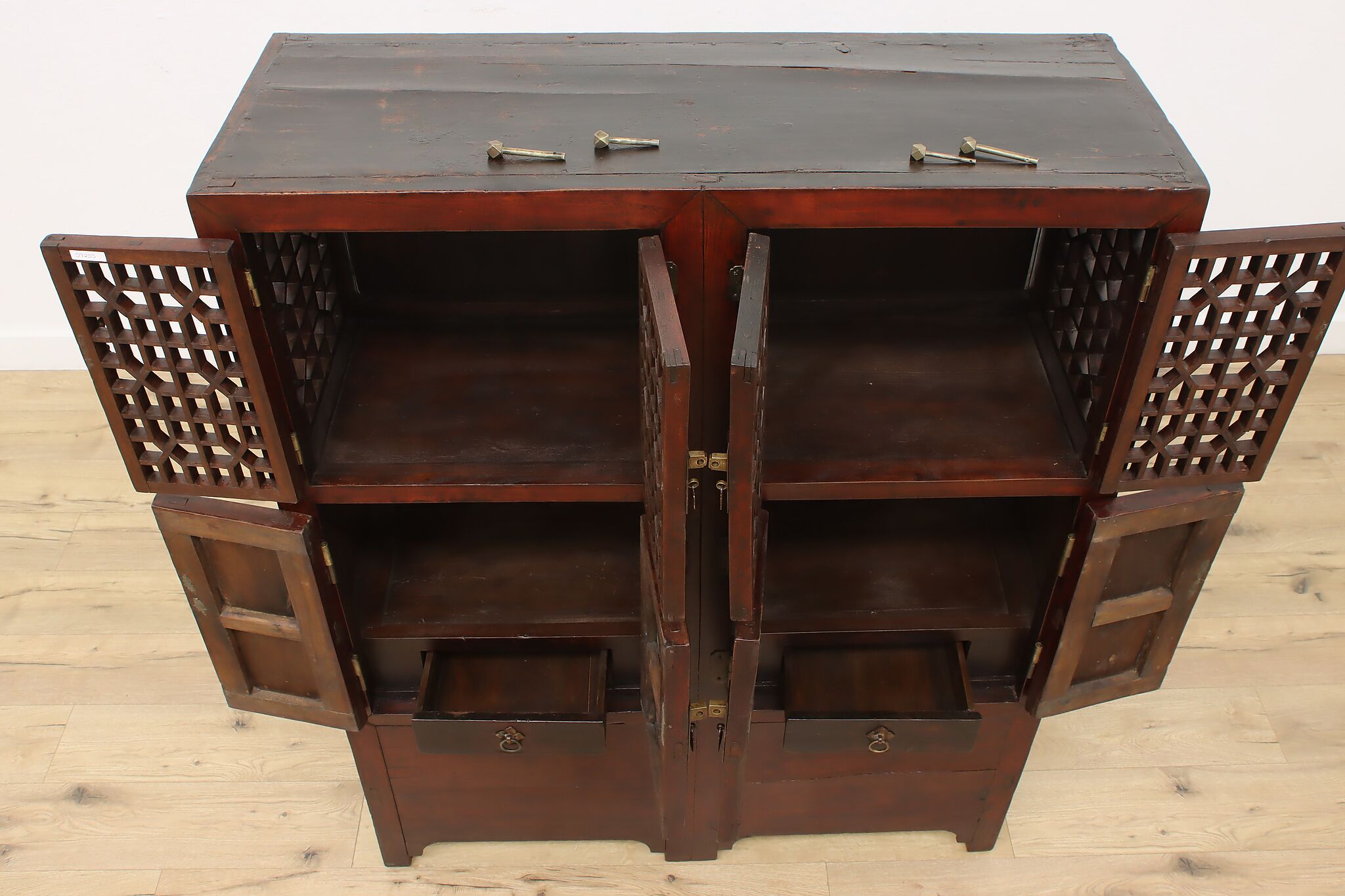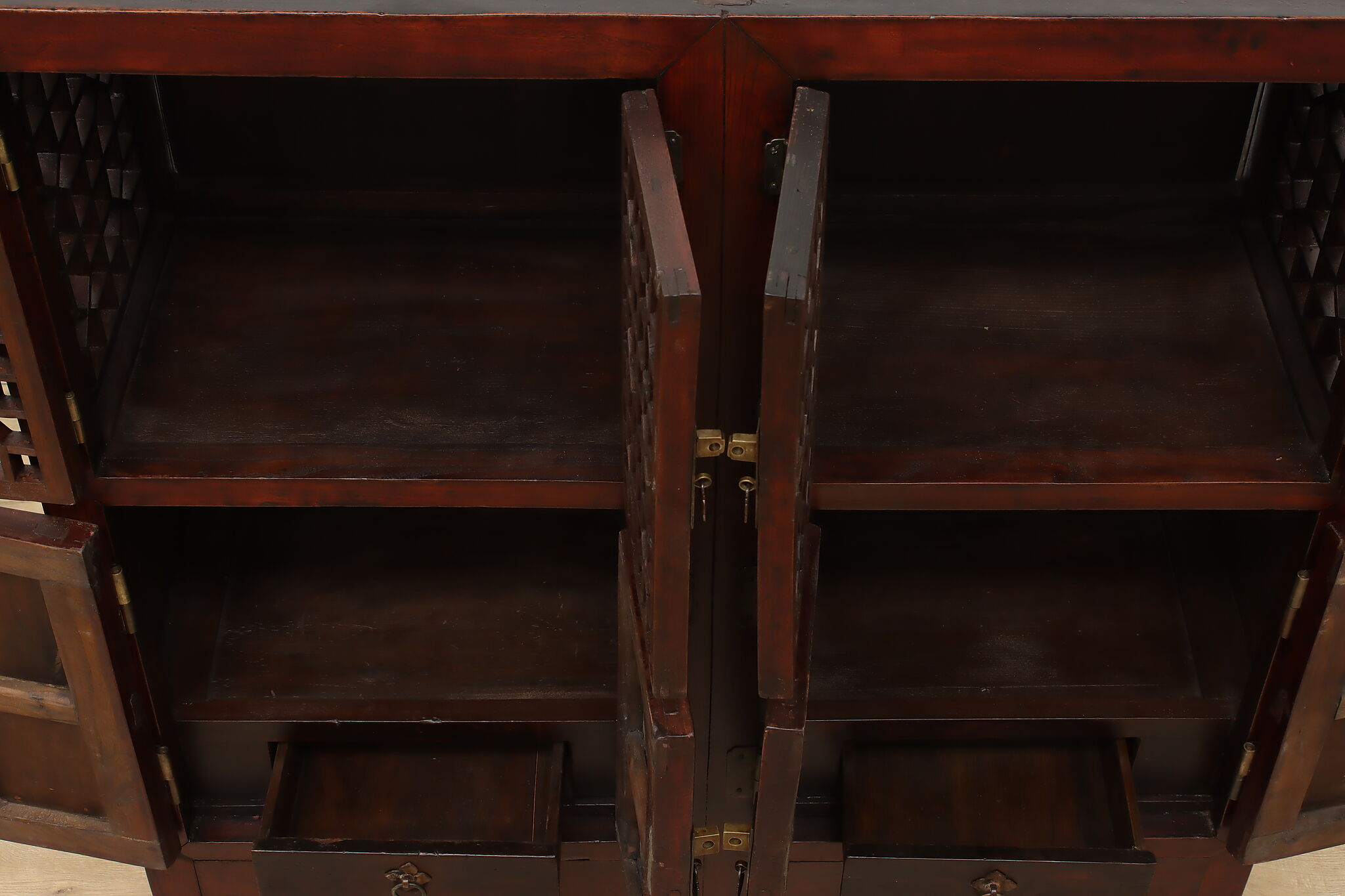 A charmingly rustic Asian design cabinet has plenty of space for books, statues, art pieces, and even liquors!