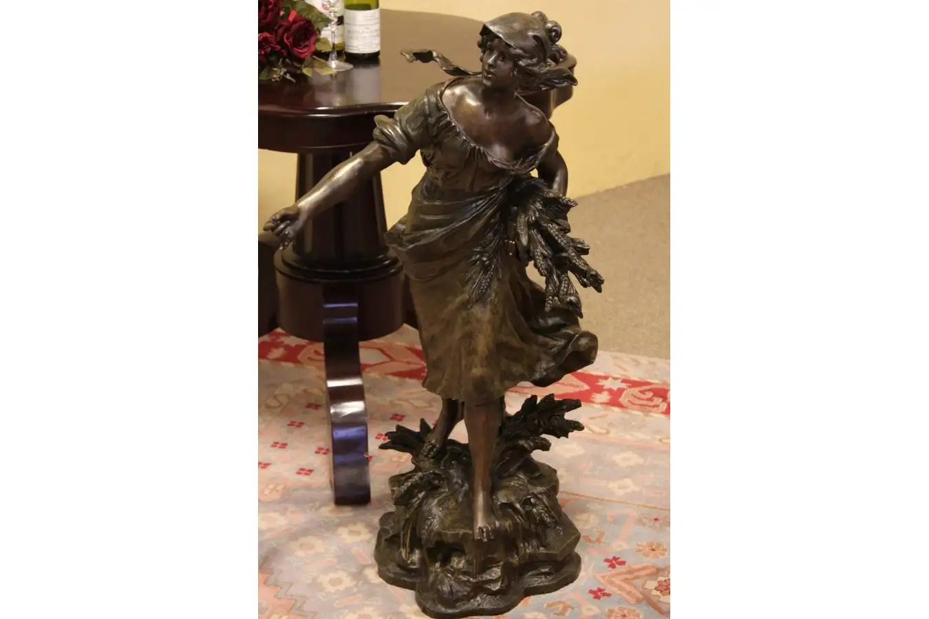 This naturalistic sculpture of "Fanueuse" or a Haymaker is signed by famous French artist, "Aug(ust) Moreau." An authentic antique work of art dating from the 1890's, this beautiful young woman is presented in motion, unselfconscious, as she gathers hay, fanning it out to dry.