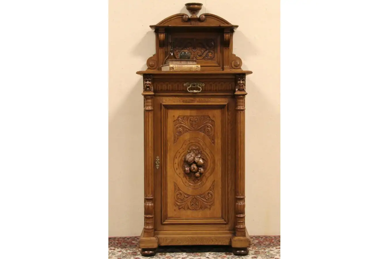 Hand carved in Austria about 1890 of solid oak with fruit, this classical cabinet has many uses. The top has been revarnished for durability, the rest has an original finish that is extremely well preserved.