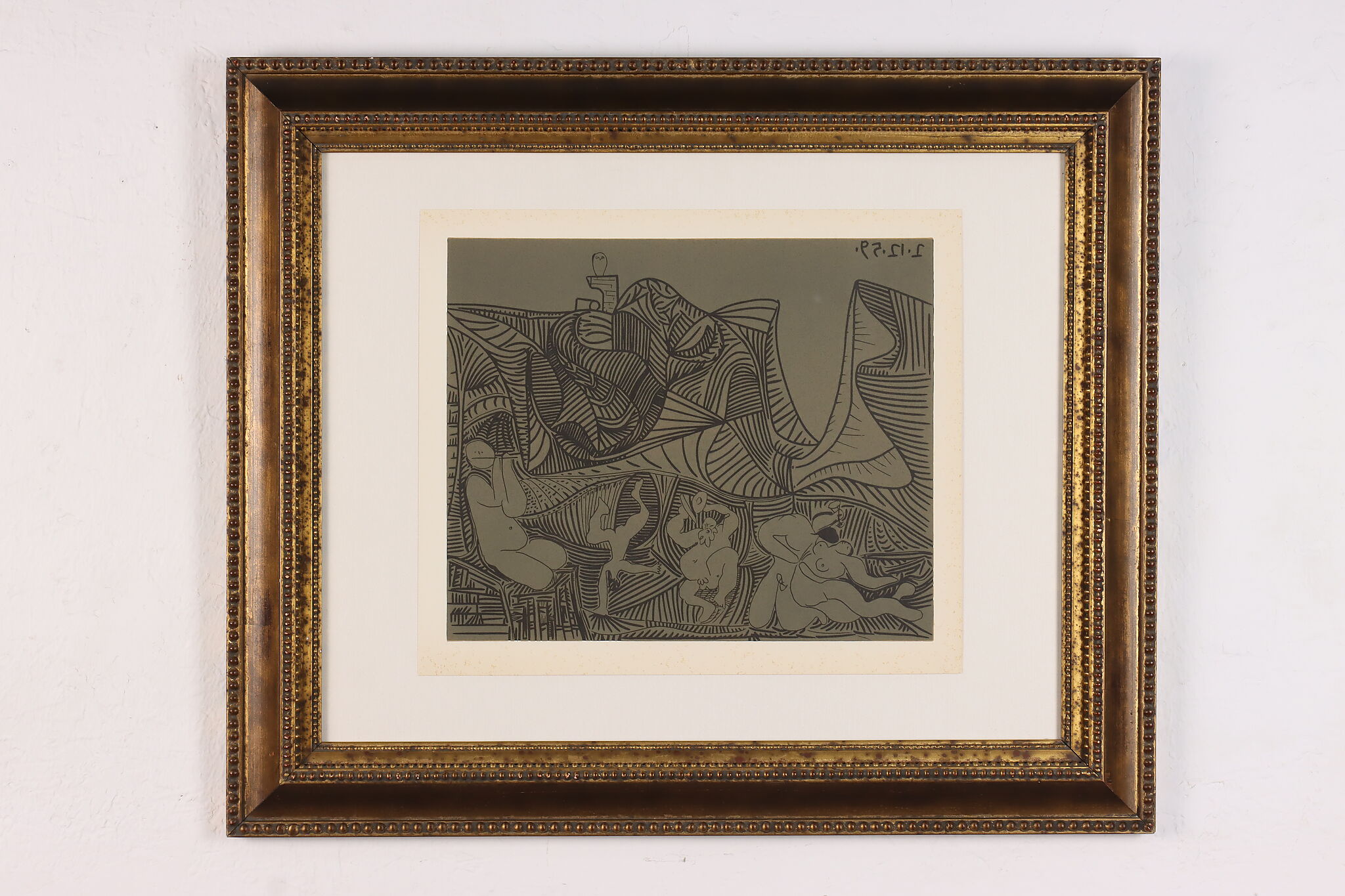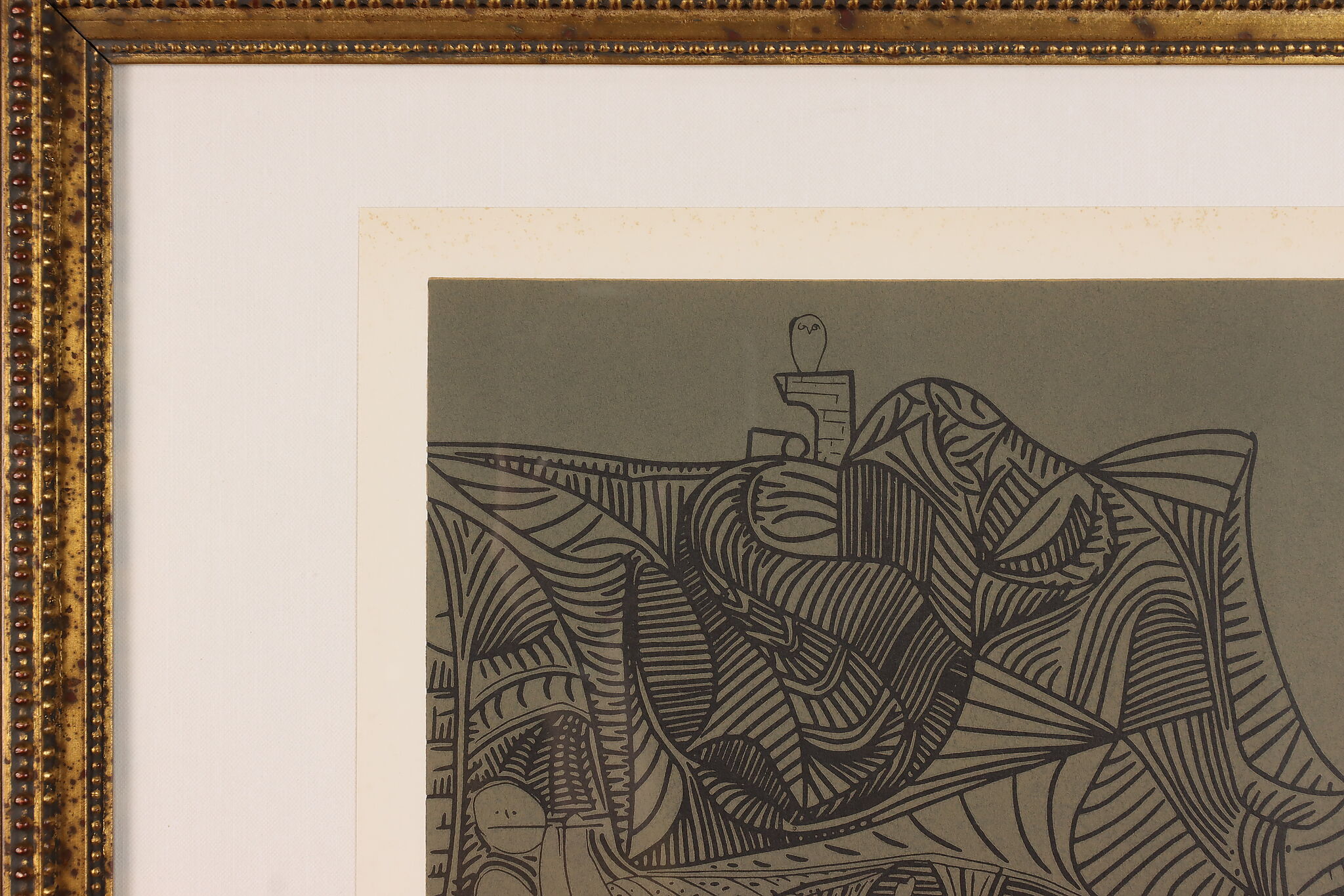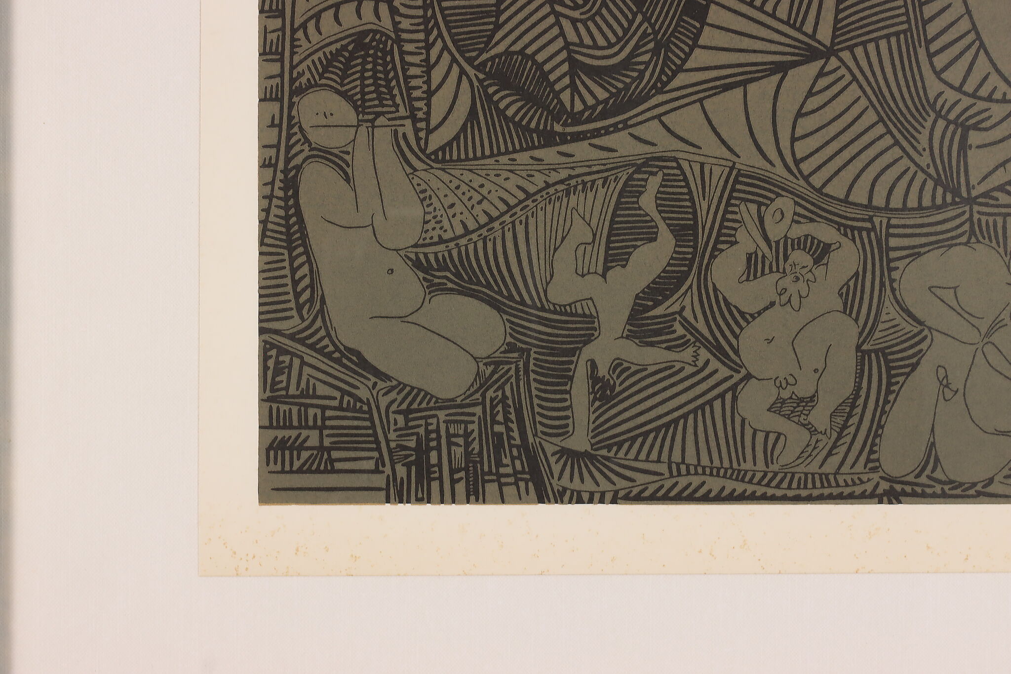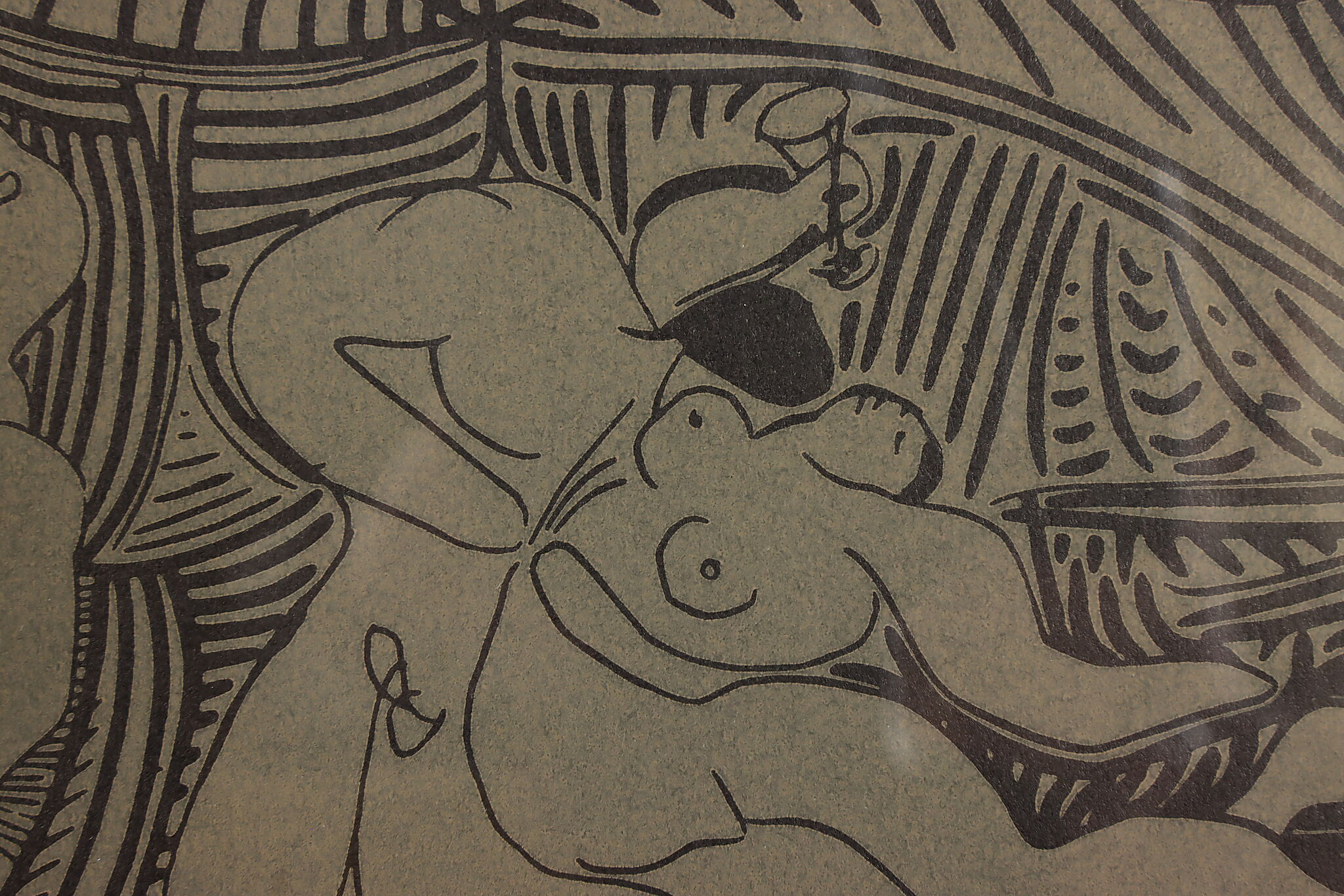 Spanish artist, Pablo Picasso, was known for his abstract, modern art that can be interpreted many ways. This print, titled "Bacchanal w/ Lovers & Owl", appears to be of a wild party with a wise owl watching from the distance.