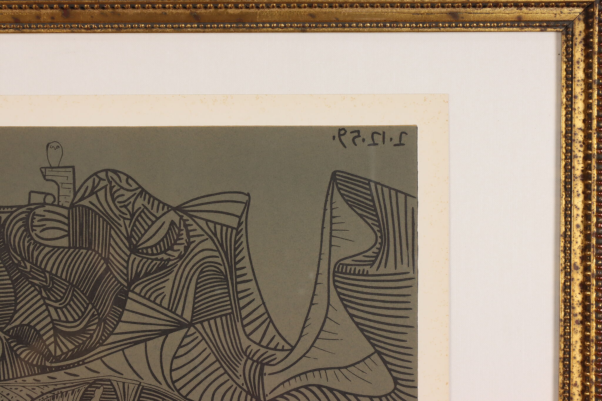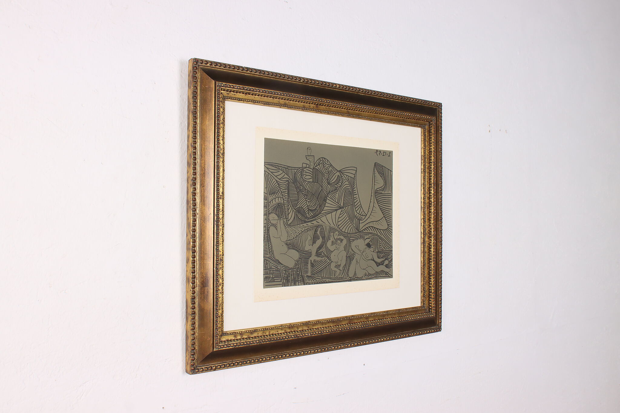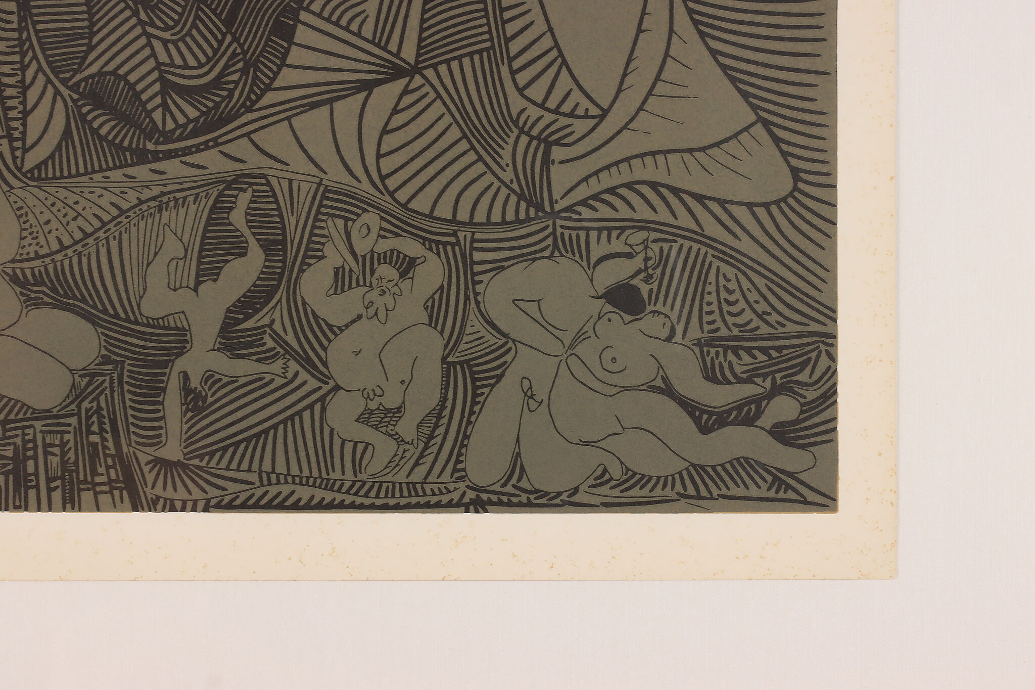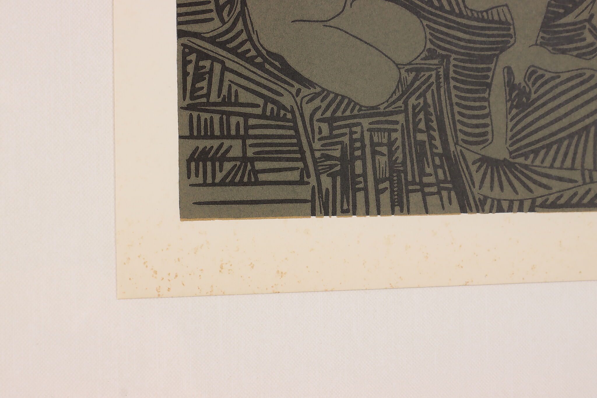 Spanish artist, Pablo Picasso, was known for his abstract, modern art that can be interpreted many ways. This print, titled "Bacchanal w/ Lovers & Owl", appears to be of a wild party with a wise owl watching from the distance.