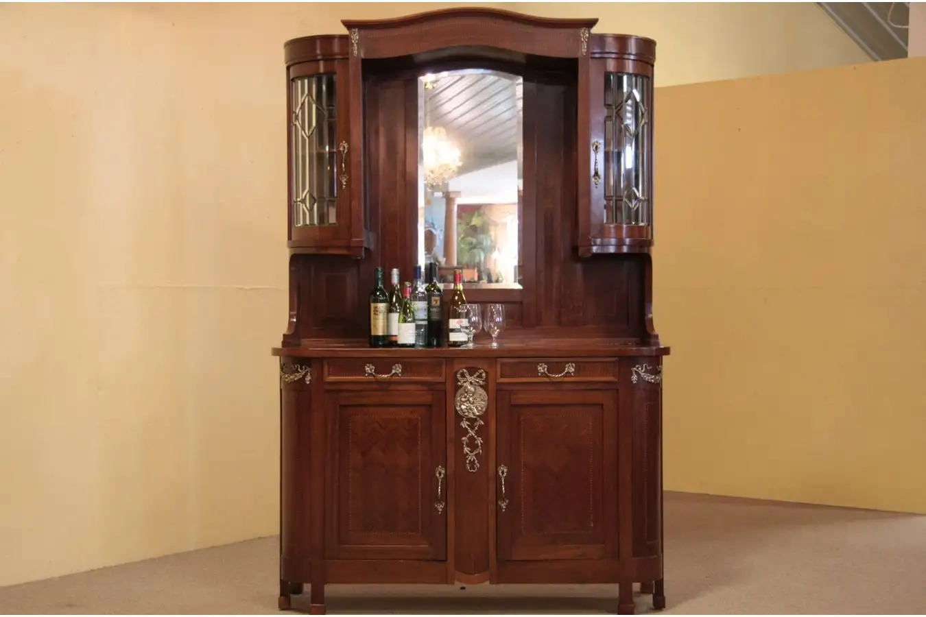 The lustrous finish on walnut is superb, the embossed original hardware is complete from the 1920's. We see no broken panes of beveled glass but there are a few tiny chips at the edges. There is inlaid banding, and a few mars at the edges. Lower doors have in intricate herringbone pattern inlaid marquetry, drawers have handcut dovetails.