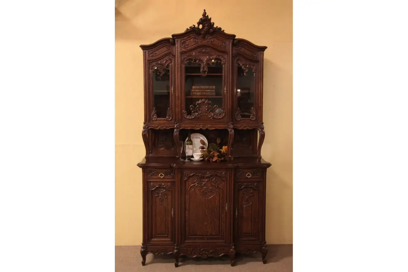 Masterfully hand carved in France, sides and doors have raised panels. The arched center section has shelves adjustable on wooden supports. A dramatic crest shows artistic asymmetrical rococco influence.
