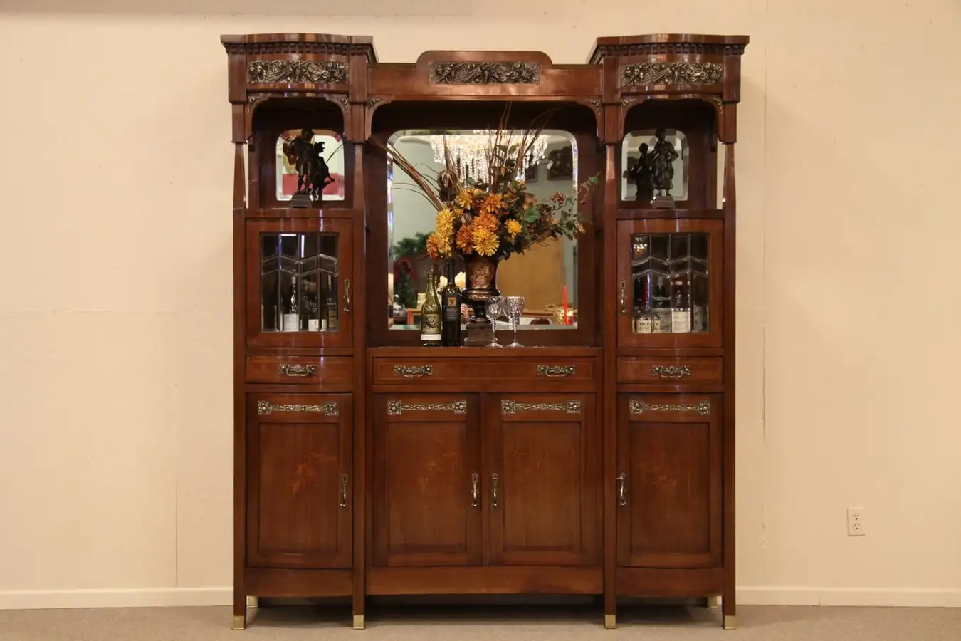 Hardware, feet and mounts are all cast bronze on this spectacular antique from about 1900. The black marble top is excellent, and we see only a few small chips to the curved and beveled glass doors - see photos. Drawers have hand cut dovetails, and there are mars and chips at the outer edges - see photos.